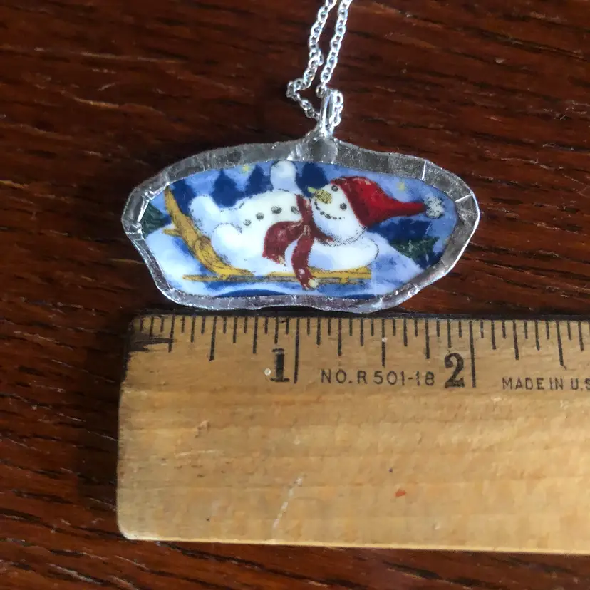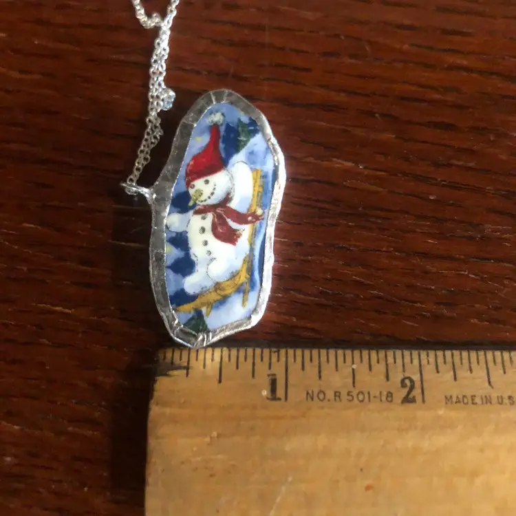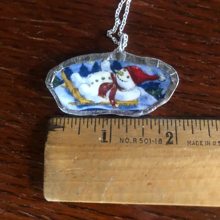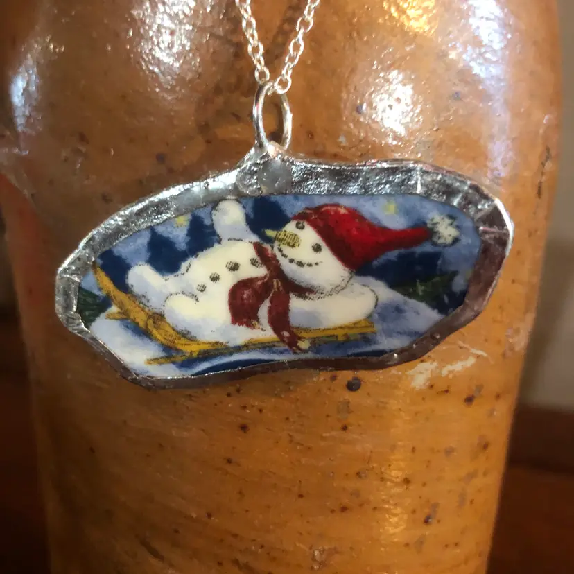 Celebrate winter whimsy with this charming handcrafted pendant featuring a cheerful snowman mid-sled adventure. Each piece is uniquely created from a broken plate, making it a one-of-a-kind wearable art. The petite 1" x 2" design is perfect for layering or standalone wear, bringing a touch of playful nostalgia to any outfit. Ideal for pottery lovers and winter enthusiasts who appreciate handmade character and quirky charm.