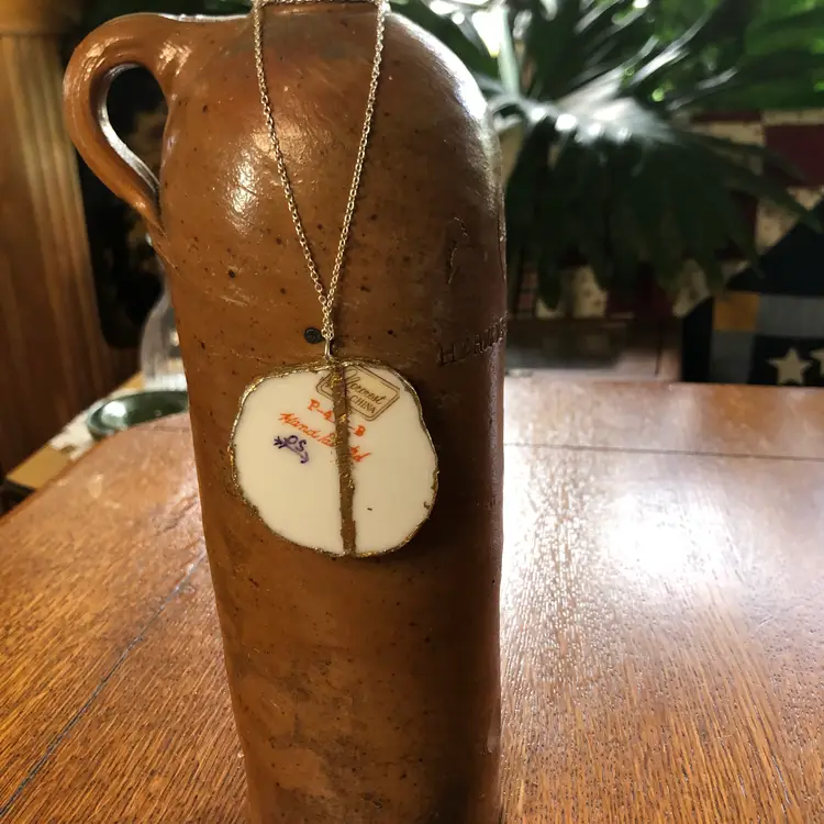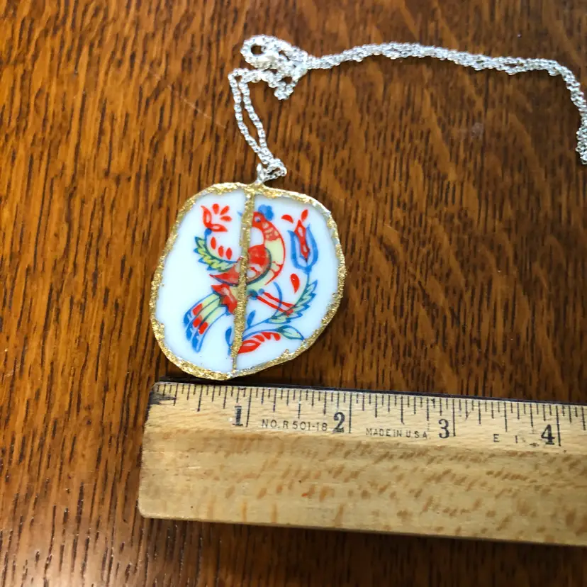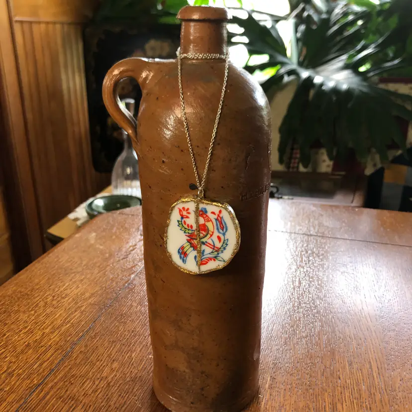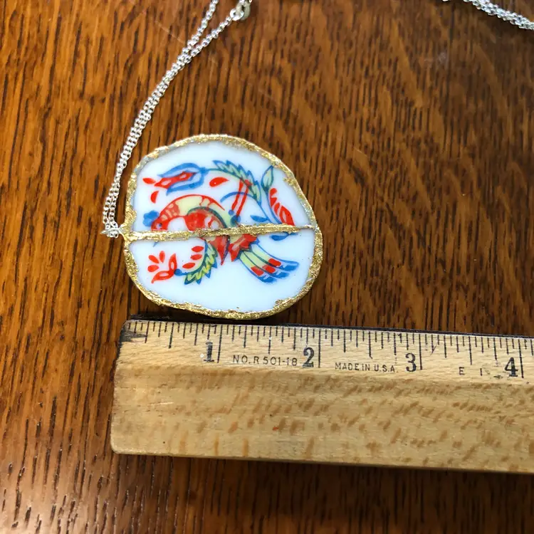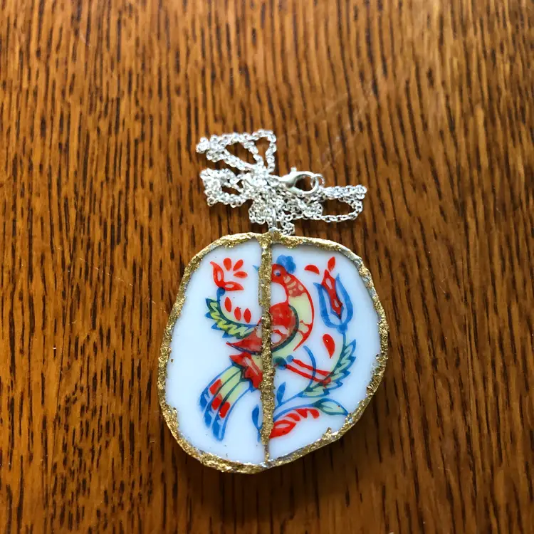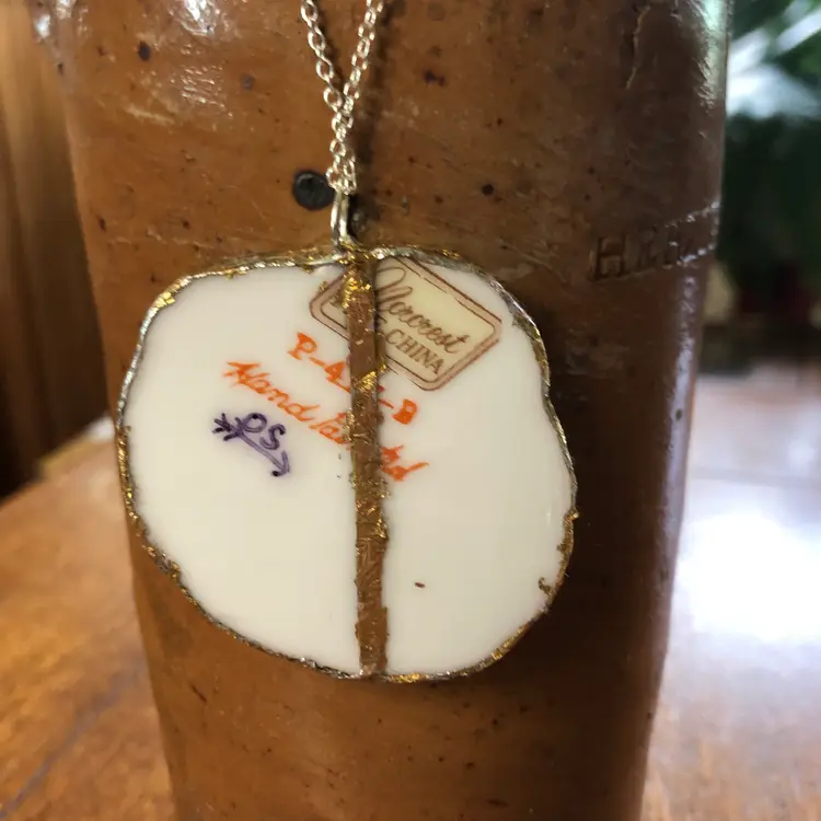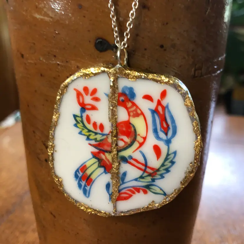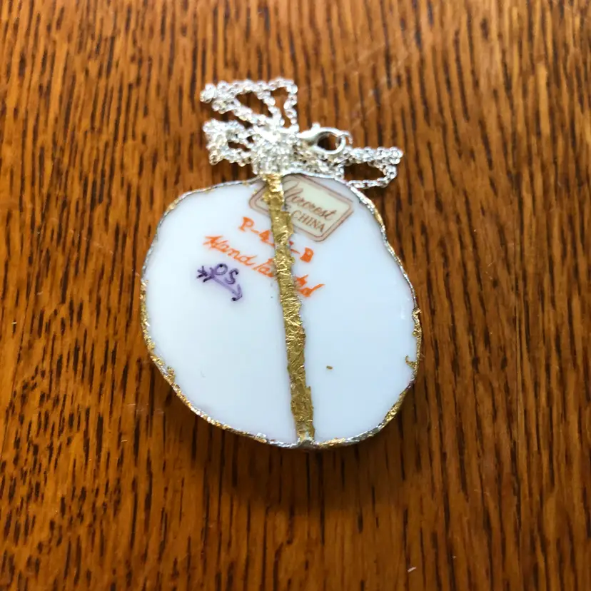 Wear a little piece of art with this Broken Pottery Artisan Pendant! Featuring a hand-painted Norcrest plate fragment, this handcrafted necklace measures 2in by 2in and adds a quirky, creative touch to any outfit. Perfect for those who appreciate unique, playful accessories with a story to tell.