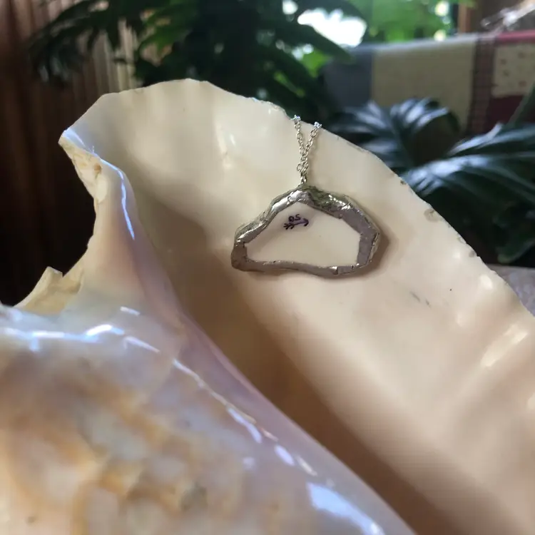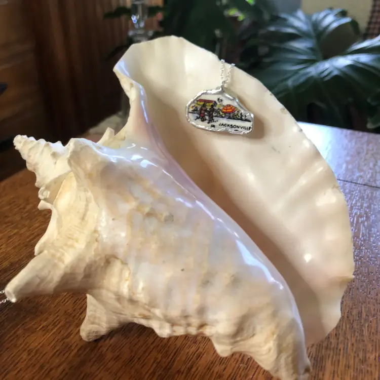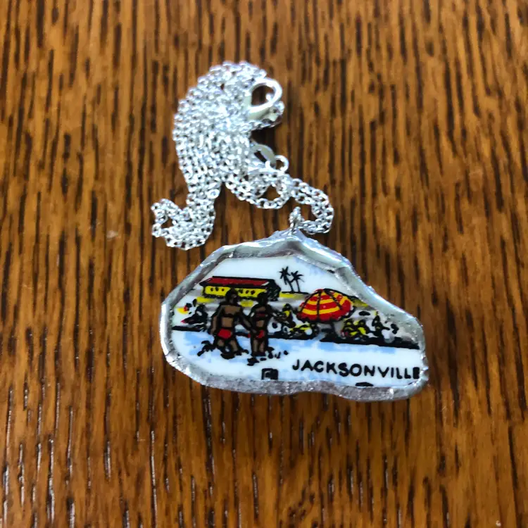 Capture the vibrant essence of Jacksonville with this artisan-crafted pendant necklace made from a broken Florida collectors plates. Measuring 1.5 inches by 1 inch, this unique handcrafted piece brings a sunny, coastal flair to your style. Perfect for adding a touch of handcrafted charm and Florida’s warm spirit to any outfit.