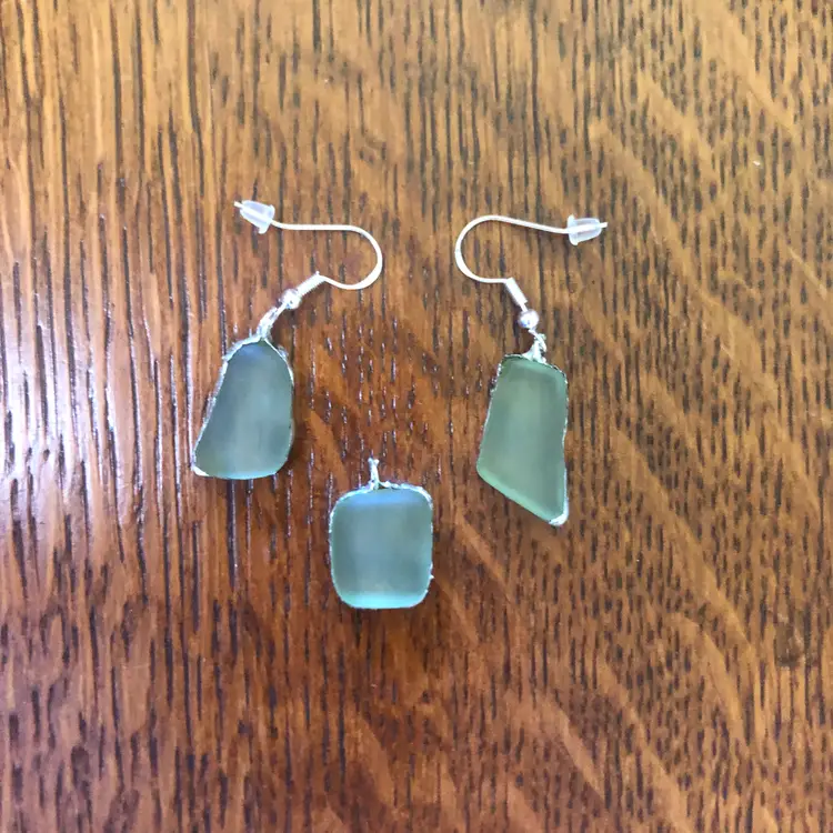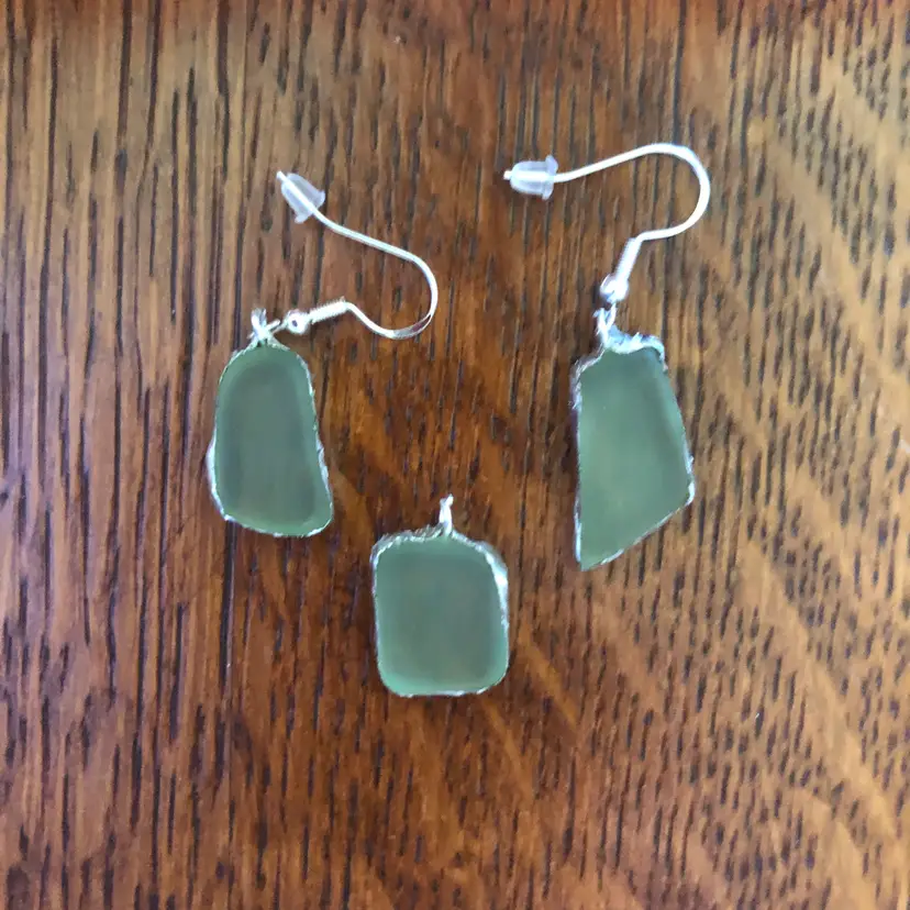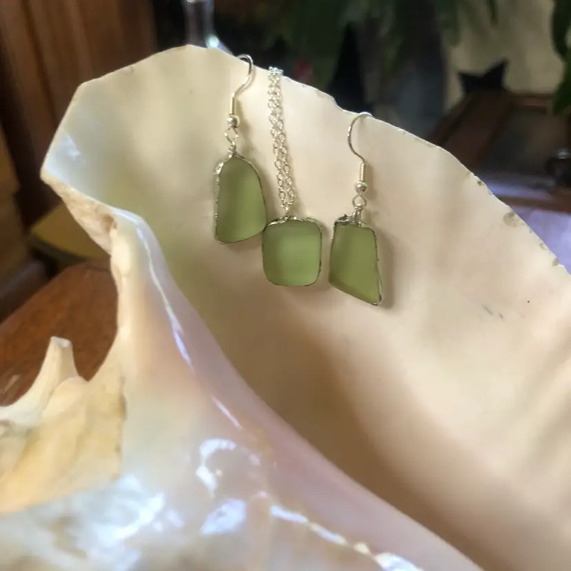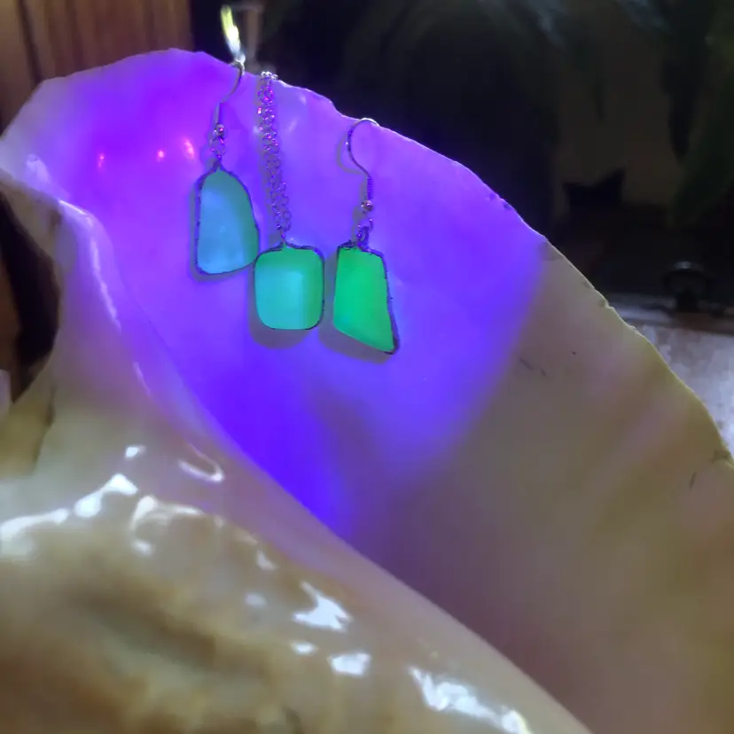 Discover the enchanting allure of this handcrafted jewelry set featuring a pendant and earrings made from green uranium glass. Each piece glows under blacklight with an otherworldly light, capturing the mysterious beauty of this Erie Glass. Perfect for those who seek unique, luminous accessories that whisper secrets in the dark.
