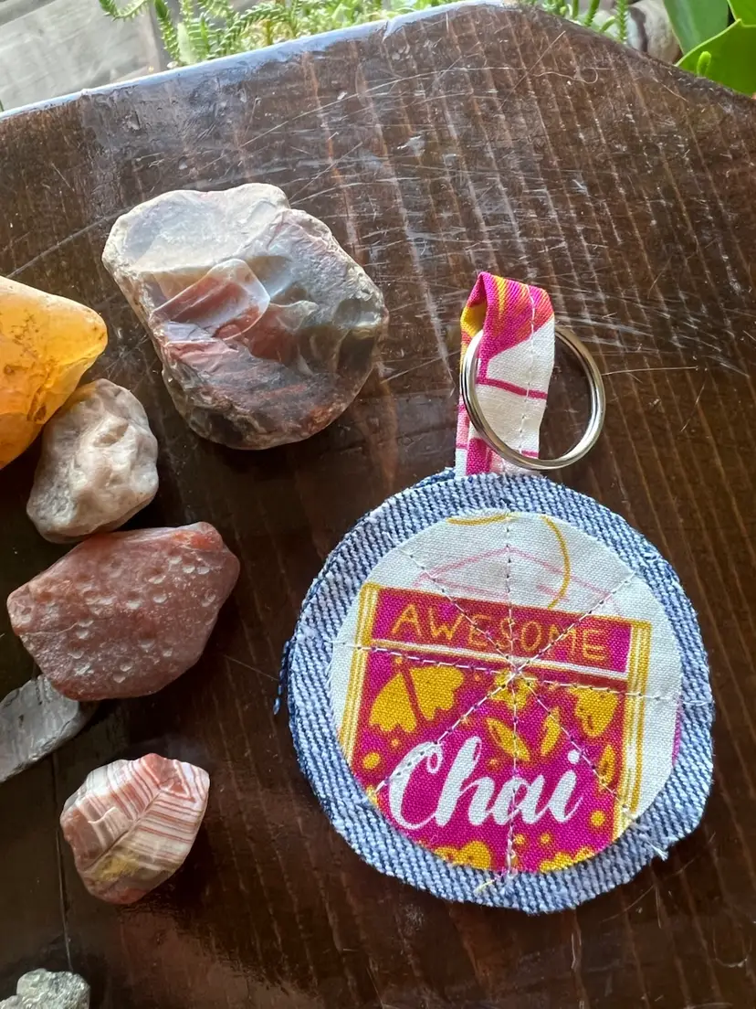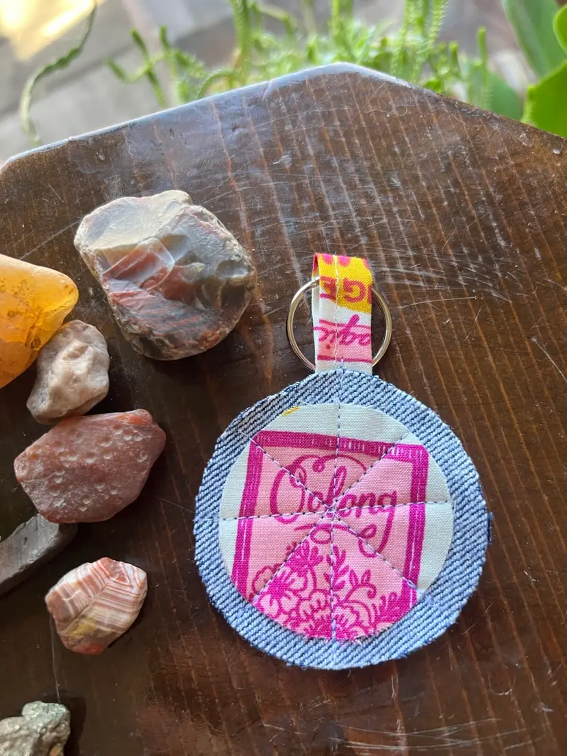 Upcycled denim and scrap fabric made into cute key chain. All profits will be donated to local mutual aid through prismmpls.org. Key chains have been donated by my dear friend Susie (@patchworksusannas IG). Rocks are not included with purchase 😉