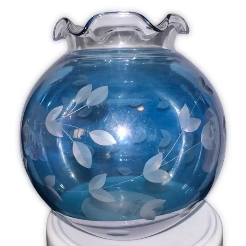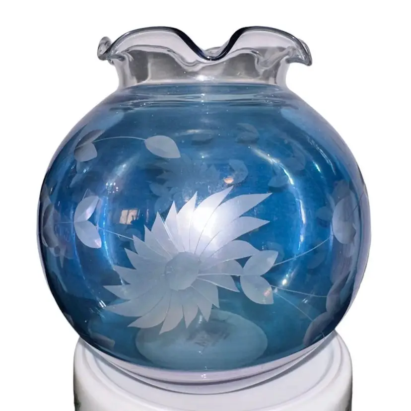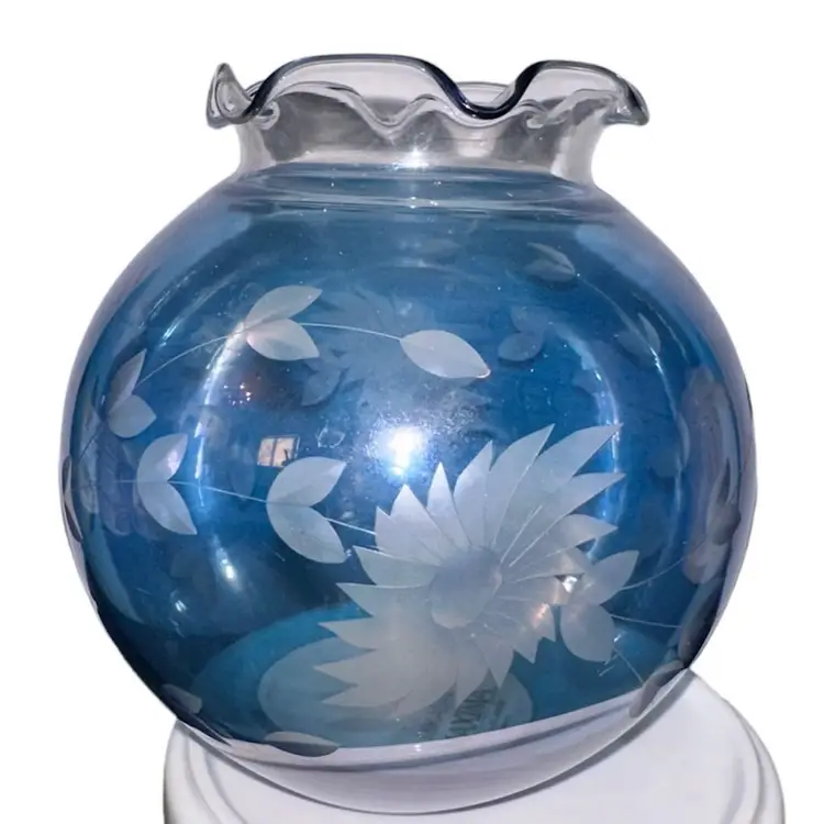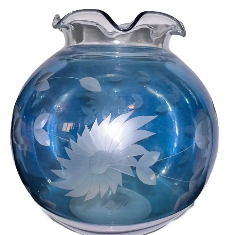 This rose bowl is such a pretty blue! Scalloped edge, measuring 5” tall. Unmarked. Slight iridescence. The blue is a bit lighter than pictures show. Excellent condition - no chips, cracks, or repairs.