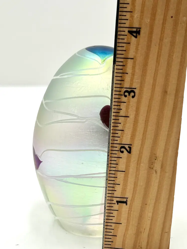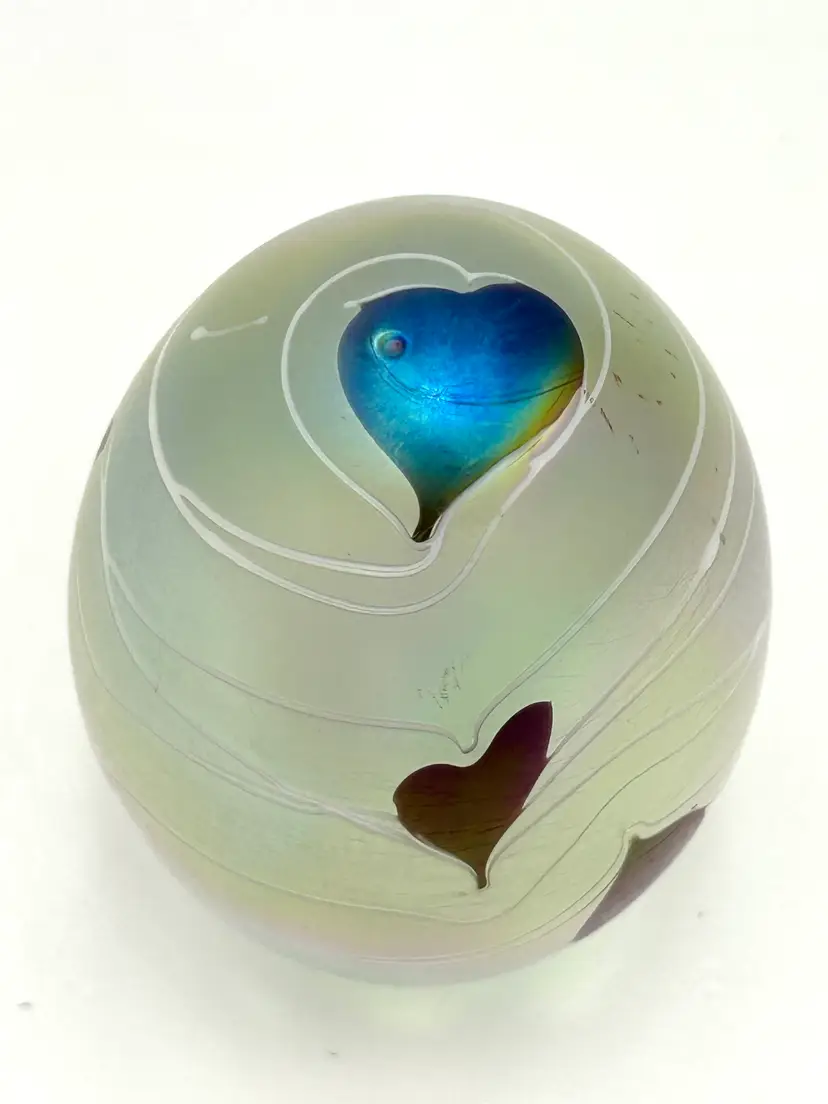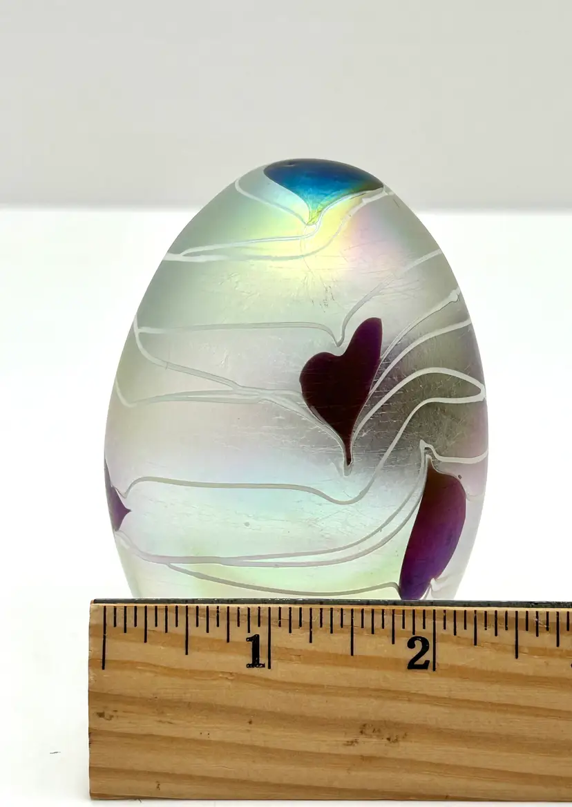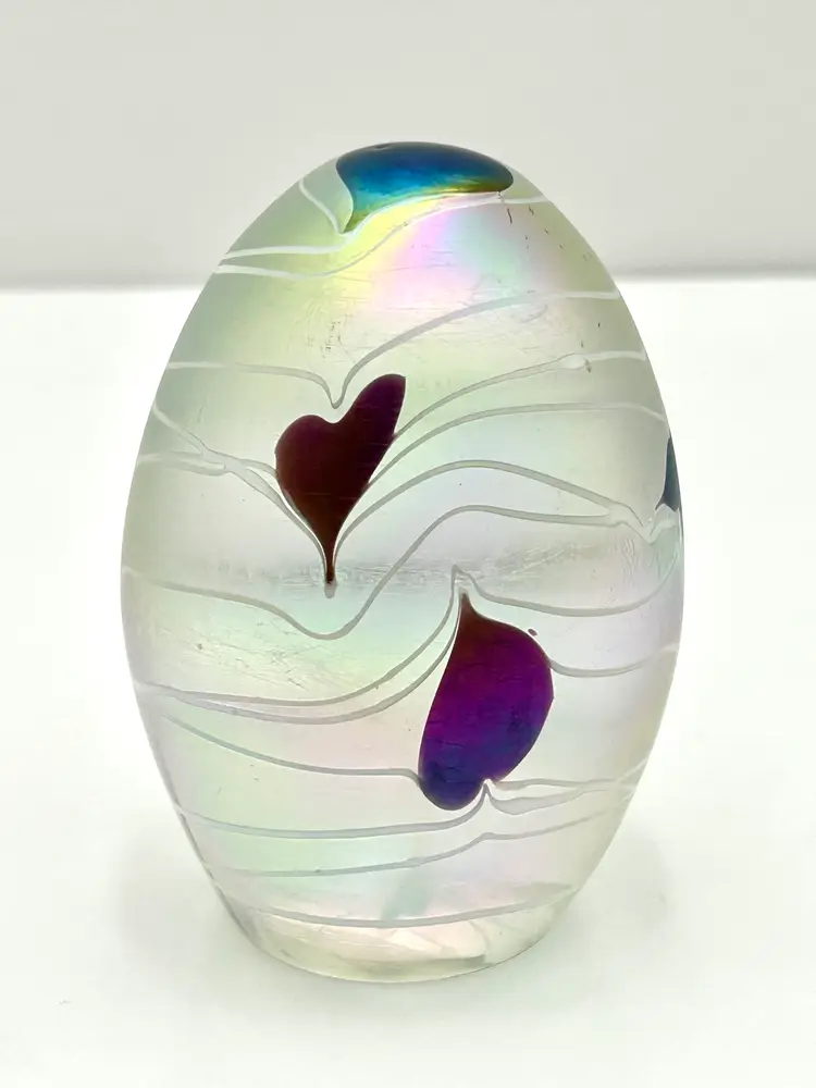 Very pretty iridescent hanging hearts egg shaped paperweight that is not signed on the bottom to indicate a maker. 3.75 inches tall and 2.25 inches wide There are condition issues to be aware of with some scuffing to the finish on top as shown in the images. It also does have a lean to it. There are no chips or cracks.