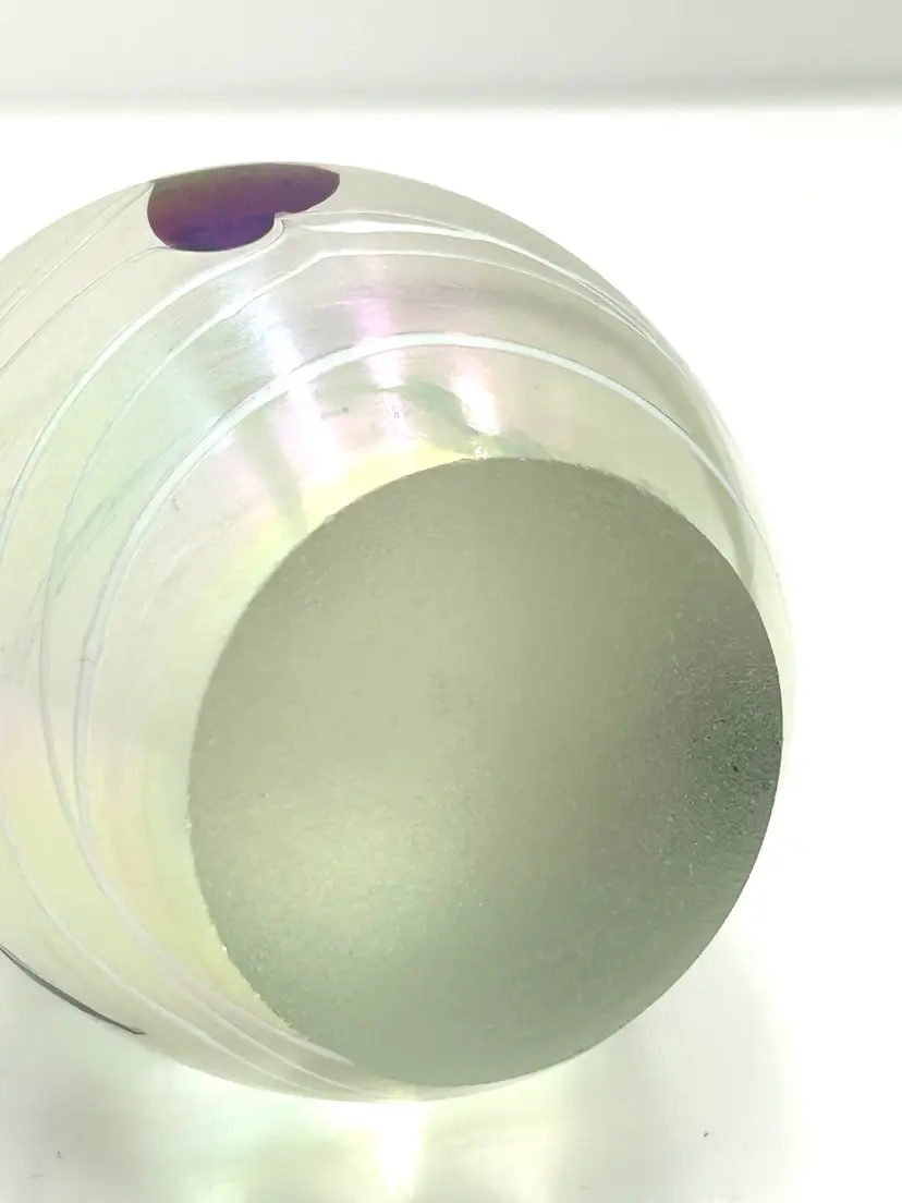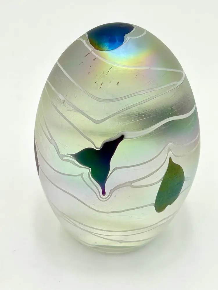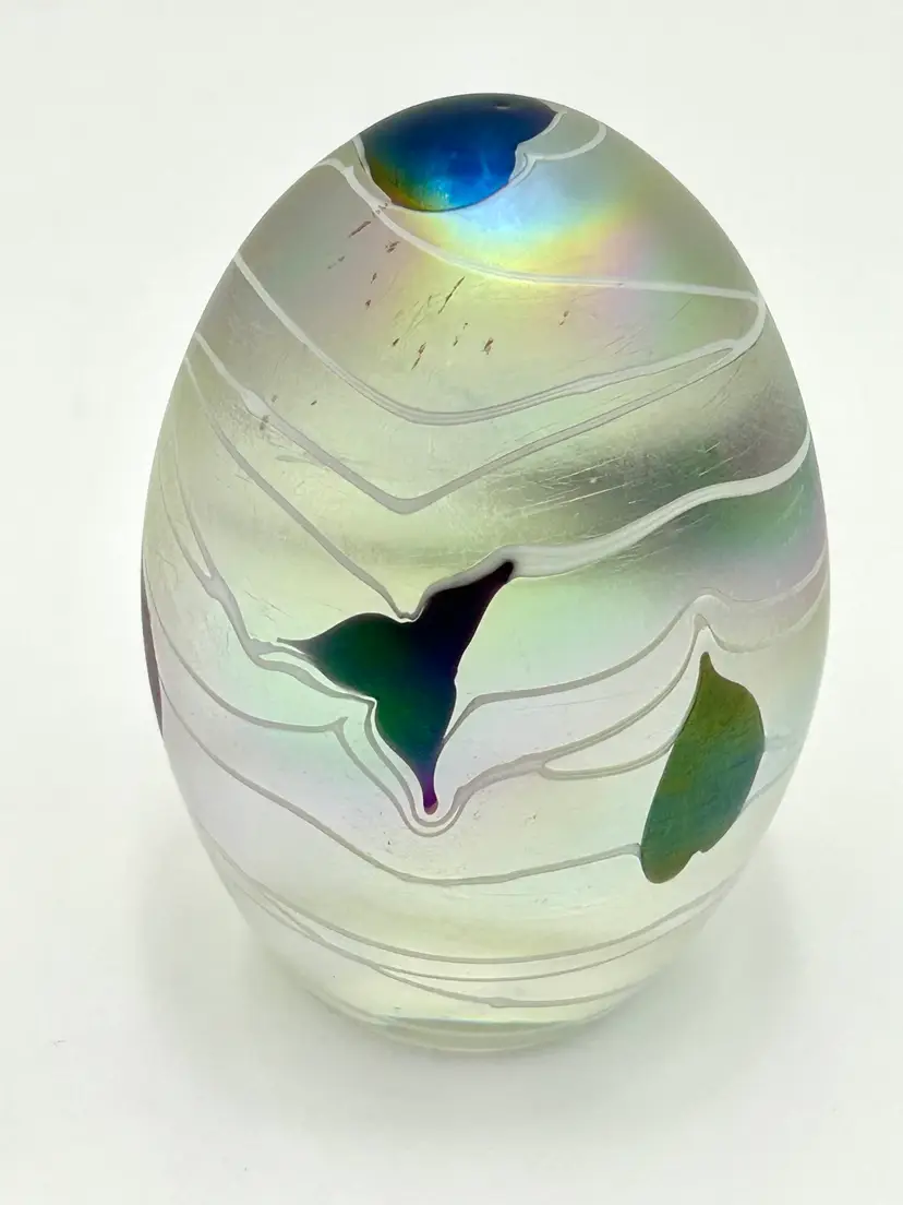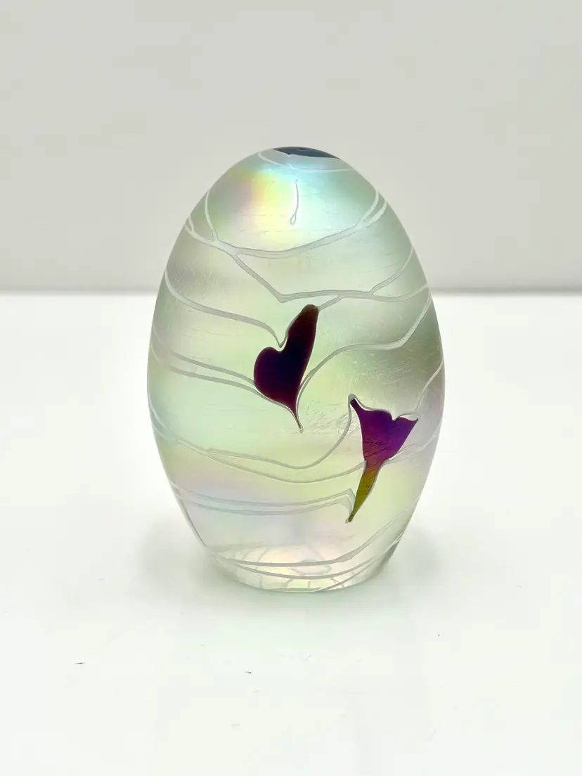 Very pretty iridescent hanging hearts egg shaped paperweight that is not signed on the bottom to indicate a maker. 3.75 inches tall and 2.25 inches wide There are condition issues to be aware of with some scuffing to the finish on top as shown in the images. It also does have a lean to it. There are no chips or cracks.