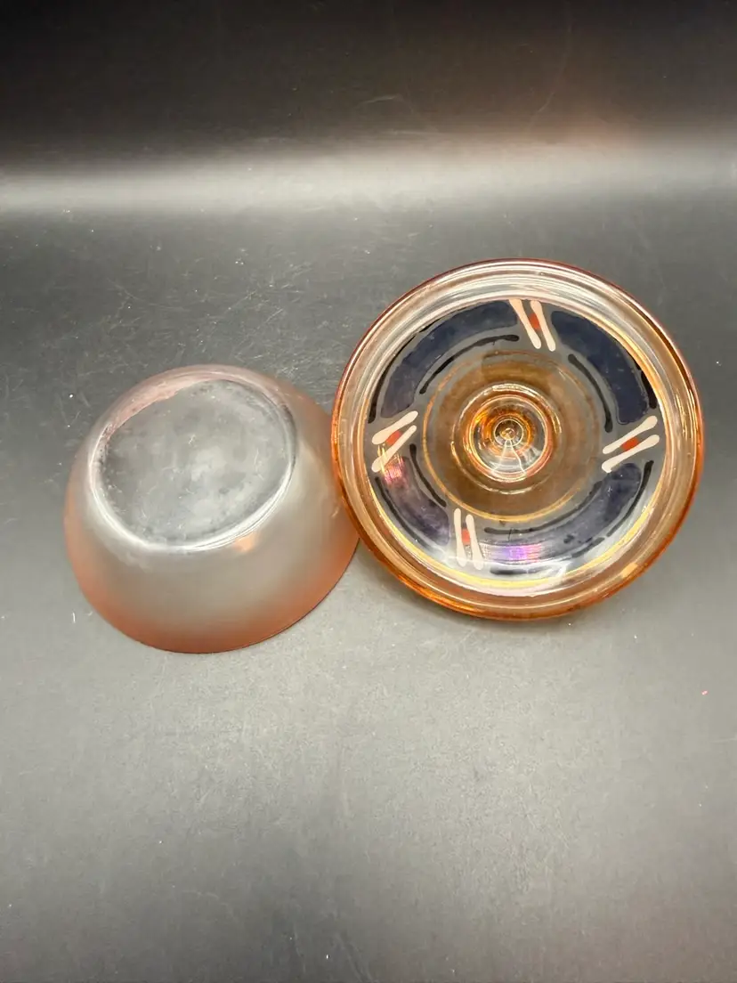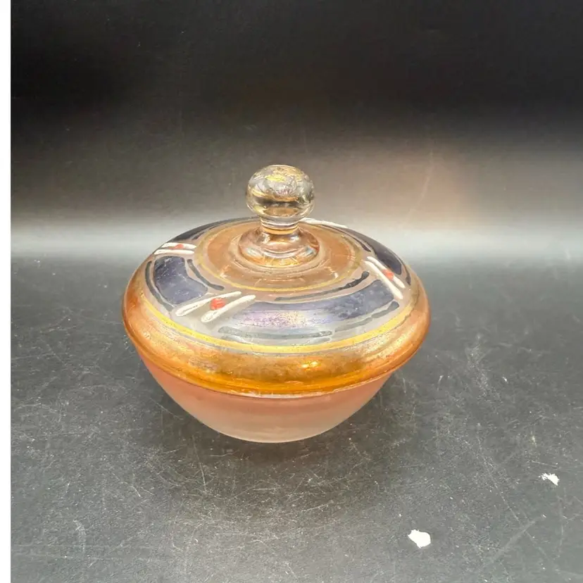 Bohemian glass, originating from the regions of Bohemia and Silesia in the Czech Republic, has a rich history dating back centuries. Bohemian glass highly sought after by collectors worldwide. This particular piece, with its opalescent pink glass and metallic gold decoration, likely dates to the mid-20th century, possibly influenced by Art Deco or mid-century modern aesthetics. Such decorative glass items were popular for use as vanity jars, small candy dishes, or trinket holders, adding a touch of elegance to domestic interiors.