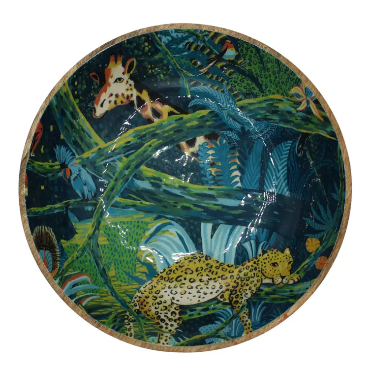 Opalhouse Mango Wood Decorative Serving Bowl featuring a colorful Jungle Theme with Cheetah and Giraffe Resin Interior Rich colors of blues, greens, golds Marked OPALHOUSE Made in India