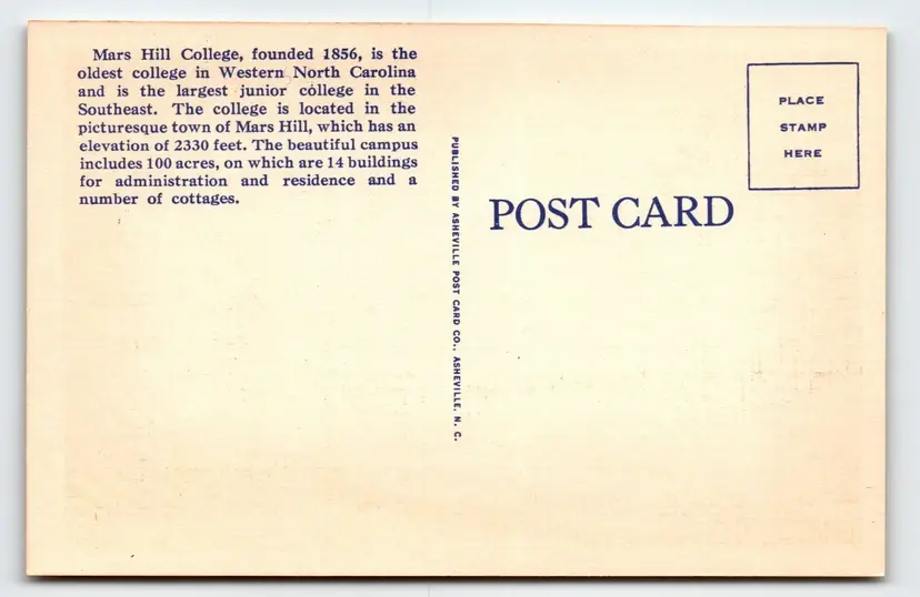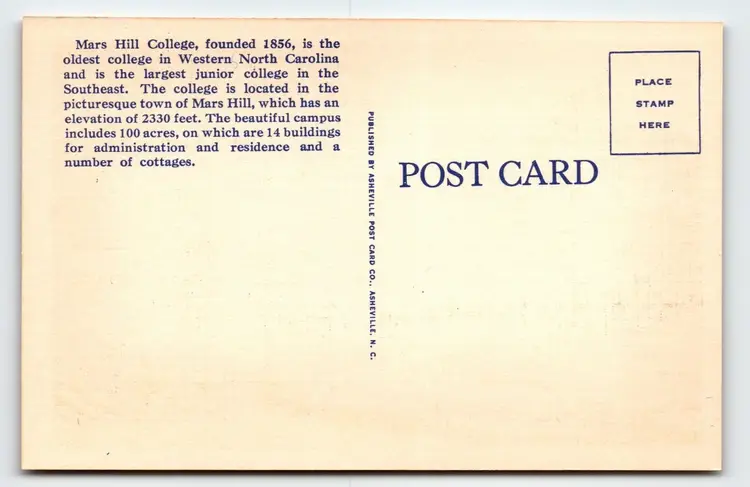 Number of Items in Set: 1 Unit of Sale: Single Unit Artist: Unknown Occasion: Sayings & Quotes Size: Standard (5.5 x 3.5 in) Signed: No Custom Bundle: No Year Manufactured: 1940 Material: Paper City: Mars Hill Original/Licensed Reprint: Original Franchise: Does Not Apply Brand/Publisher: Asheville Subject: Buildings Continent: North America Type: Linen Postcard Era: Linen (1930-1945) Region: North Carolina Country: USA Theme: Agriculture, Architecture, Cities & Towns, Community Life, Greetings, Landscapes, Roadside America, Social History, Buildings Features: Divided Back Time Period Manufactured: 1950-1959 Country/Region of Manufacture: United States Postage Condition: Unposted