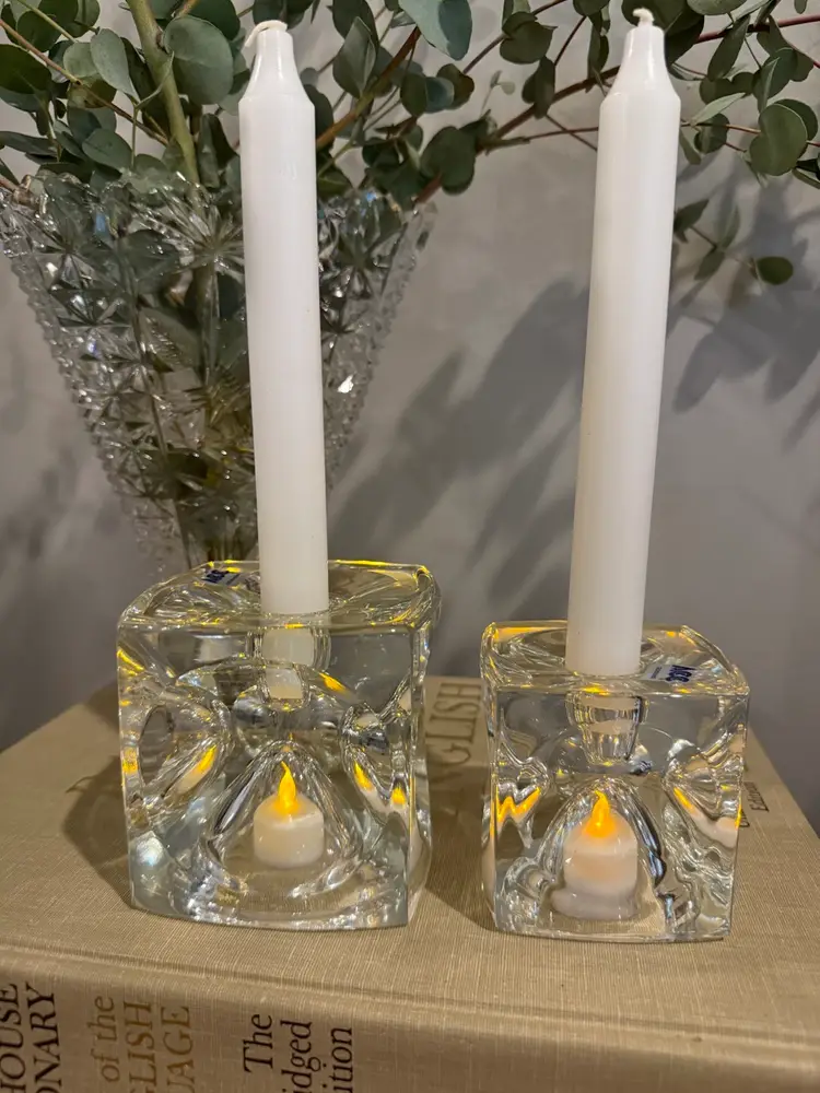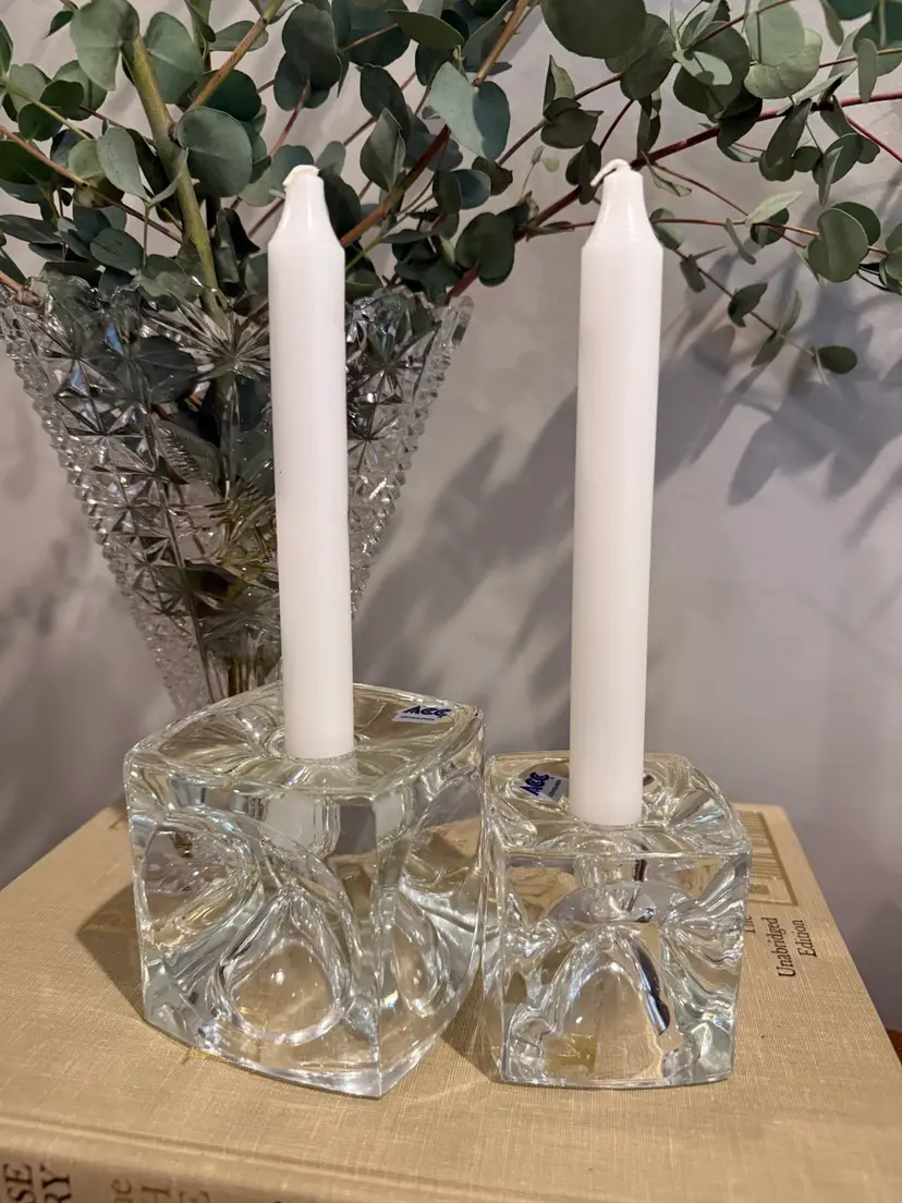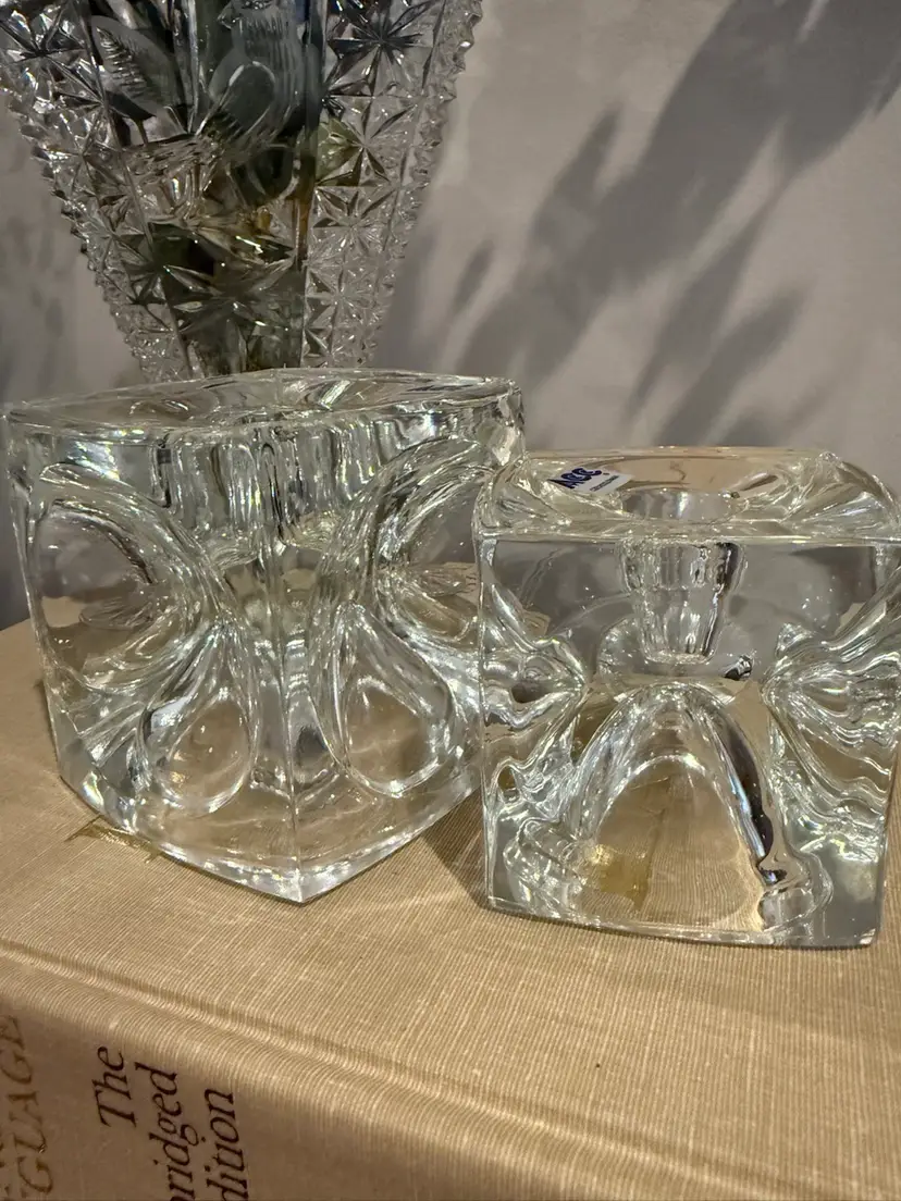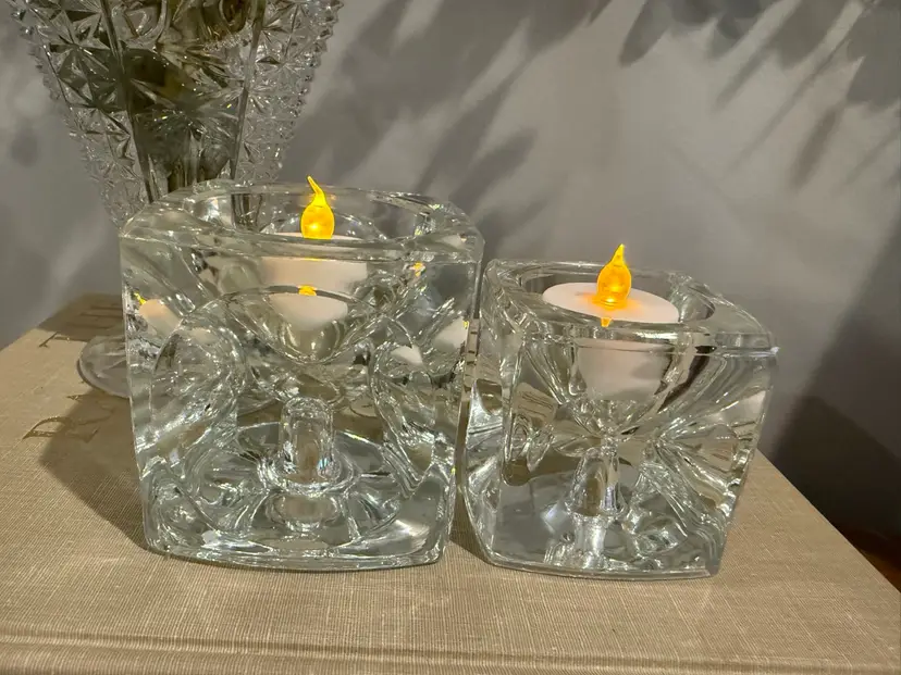 Crafted from heavy, high-quality clear glass, they are designed to hold both taper candles and tea lights, offering versatile decorative options. The set includes two holders of different sizes, adding dynamic visual interest to any space. The larger holder measures approximately 4 inches square, and the smaller one is roughly 3 inches square.