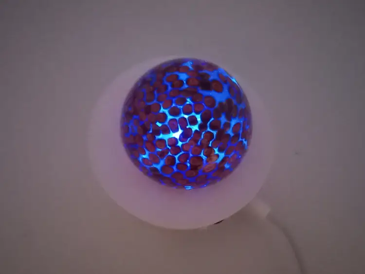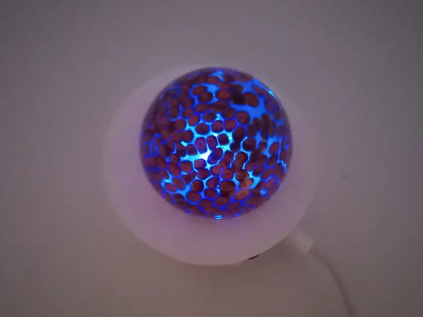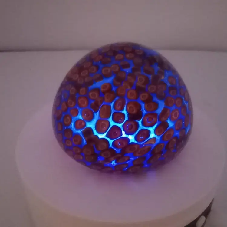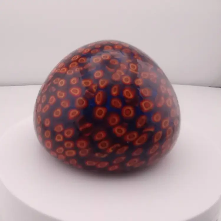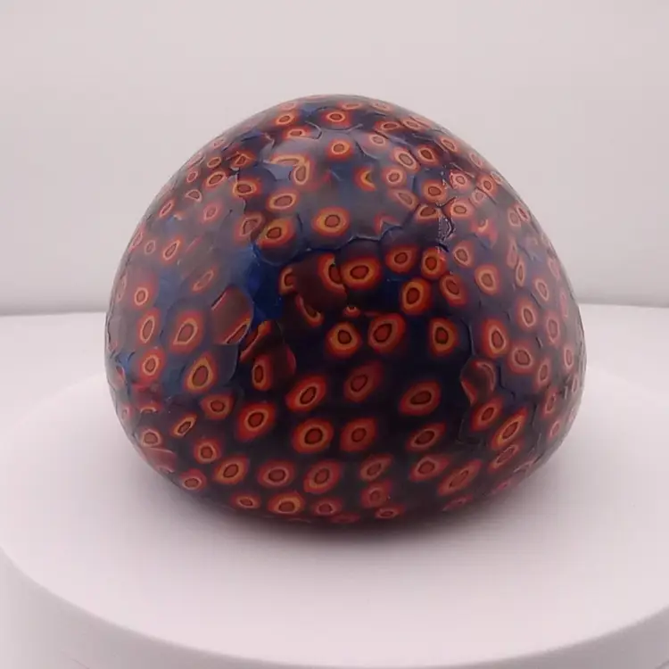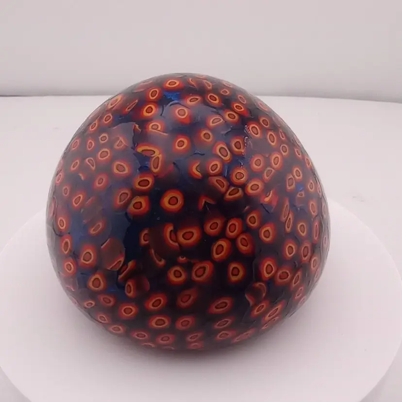 It's a beautiful and unusual paperweight with orange millefiori canes on a dark cobalt blue background. It's in excellent condition with no noted flaws. Maker unknown