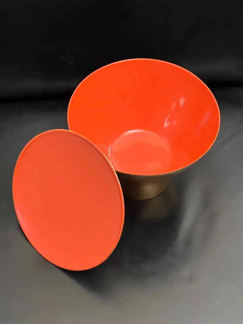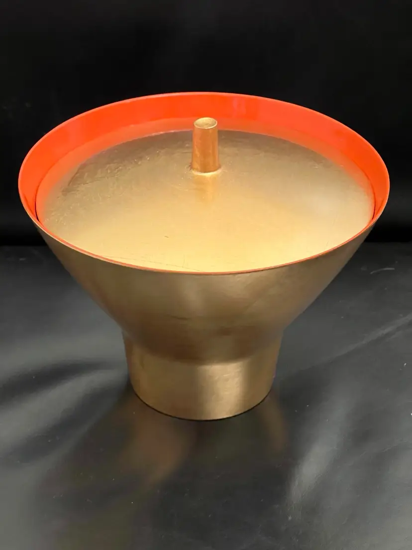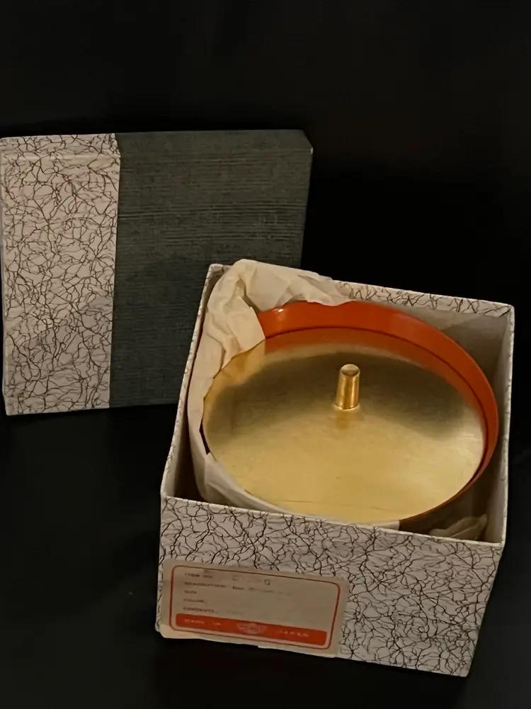 Stunning MCM atomic made in Japan lacquered serving bowl in orange and gold leaf. Comes in original box. Vintage Gold Leaf Lacquered 1960’s Lidded Atomic Cone Shaped Gold Lacquer Serving Dish Hollywood Regency style.