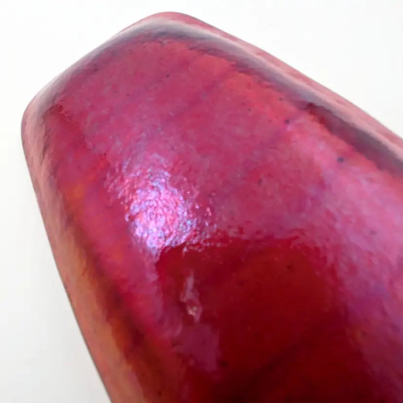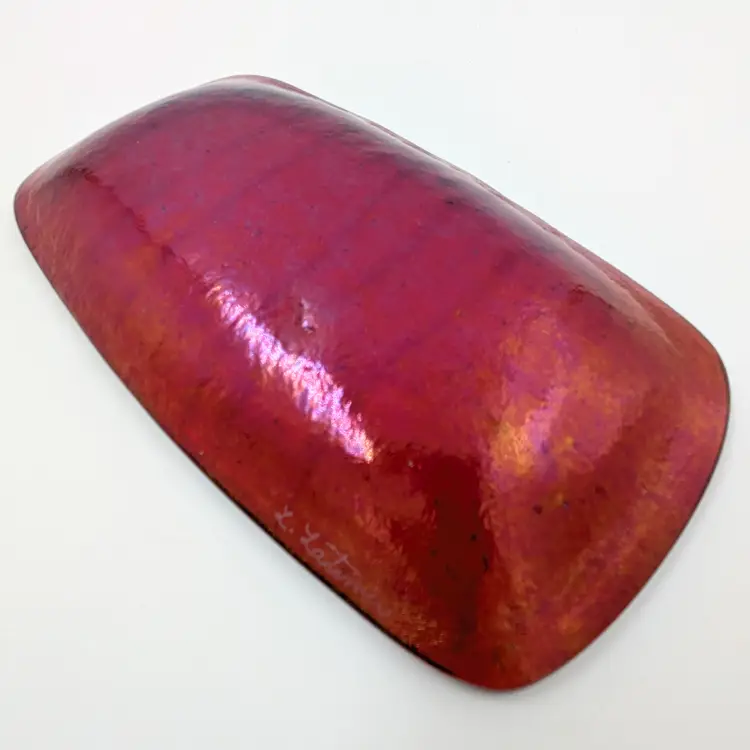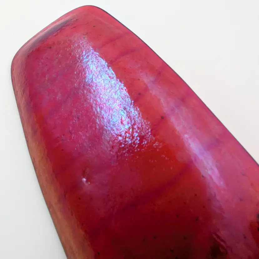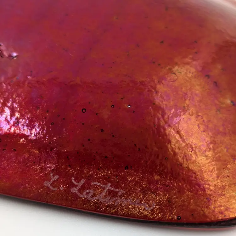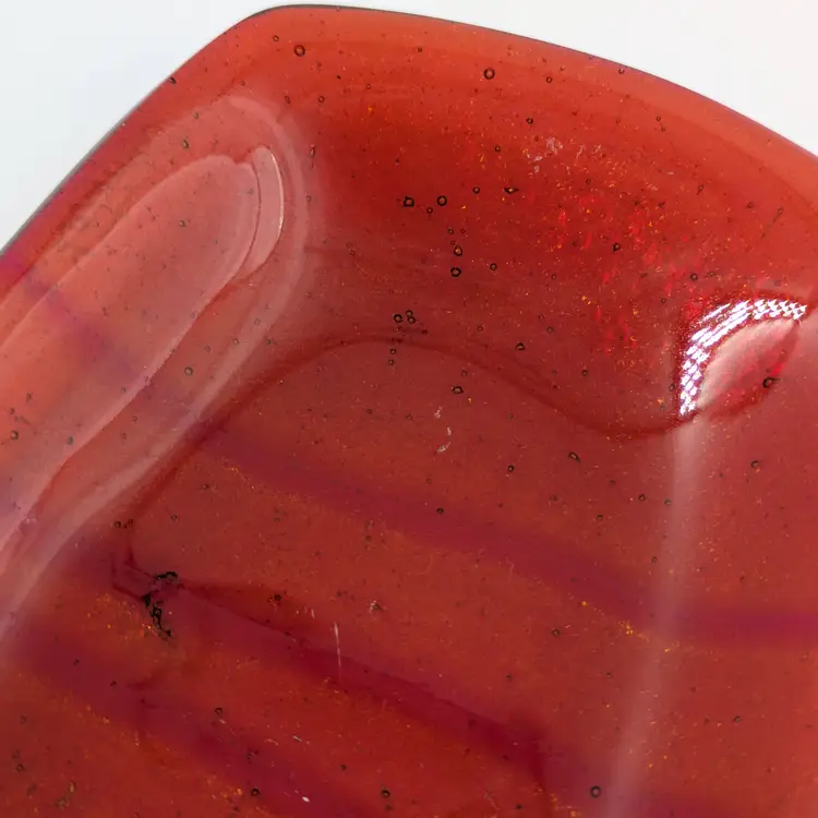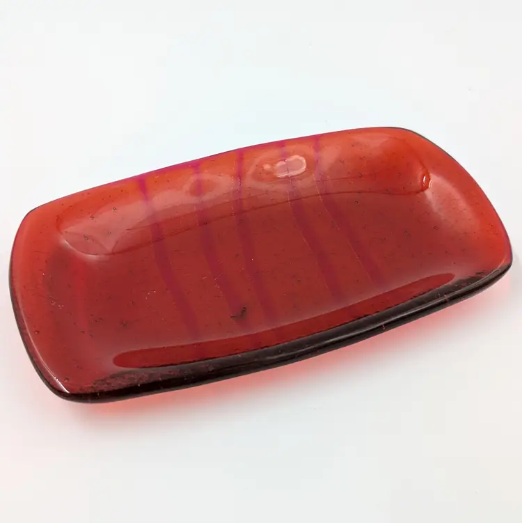 Beautiful orange glass fused glass trinket tray by Massachusetts artist Lynne Latimer of Latimer Glass Studio. Red stripes with a red/purple/blue dichroic effect on the back. There are some light scratches on the front (pictured) The back has a little dimple in the glass.