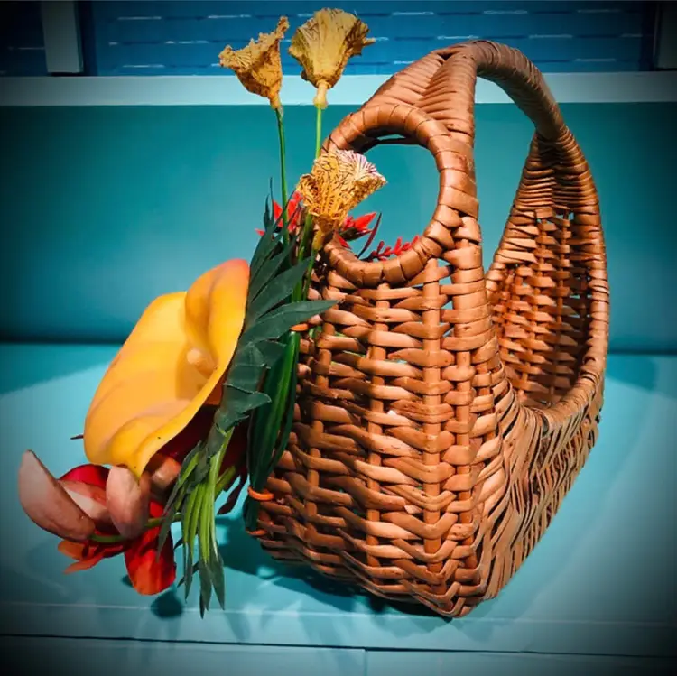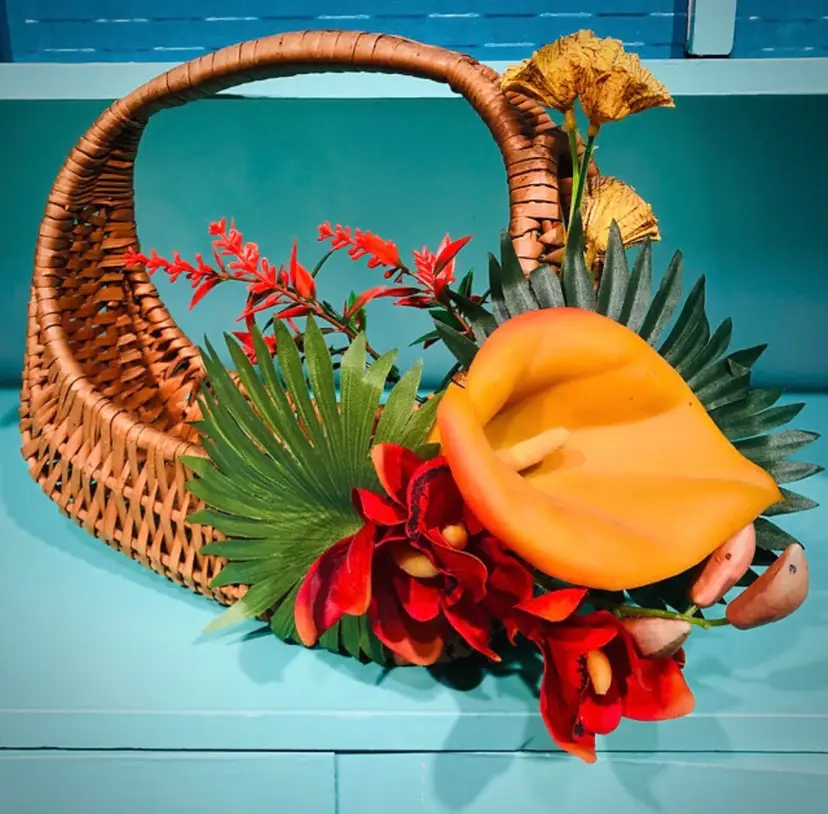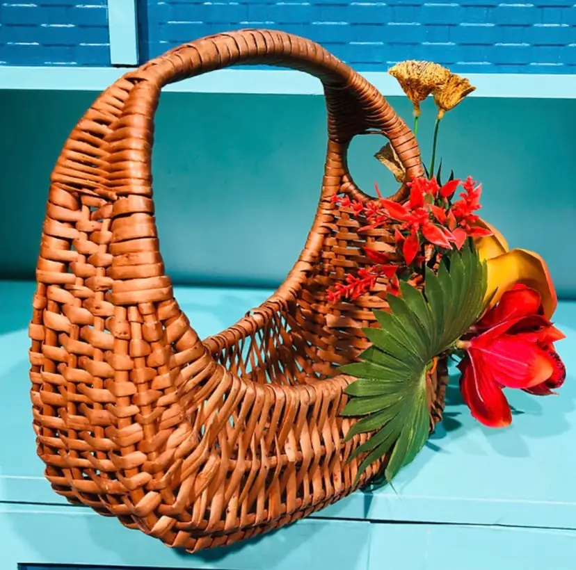 Vintage 1960’s era basket custom one of a kind conversion to purse. Vintage tropical florals in Orange calla lilly, lush green fronds and bright red orange orchids and other accent tropical faux florals.