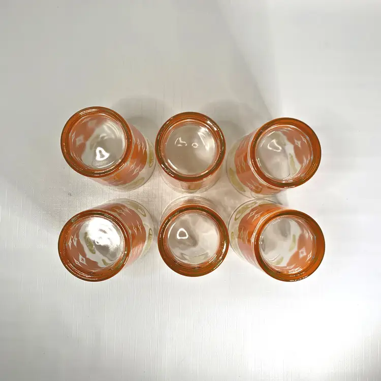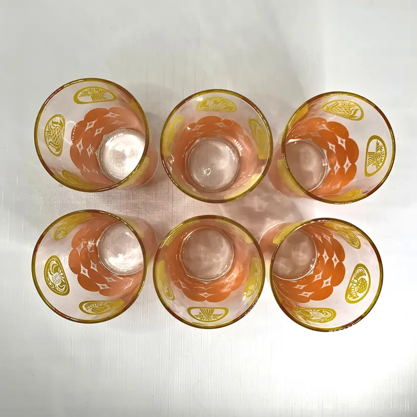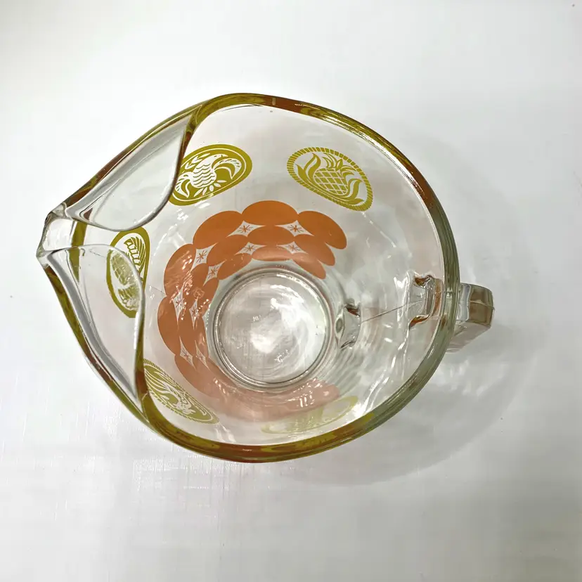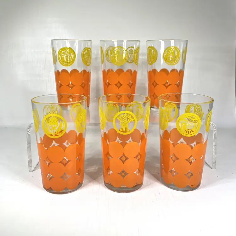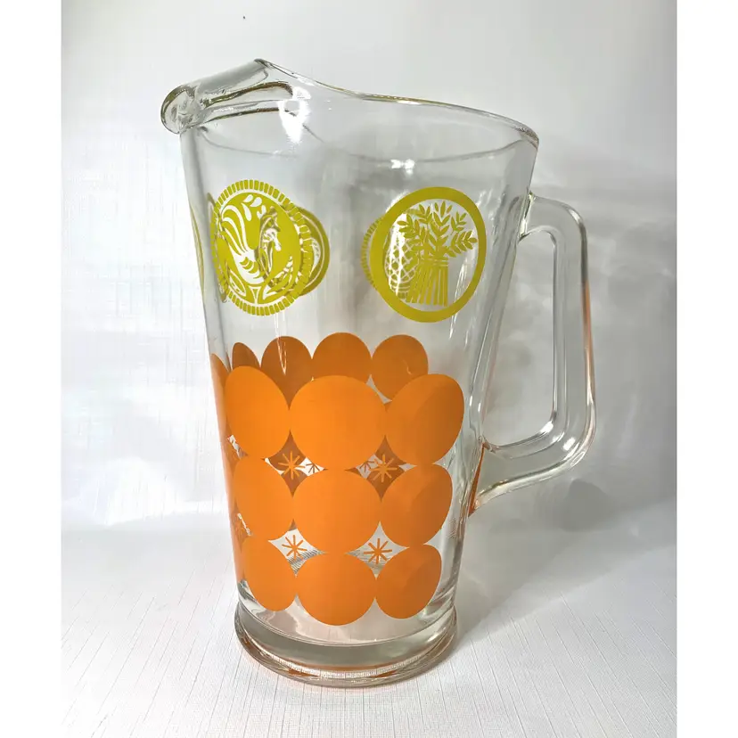 Each tumbler measure approx. 3 x 5 inches tall, pitcher is 10” tall x 6” in diameter at the top.