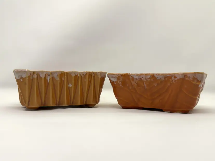 This matched set of McCoy and Shawnee planters brings warm, mid-century style to any space. Both feature orange drip glaze with white edges, rectangular footed bases, and classic 1950s–1970s American pottery design.