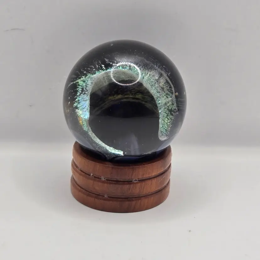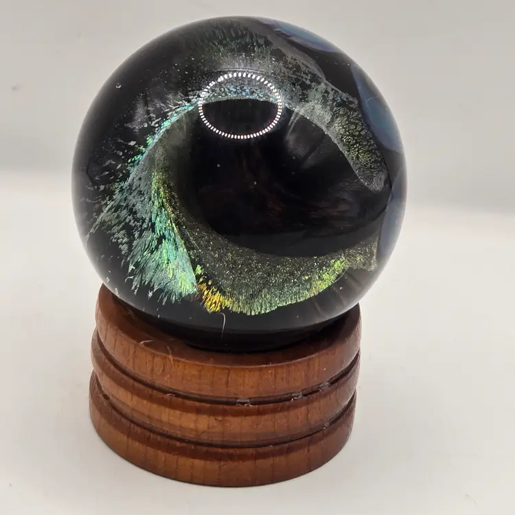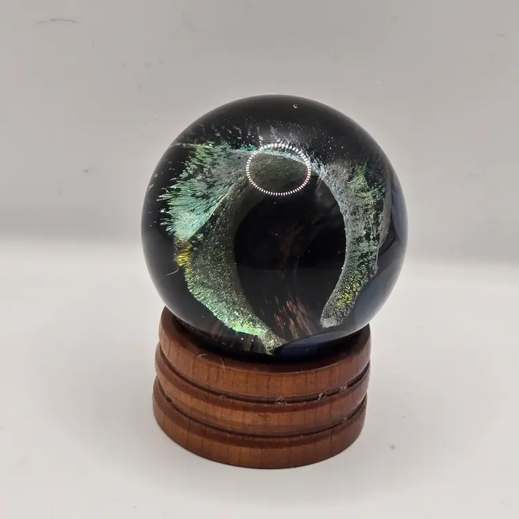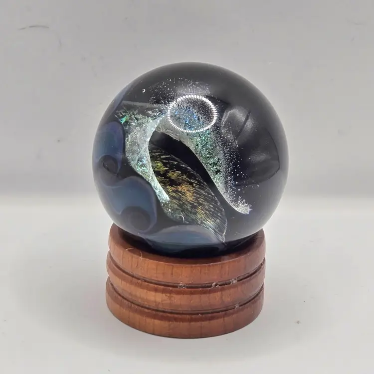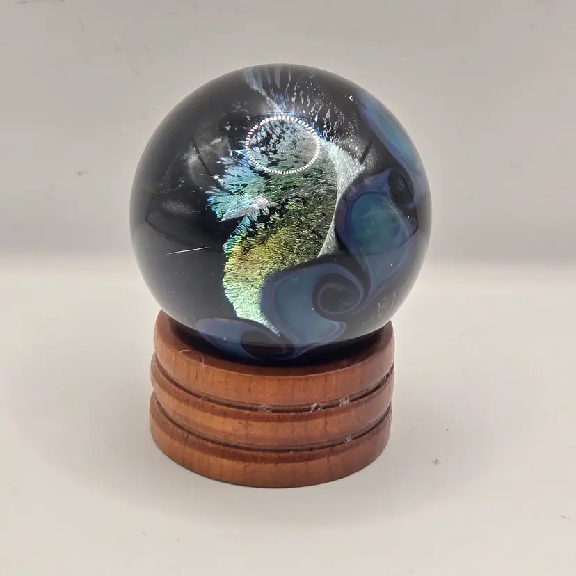 Orb Paperweight Nebula/Galaxy by Canadian Artist Brad Jesson. comes with stand. 2"- 2.75" on stand. No chips,cracks or bruises. 2 small dimples at back most likely from glass blowing pontil. Signed BJ on back. Please see photos as they are part of the description. Item will be well wrapped before shipping. Items from my listings can be combined for shipping if safe to do so.
