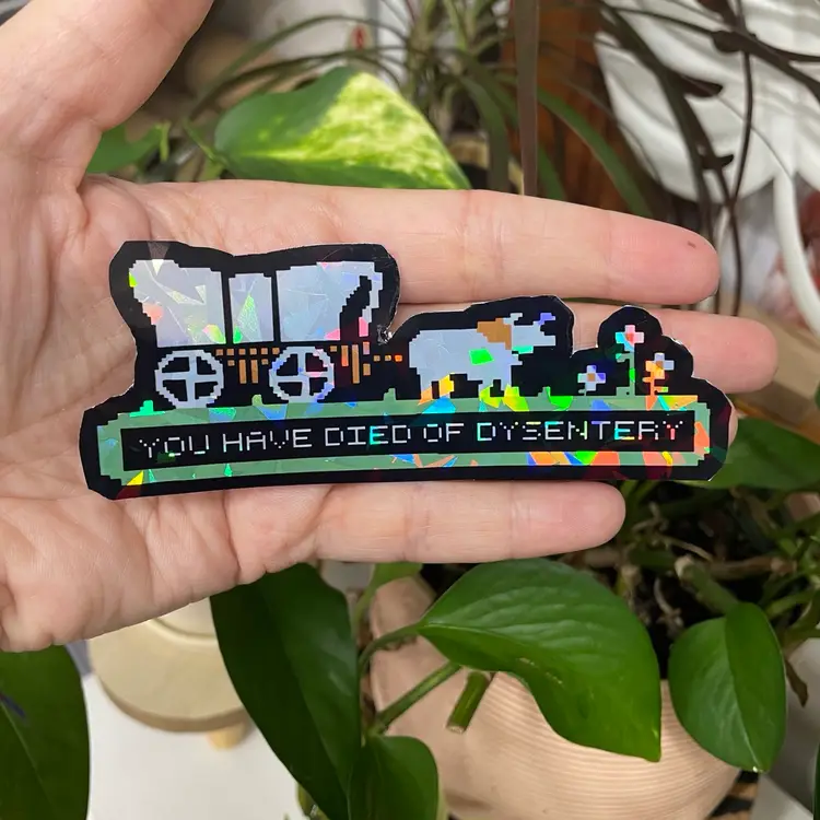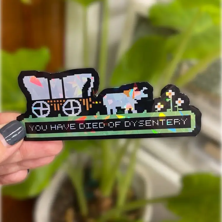 Introducing the 'You Have Died of Dysentery' sticker – a playful homage to the iconic message from the Oregon Trail game. Perfect for those who've conquered digital trails or faced life's unexpected challenges. “Broken glass” Holographic sticker Approximately 4” long Stamp mailed