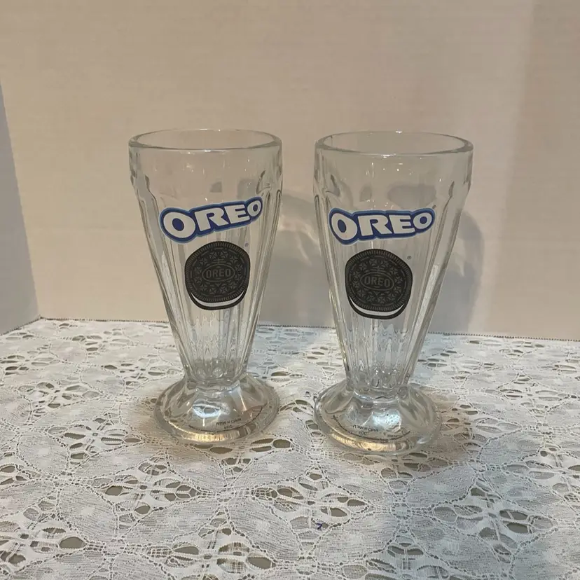 Set of 2 vintage-style Oreo branded milkshake glasses. Perfect for enjoying your favorite milkshake or dessert.