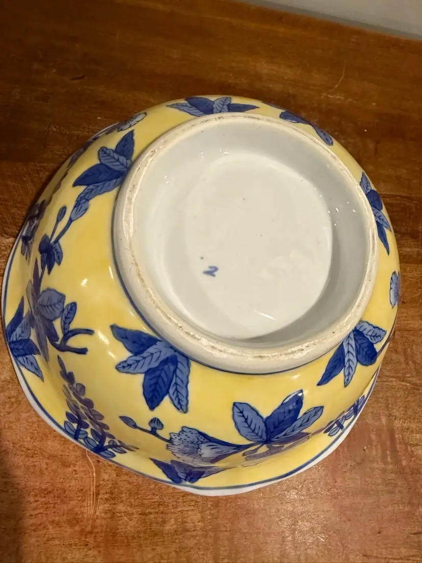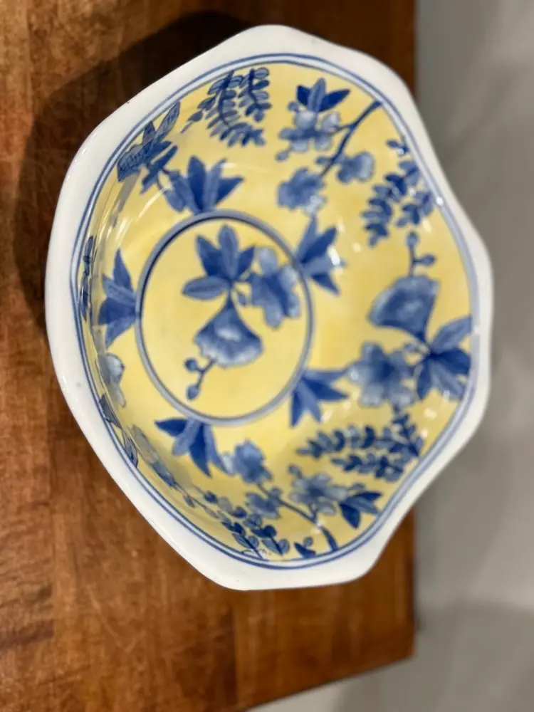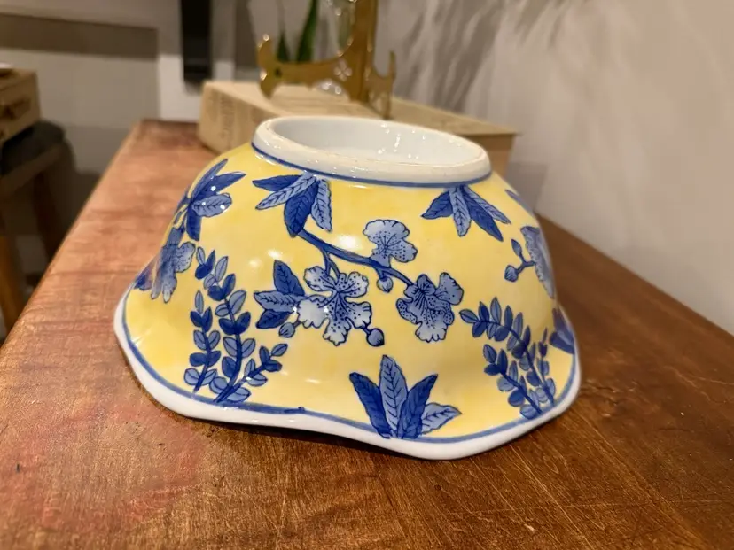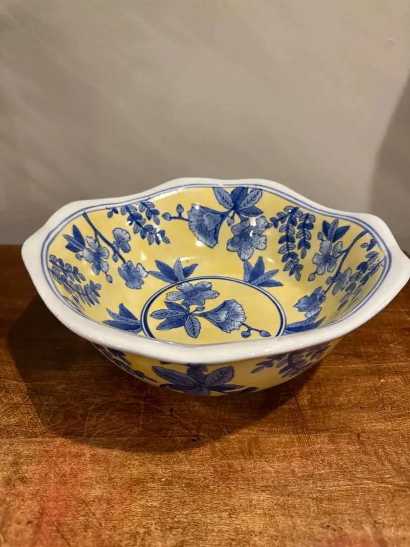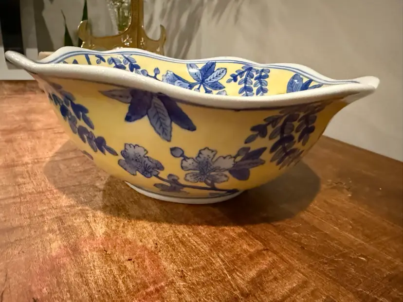 This exquisite Oriental Accent porcelain bowl features a beautiful yellow and blue floral design, perfect for adding a touch of elegance to any decor. The decorative bowl showcases intricate blue botanical patterns against a vibrant yellow background, with a unique scalloped rim. It's an ideal piece for display in a living room, dining room, or bedroom. Excellent pre-owned condition, with no chips, cracks, or noticeable wear.