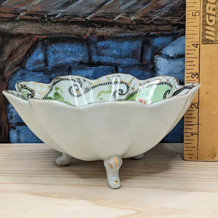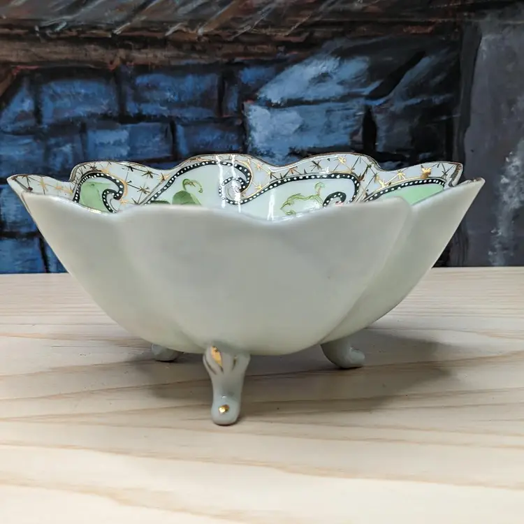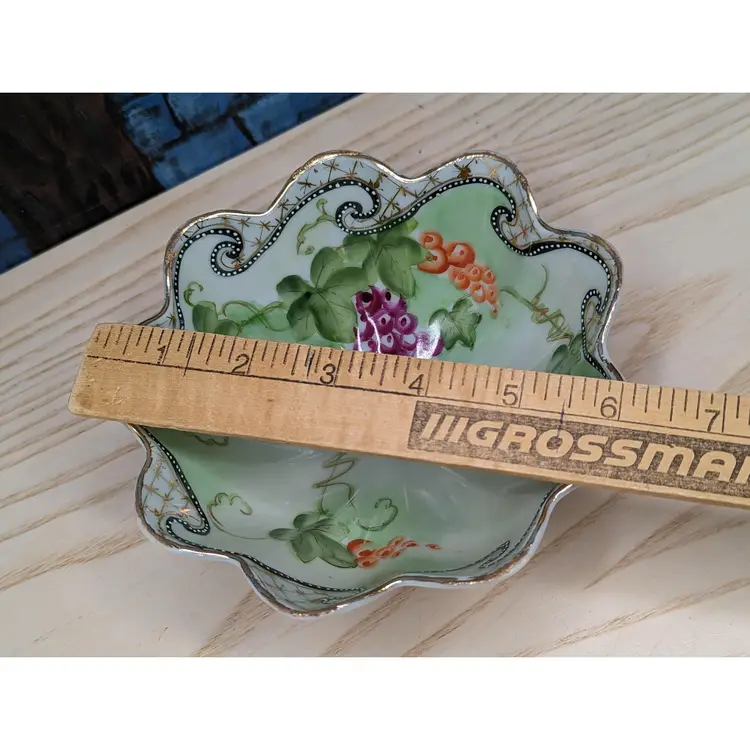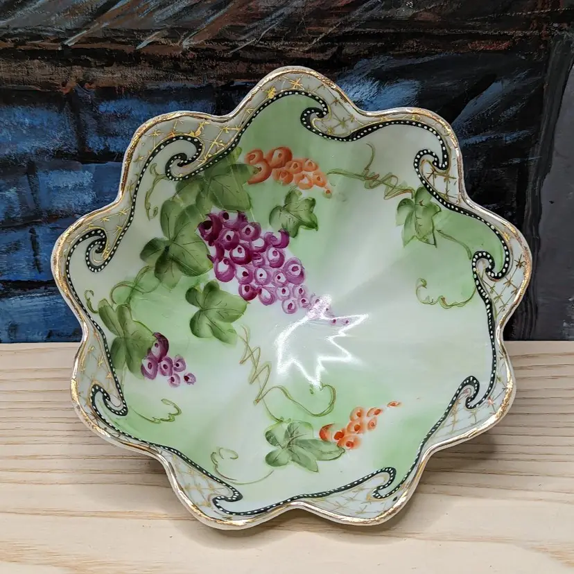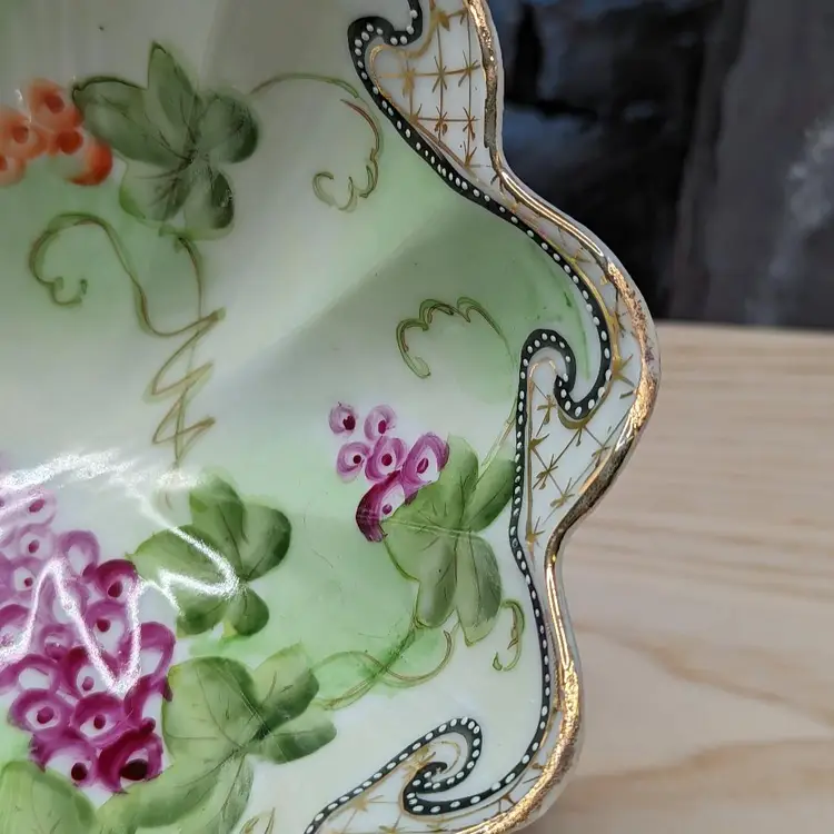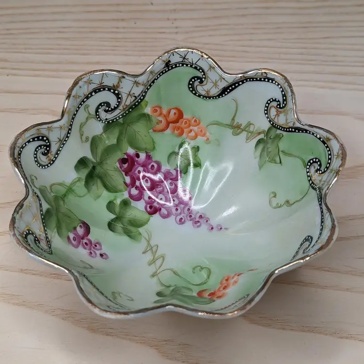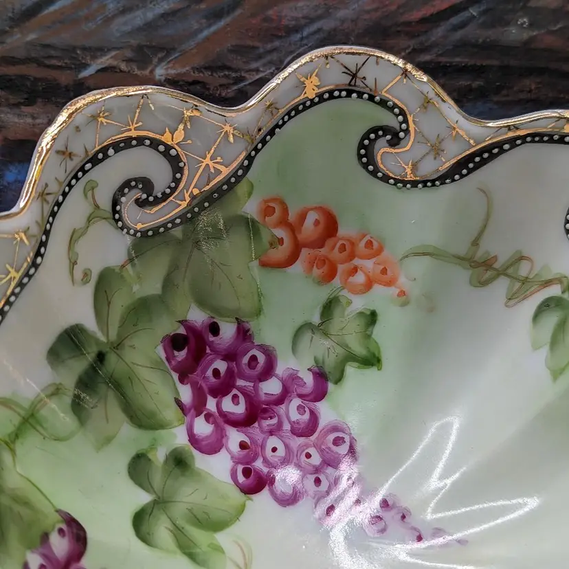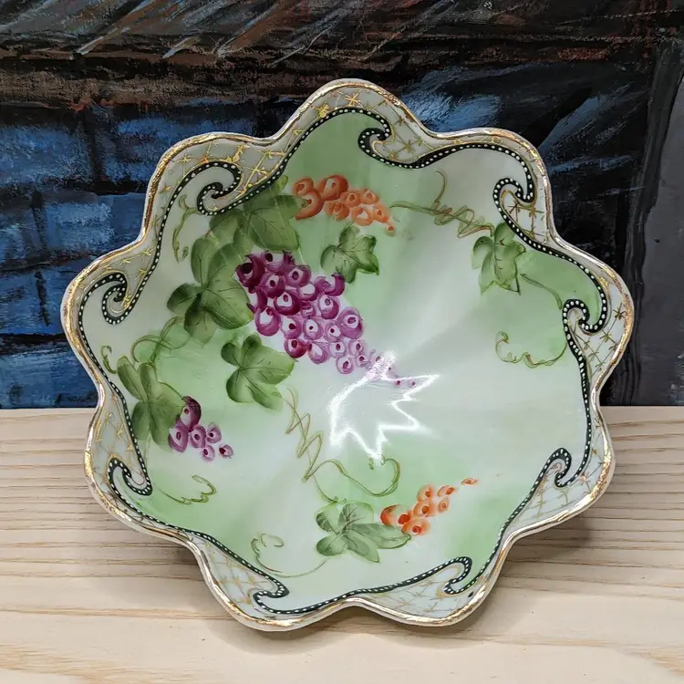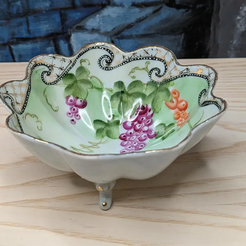 Oriental China Purple Grapes Gold Trim Moriage Footed Nut Bowl or Candy dish , Fresh fruit. Made in Japan .Hand Painted leaves and grapes.It measures 6 1/2 in wide and 2 3/4 in tall.Very good condition no chips or cracks. Please check the photos for details. Comes from a smoke free home. We are pet friendly.