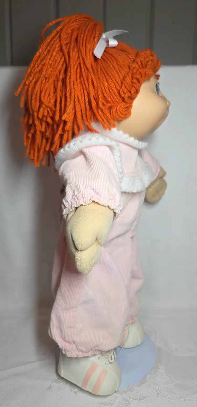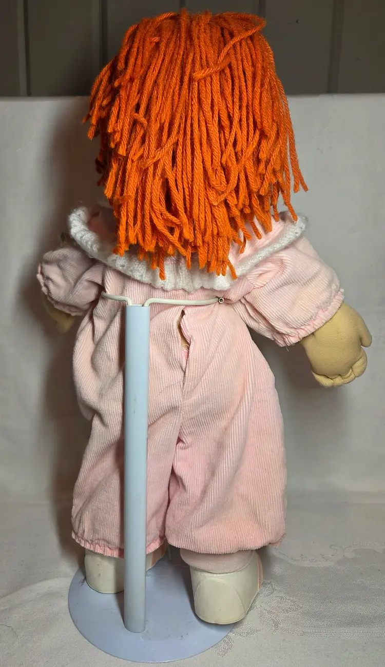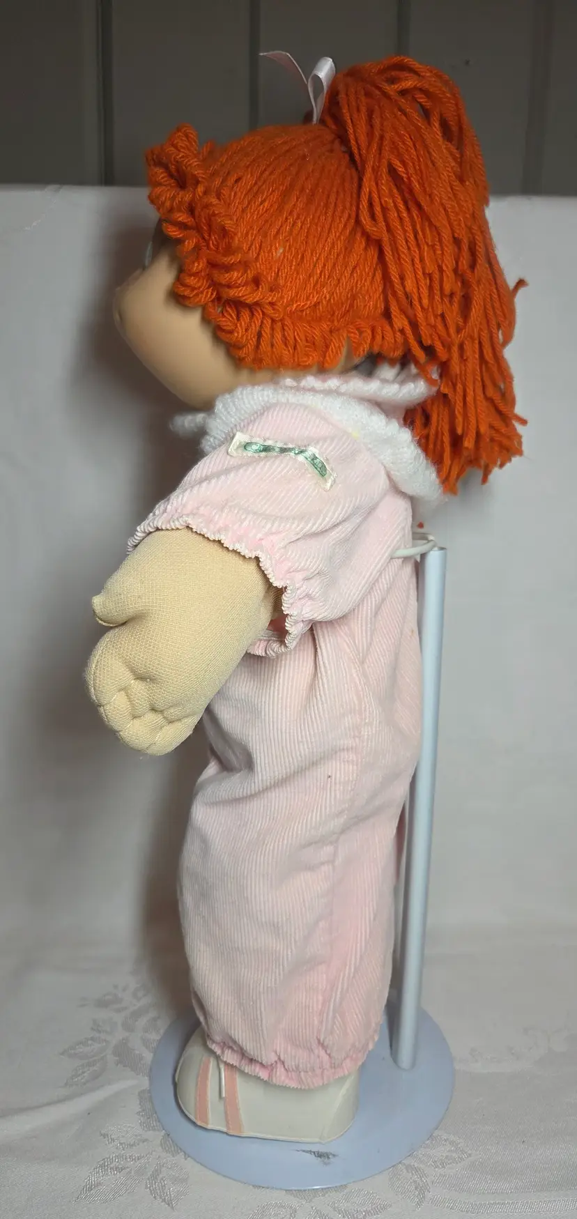 This product is an original 1982 Cabbage Patch Kid doll with red hair and green eyes, It comes with a stand, clothes, and shoes. This vintage play doll is a part of the Cabbage Patch Kids brand, featuring a girl doll with a light complexion and straight hair. This collectible doll from the 1980s is suitable for teens, youth, adults, and even unisex babies and toddlers, making it a versatile and nostalgic addition to any doll playset or collection.
