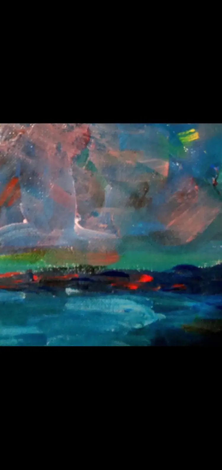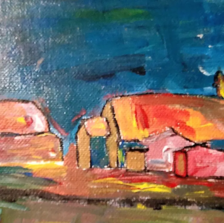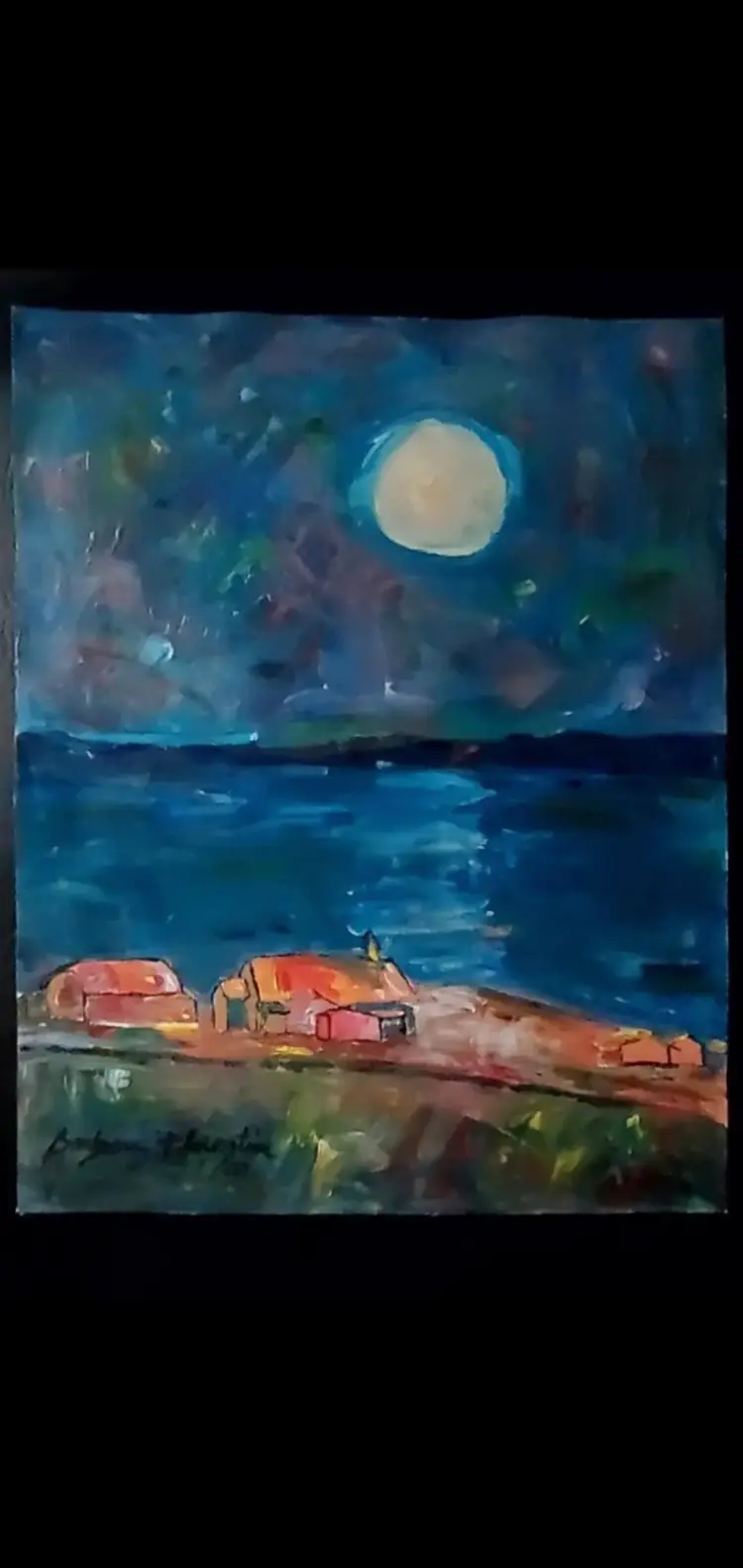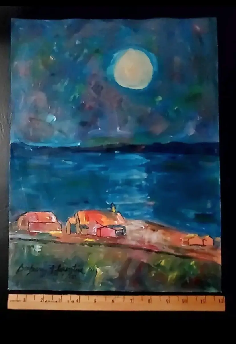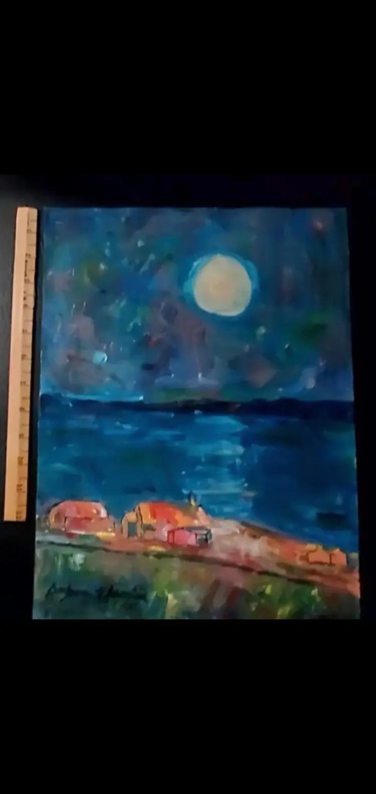 Title: " Moonstone Villa" Seascape Landscape Acrylic Colorful. On Rolled Canvas To Be Framed or Mounted. Will Come Rolled Up in Shipping 12 x 16" Fun Decor Gift Add to ART Collection โโโ Has Folded CREASE Indentation in Canvas as Shown.โโโโโ Comes With COA Certificate of Authenticity Signed. Beautiful Bold Almost Glowing Colours. Dm Please For More Insight To This Piece. Thank YOU.~Barbara
