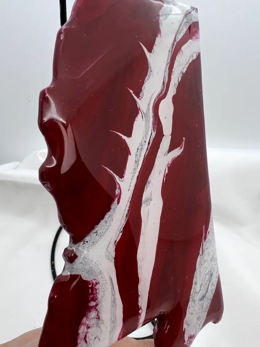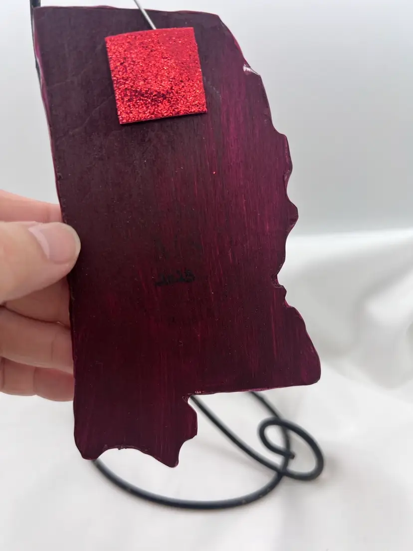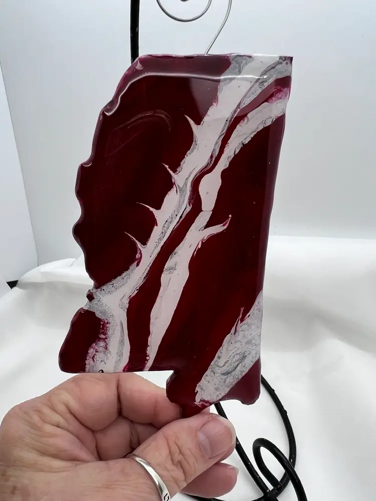 Original artwork created in my studio. One of a kind wooden ornament, acrylic pour painted in Mississippi State colors of red and white, then sealed with resin. Comes with a curly hanger attached ready to display or gift. MS2