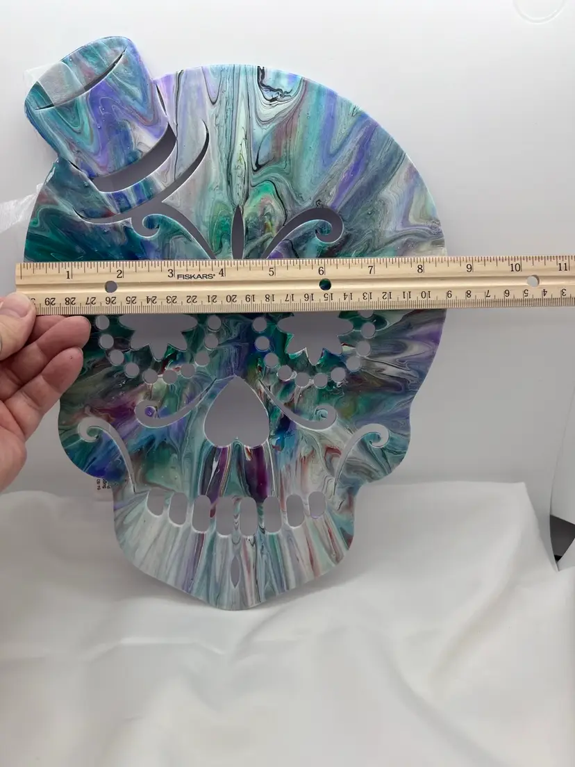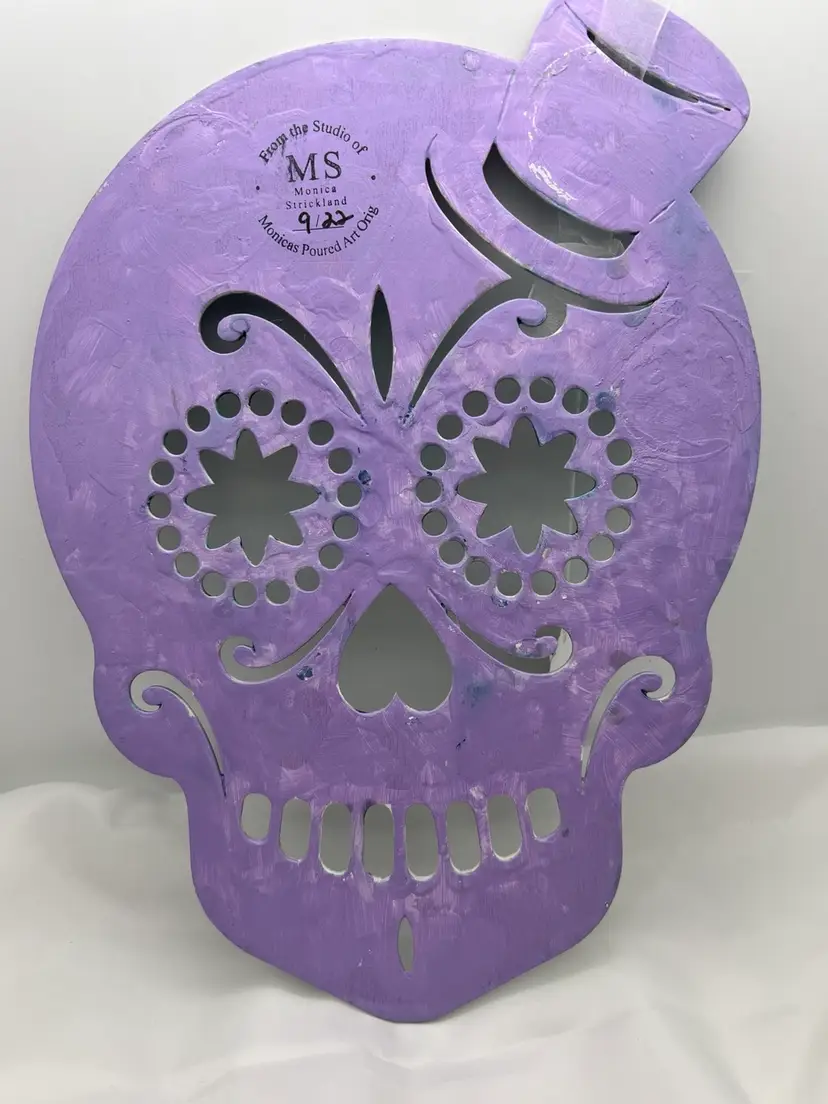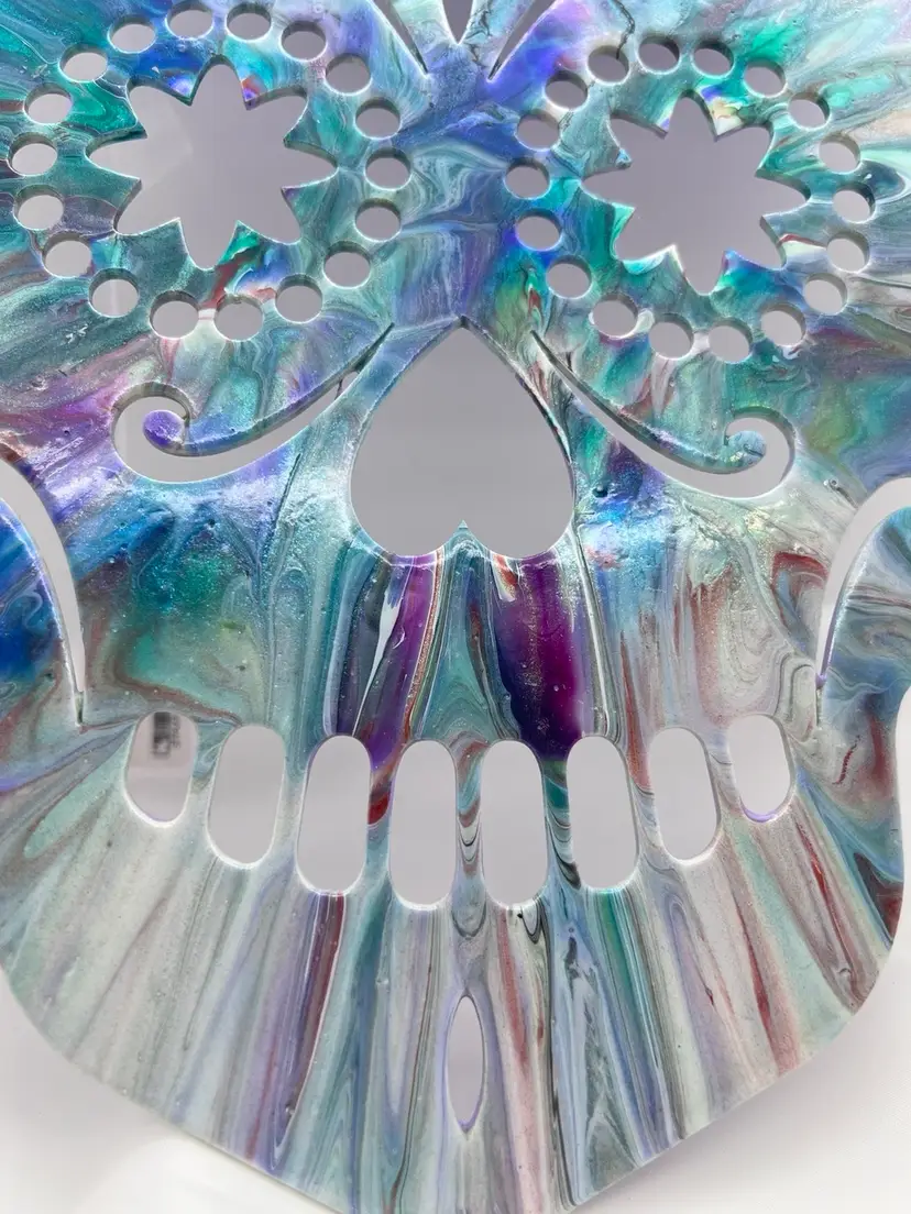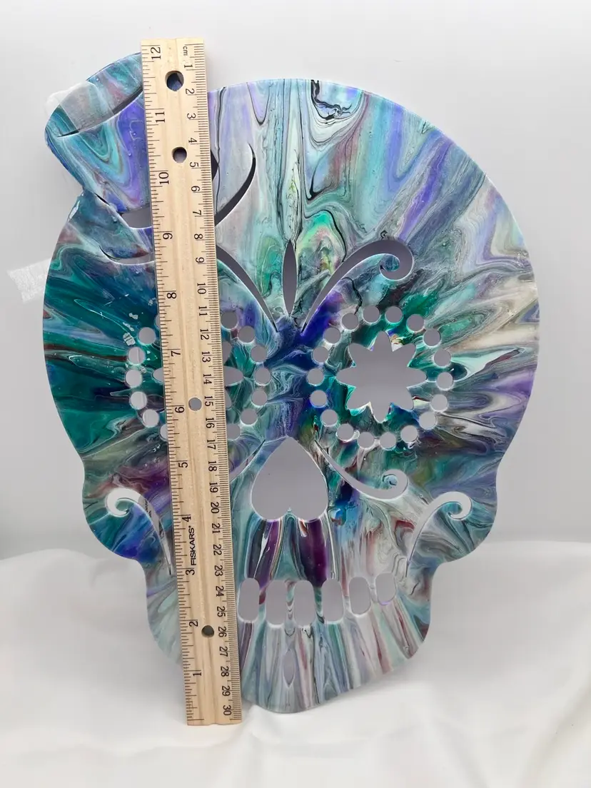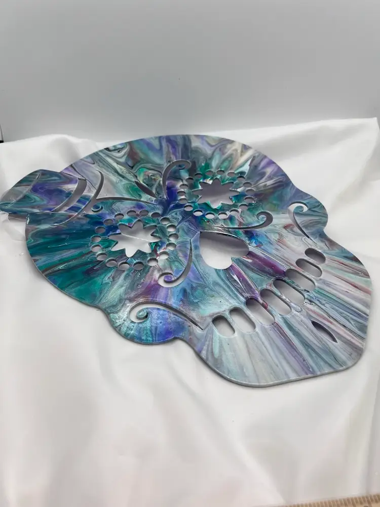 Unique one of a kind artwork. Wood sugar skull cutout acrylic pour painted in peacock colors - blues and purples, sealed with Polycrylic varnish to preserve the colors. 11 3/4” x 8 3/4” with a ribbon to hang. Created in my studio using high quality paints and pigments. No two pieces are alike. MHR