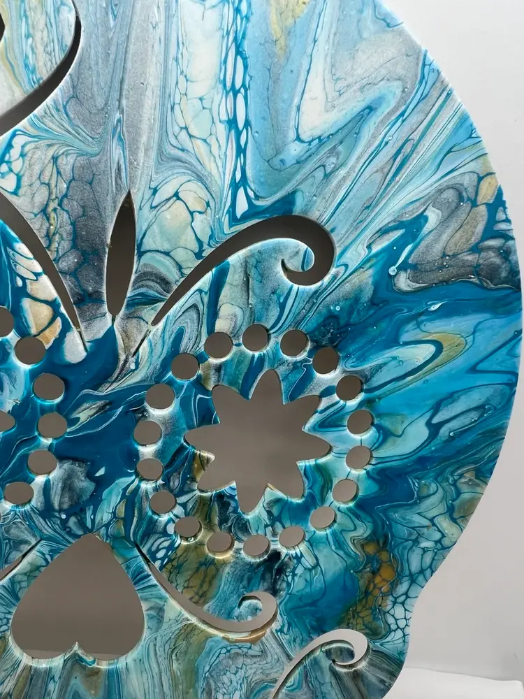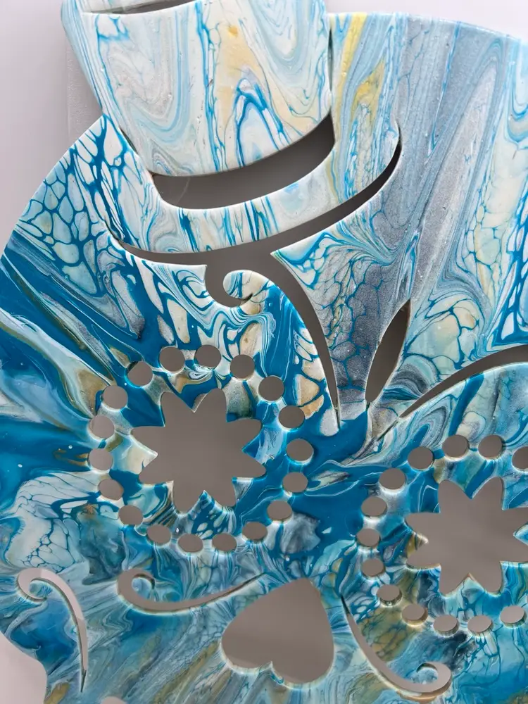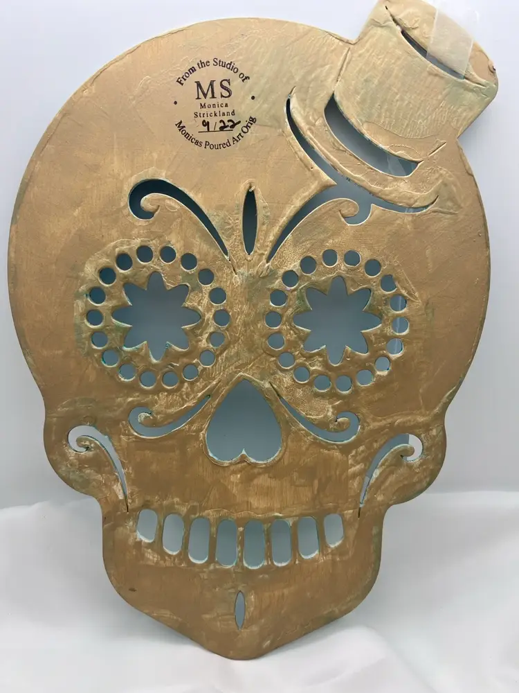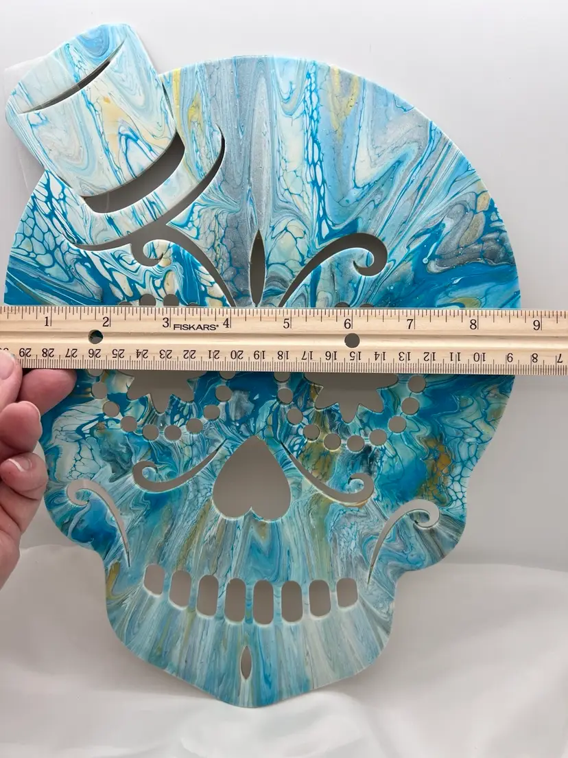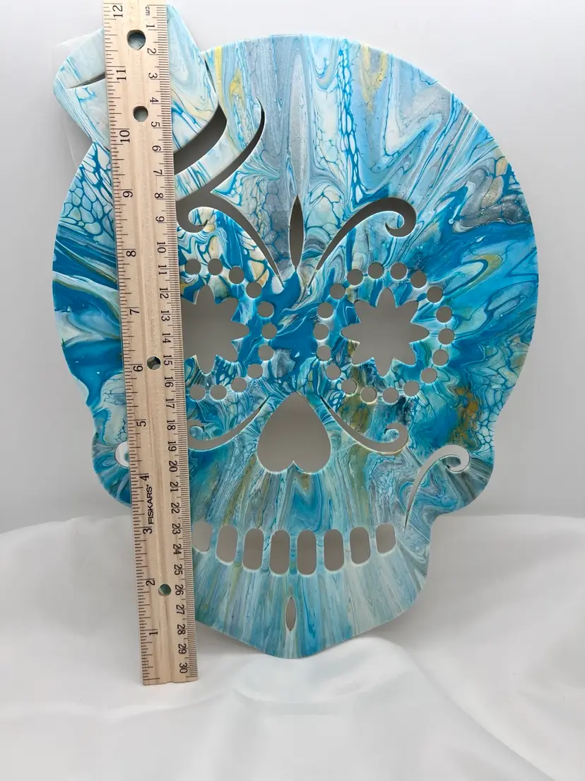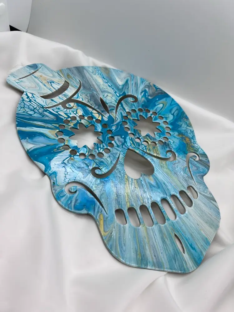 Unique one of a kind artwork. Wood sugar skull cutout acrylic pour painted in ocean blues, sealed with Polycrylic varnish to preserve the colors. 11 3/4” x 8 3/4” with a ribbon to hang. Created in my studio using high quality paints and pigments. No two pieces are alike. MHL