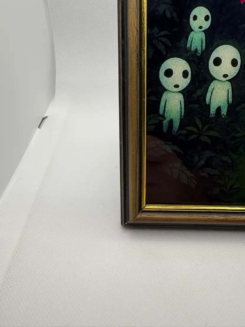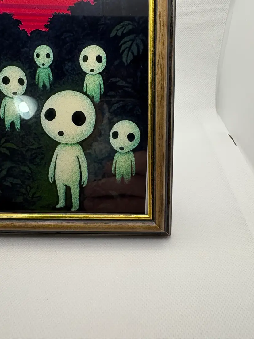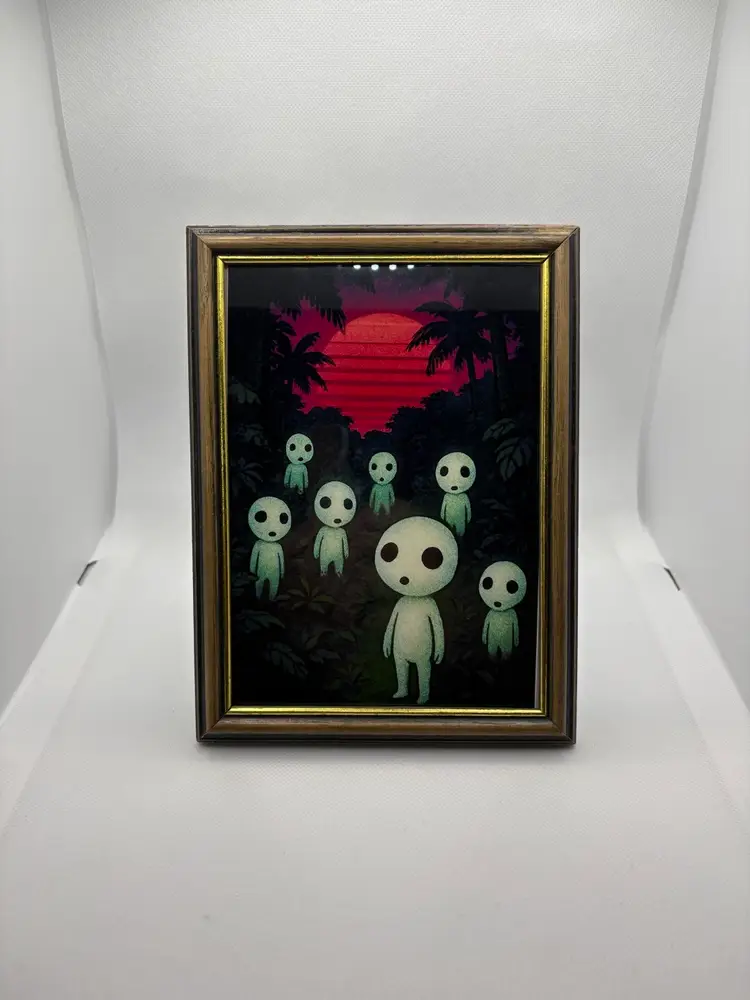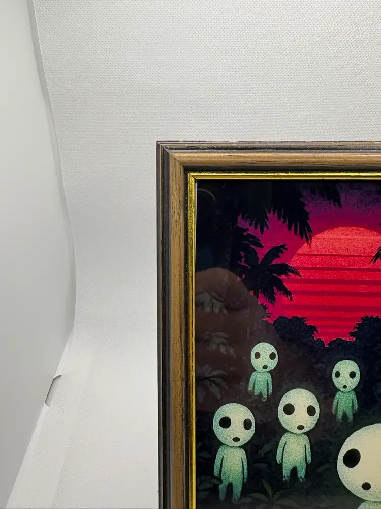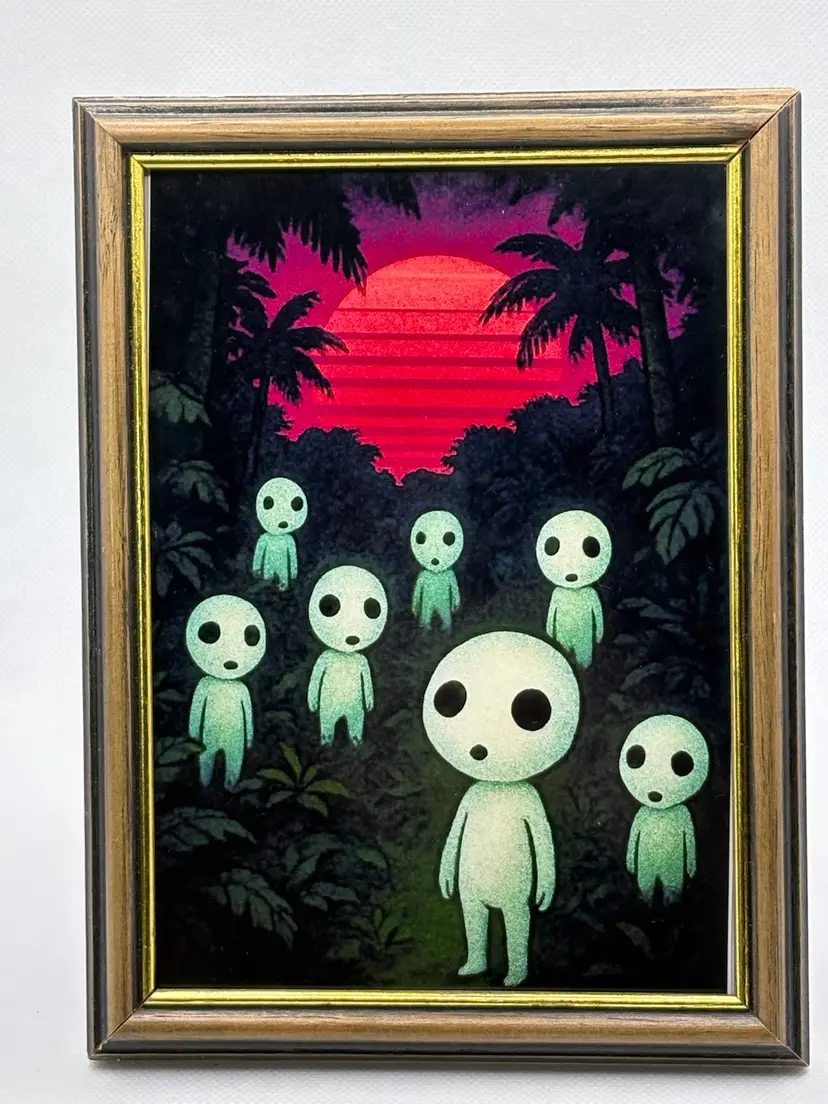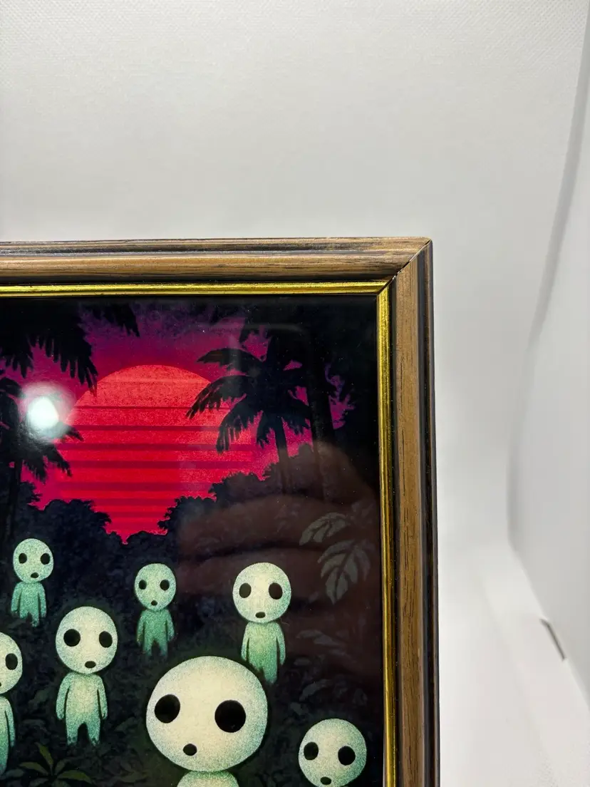For sale is an original custom art print. The scene shows a family of Kodama gathered in the jungle at dawn. The background has a 80’s retro feel to it, and is completely original. Comes in a modern sleek frame. Stand out and start the conversation with your friends and family today! Bring home this awesome print!