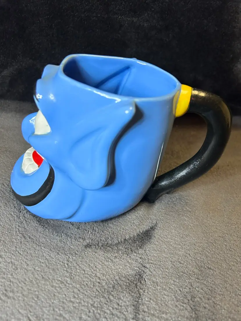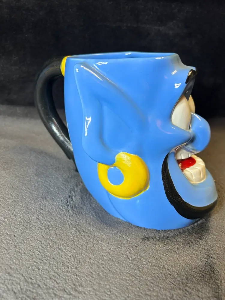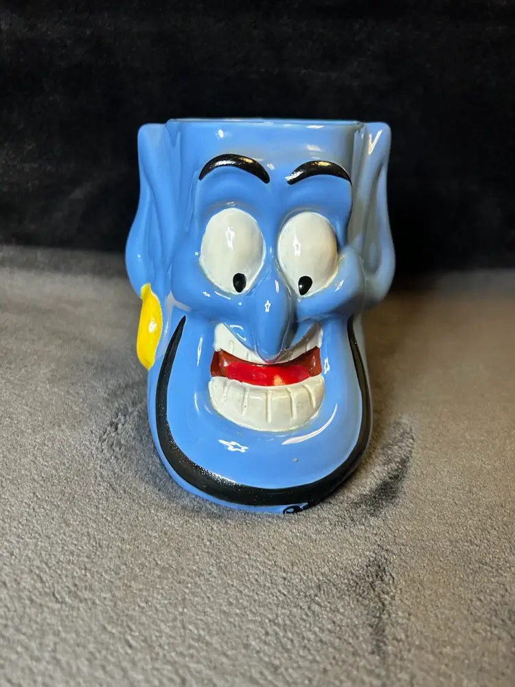 This is an original Disney Genie mug from 1992 featuring Aladdin. It is a vintage collectible item with no chips or cracks. The mug is part of the Disney franchise and would make a great addition to any Disneyana collection.