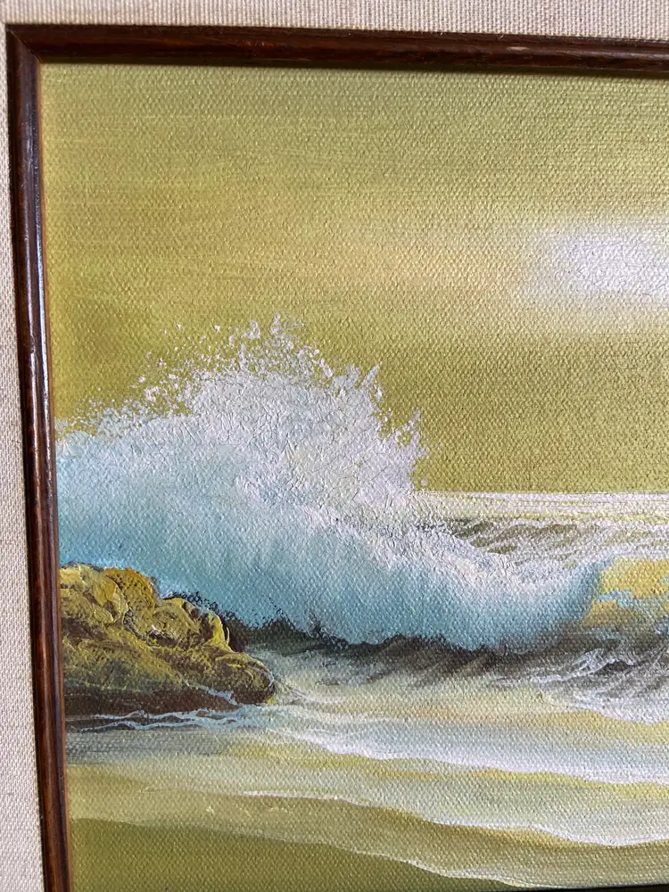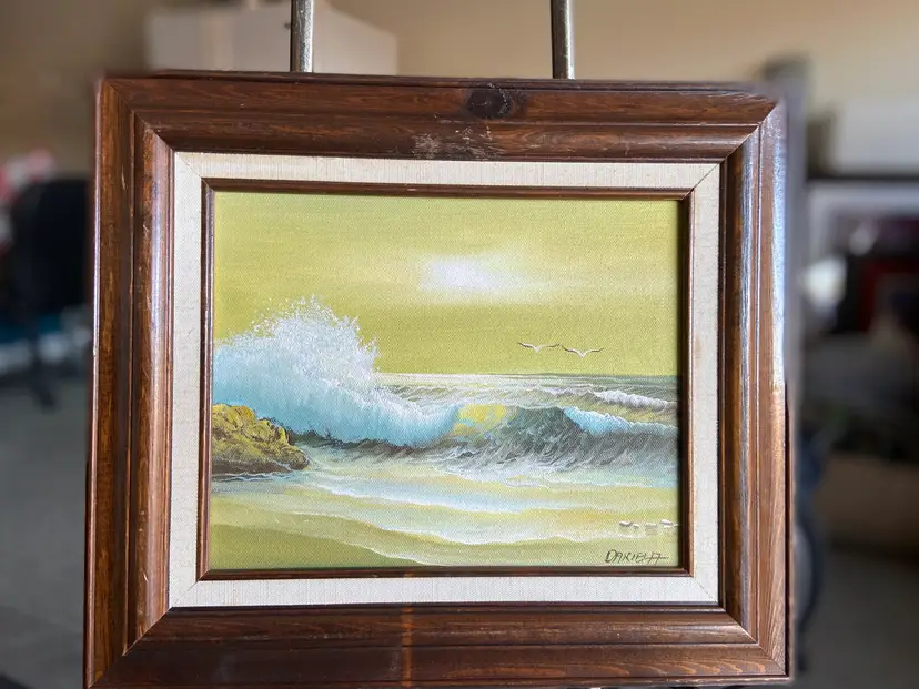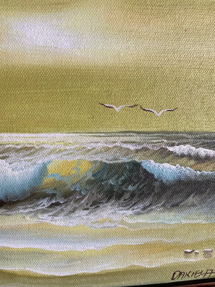 This product is an original framed oil painting of a seascape, signed by the artist Daniela. The small painting measures 9.75 x 7.75 inches and is done on canvas. It is a handmade piece of art produced in the United States using the oil painting technique. The painting is framed and signed by the artist, making it a unique and authentic piece of art for any art lover. Frame Size: 14" x 12.5"