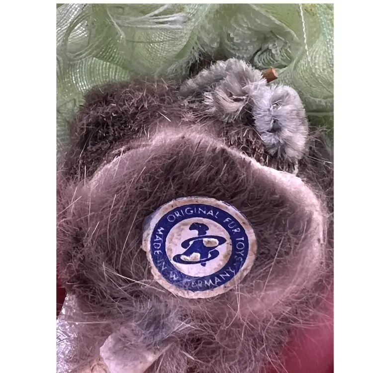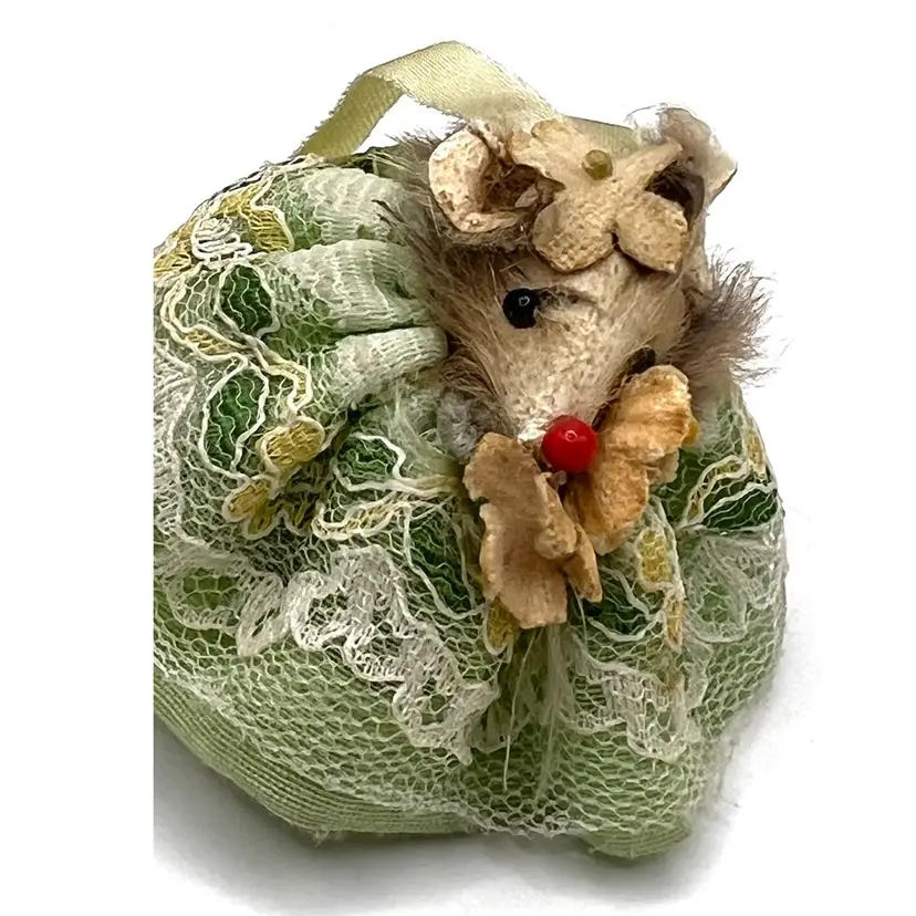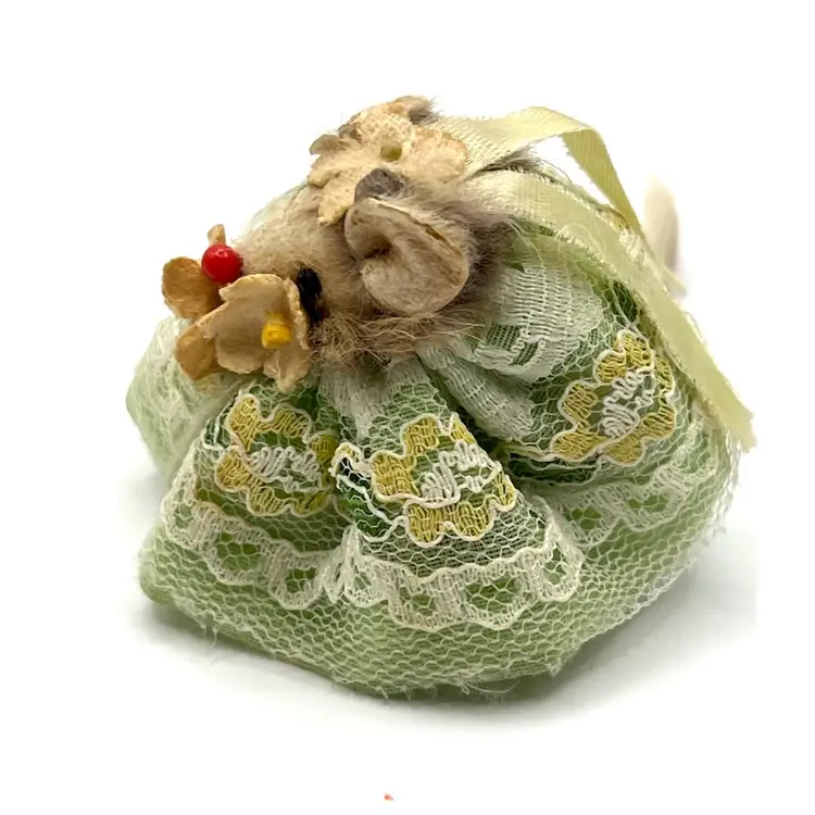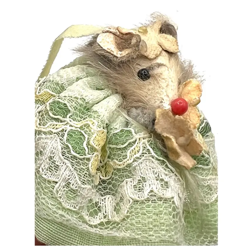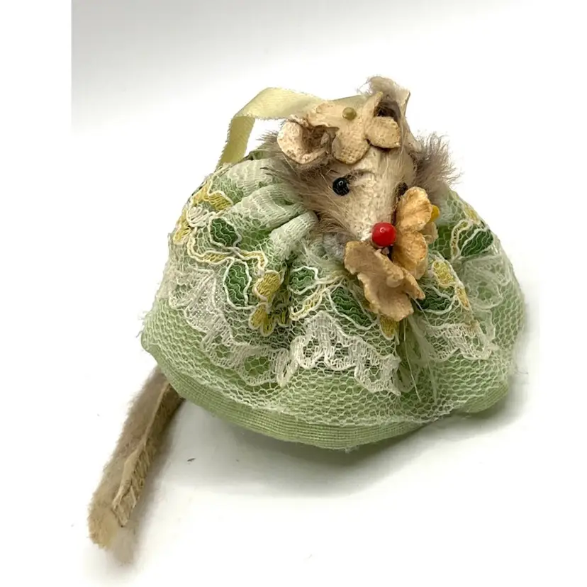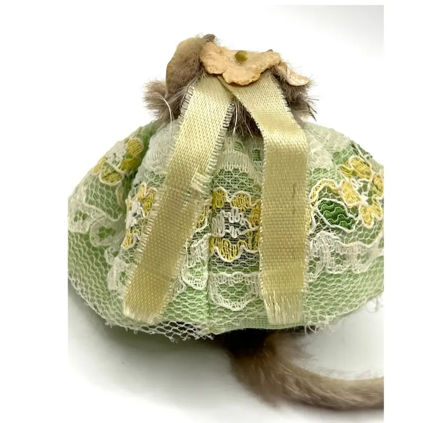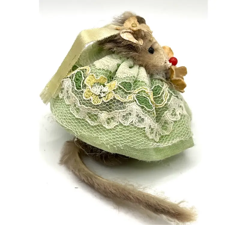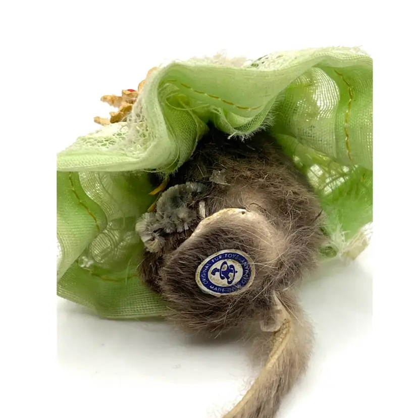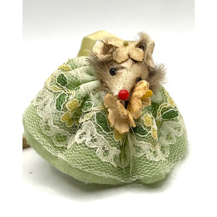 Original Fur Animals Toy Collectible Mouse Green Lace Dress. Made in West Germany. 2 in Height. Good condition