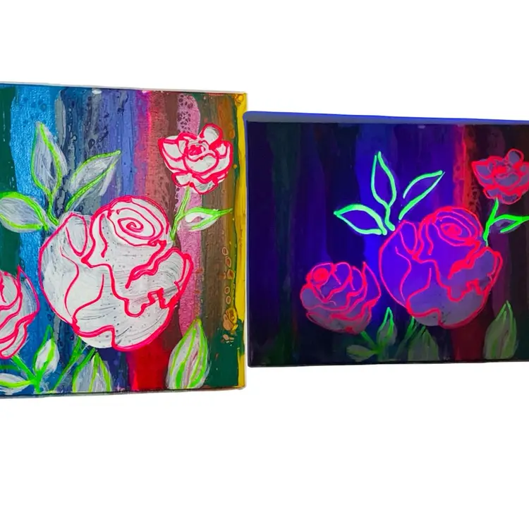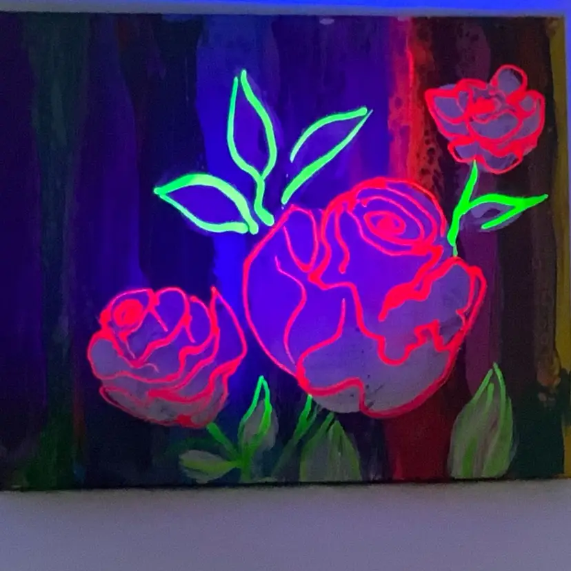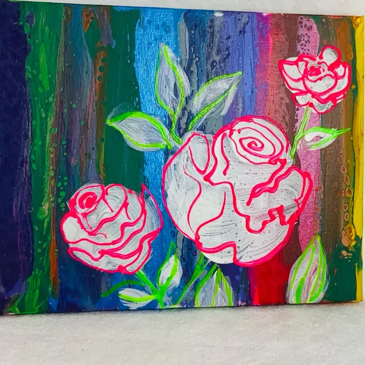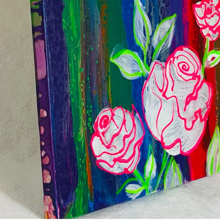 Sweet, artist signed acrylic painting, featuring an abstract rose stem against a rainbow orange red yellow and gold background. Approximately 8” by 10” Glows under 395nm UV light.