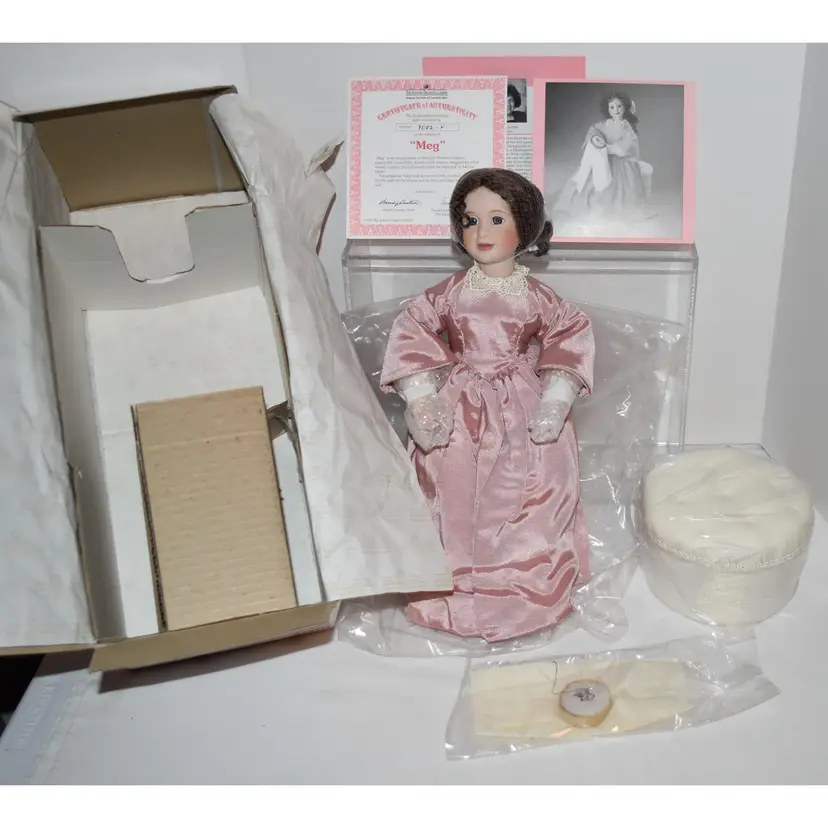 Condition: Used Good. Meg's hair is still untouched in the manufacturer's netting, her hands and feet are still factory wrapped. Her outfit, hassock and needlework are all clean without remarkable signs of use. Her gift box has wear; including: distressed paper, scuffing, abraded edges and corners and more. Many pictures for your appraisal. She comes with her COA and pictured accessories. No stand.
