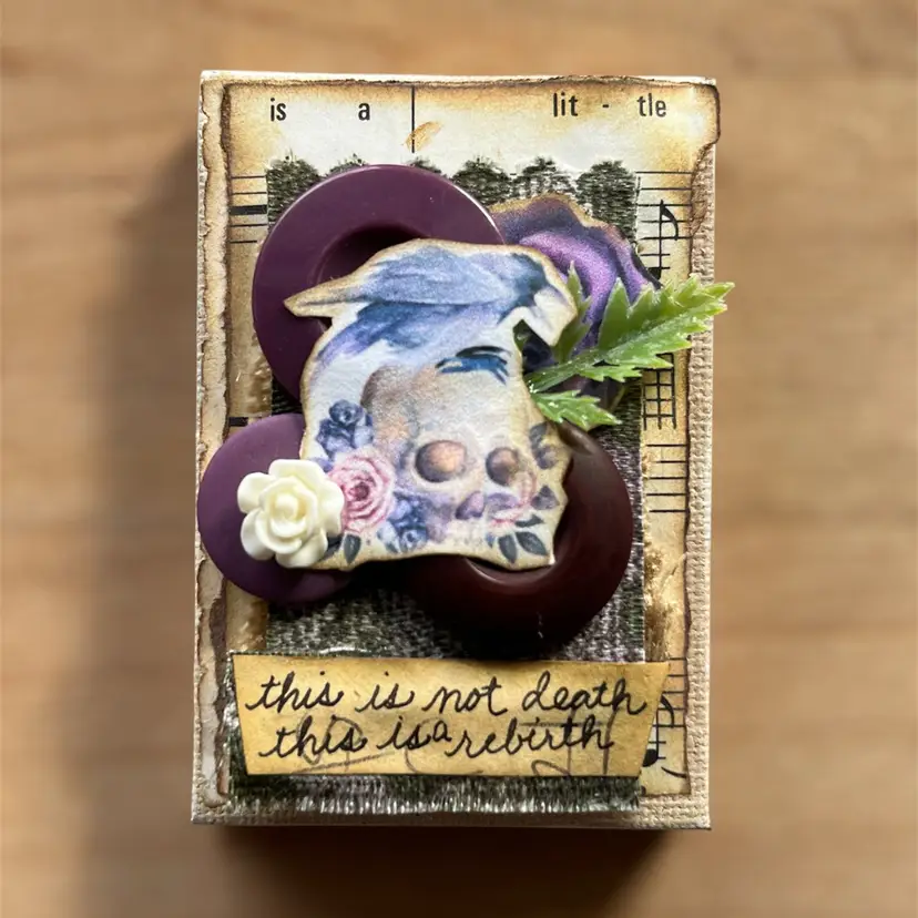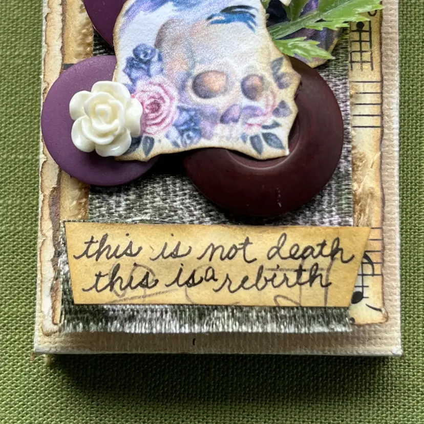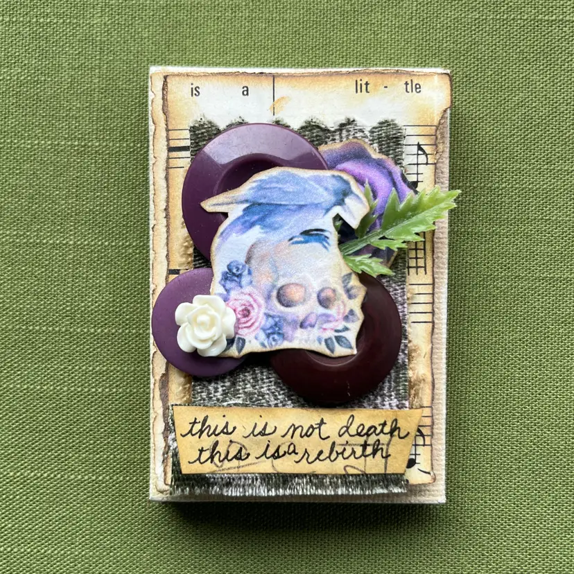 Materials: mini canvas, paper, fabric, bubble mailer, buttons, plastic leaf, plastic flower, handwritten words on coffee dyed paper Measurements: 3 inches tall, 2 inches wide, 3/4" deep Weight: .08 ounces