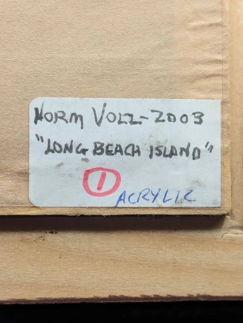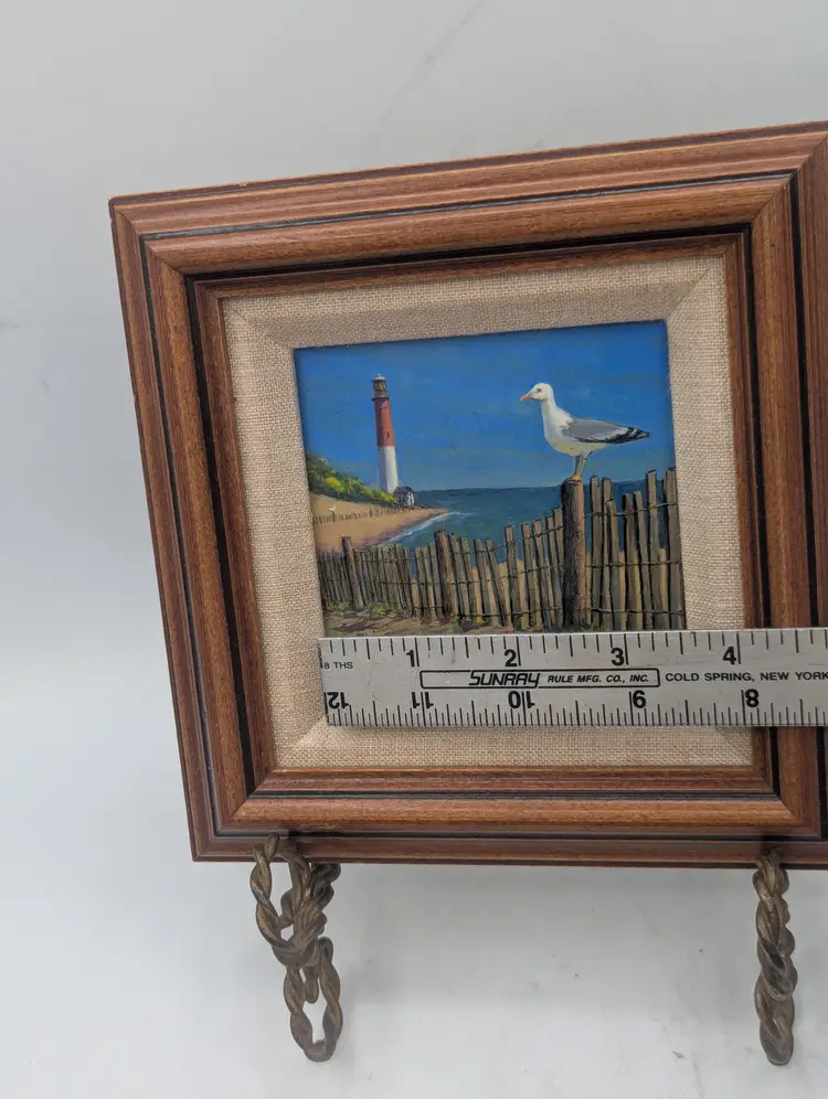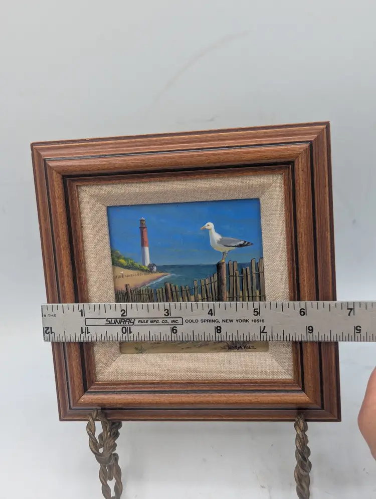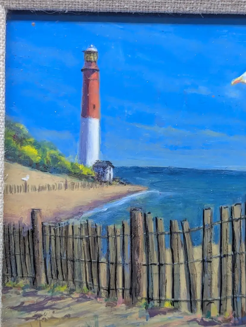 A beautiful original acrylic painting by noted New Jersey artist Norman Volz. This piece, titled "Long Beach Island," captures the iconic Barnegat Lighthouse ("Old Barney") overlooking a classic dune fence with a seagull perched in the foreground. About the Artist: Norman Volz (1924–2020) was a well-known member of the Morris County art community, recognized for his detailed landscapes of the Jersey Shore. His work is highly collected by those who love New Jersey's coastal heritage. Details: Medium: Original Acrylic on board. Dimensions: The frame measures approximately 6.5" x 6.5". The painting aperture is approximately 3" x 3". Framing: Housed in a classic tiered wood frame with a linen-texture mat. Condition: Excellent vintage condition. The colors remain vibrant. Ready to hang or display on an easel (as shown in photos). Provenance: Includes the artist's original label and contact information on the reverse, dated 2003. This is a perfect piece for an LBI beach house, a lighthouse enthusiast, or a collector of local New Jersey fine art. Shipping: Will be packed with extreme care using bubble wrap and a sturdy box to ensure safe arrival.