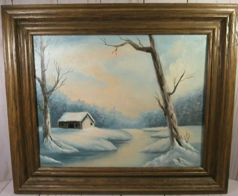 PRE-OWNED ORIGINAL OIL PAINTING BY ARTIST PAT KEELY AKA: ROSEMAY P. KEELY or RP KEELY "SNOWY LAKE" #011 8 x 10" CANVAS BOARD SOLID WOOD FRAME VERY GOOD CONDITION COMPLETED PRIOR TO 1995 *****THE FRAME IS VINTAGE AND MAY SHOW WEAR LIKE NICKS OR SCRATCHES (see picture) Handicapped self-taught Florida artist/teacher. My late mother.