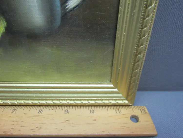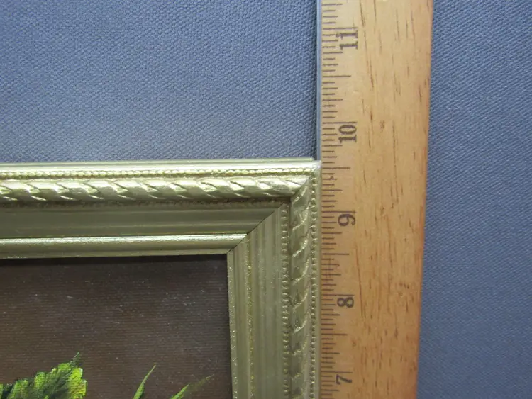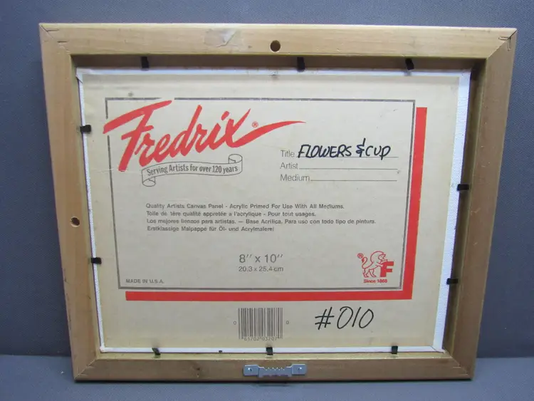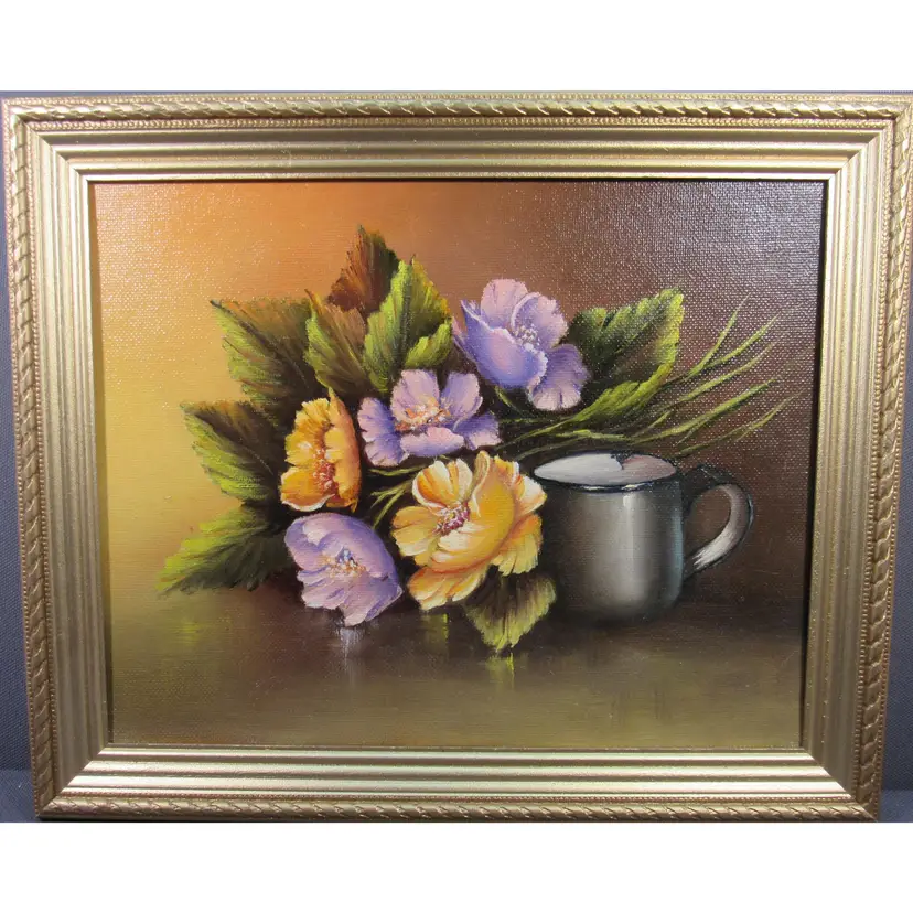 PRE-OWNED ORIGINAL OIL PAINTING 8x10 CANVAS BOARD SIGNED ARTIST PAT KEELY AKA: ROSEMARY P. KEELY or RP KEELY "FLOWERS AND CUP" #010 ****THE PAINTING IS VINTAGE AND MAY SHOW SOME PAINT SCUFFS OR NUANCES(see pictures) *****PRE-OWNED ENGRAVED GOLD FRAME IS 11.5" x 9.5" THERE MAY BE A NICK OR TWO Handicapped self-taught Florida artist/ teacher. My late mother.