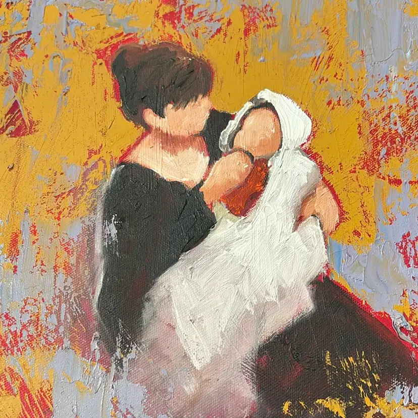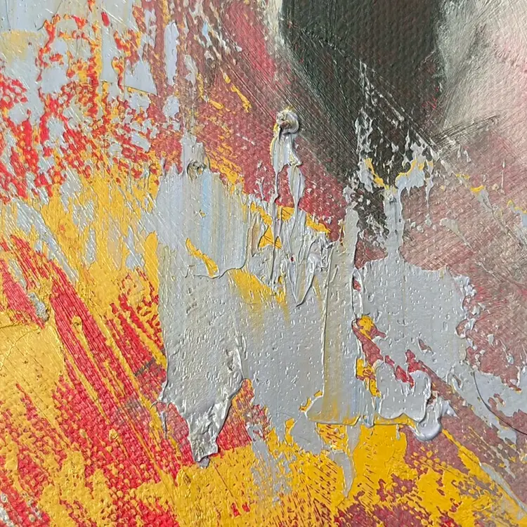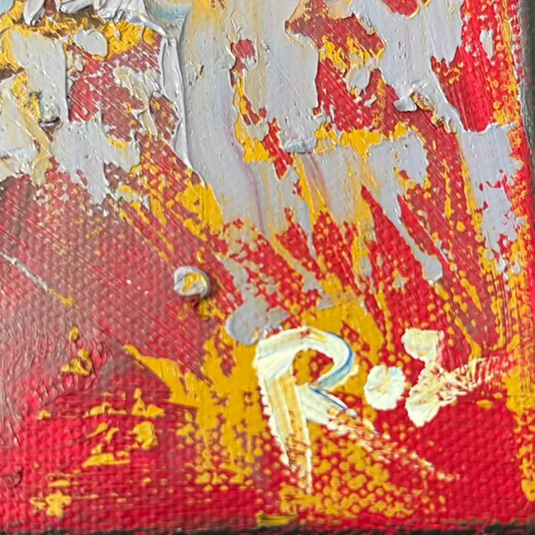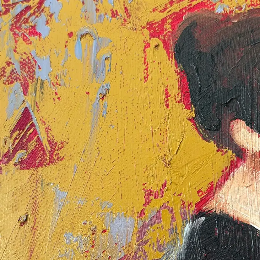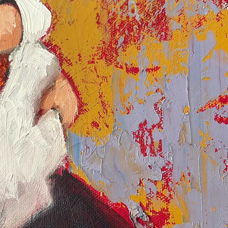 Really interesting painting with lots of texture worked into the canvas with a palette knife ?? Love the colors and the unusual juxtaposition of these subjects with rough textures