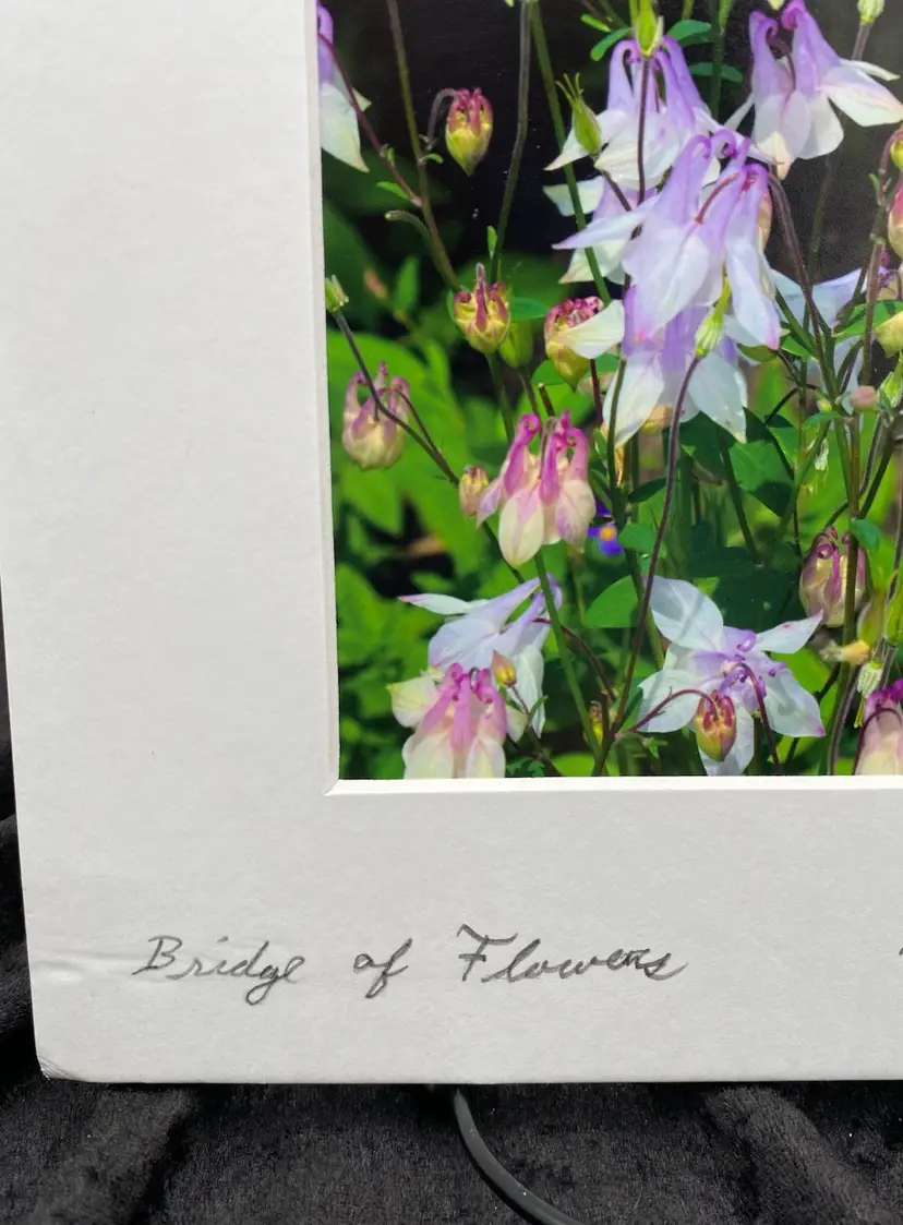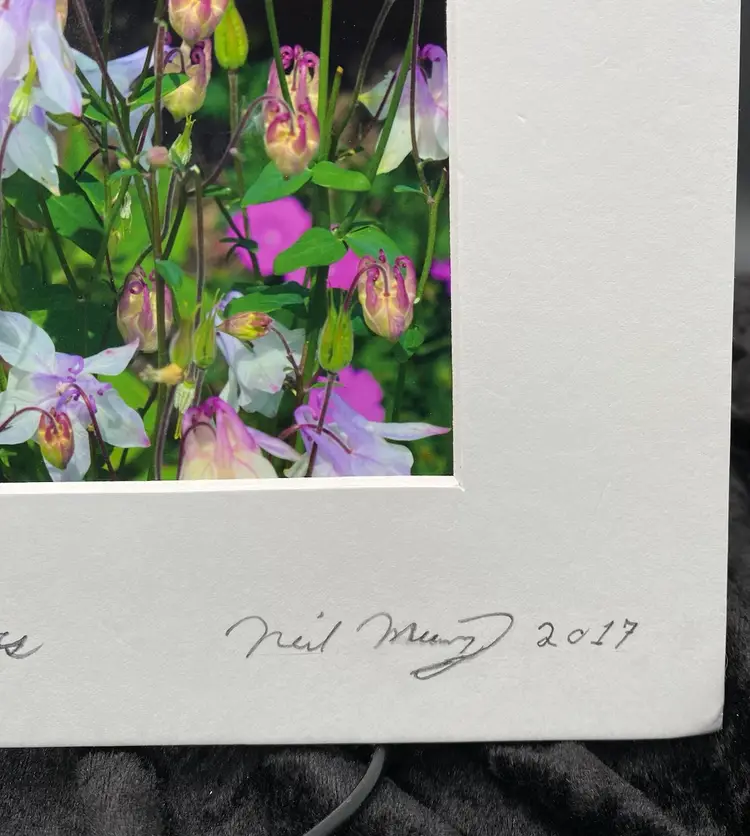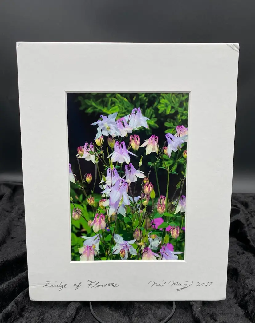 This original photo of purple columbine flowers, signed by Neil Murry, features a portrait orientation. The professional matting measures 8" x 10", while the visible portion of the photograph measures 4.3" x 6.3". The image is printed on glossy paper and is ready for framing. The photograph captures the beauty of nature, specifically the delicate beauty of columbine flowers, also known as "Granny's Bonnets". Shot in 2017 in the United States, this photo showcases the artist's appreciation for nature.