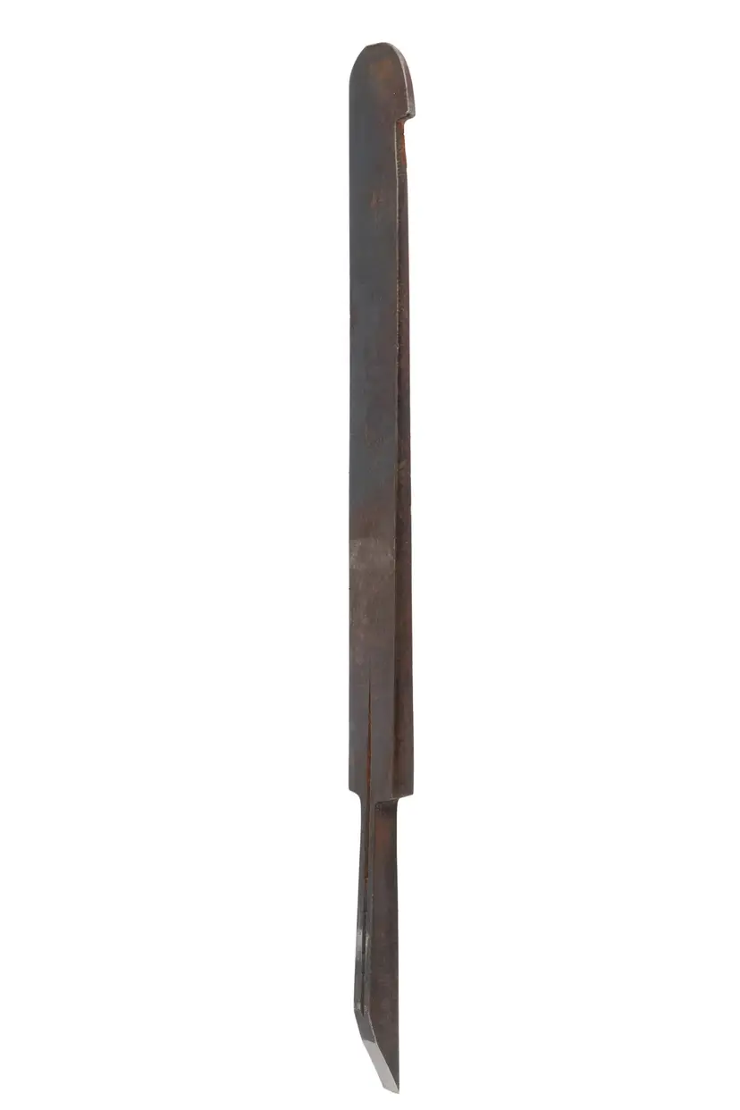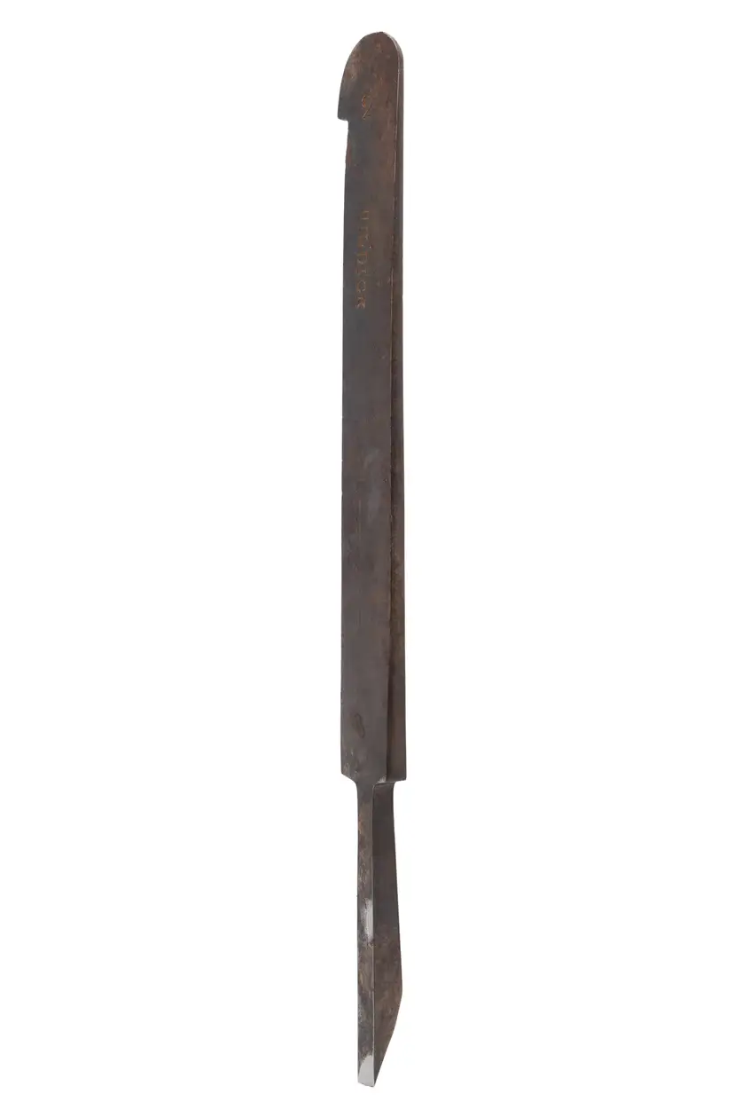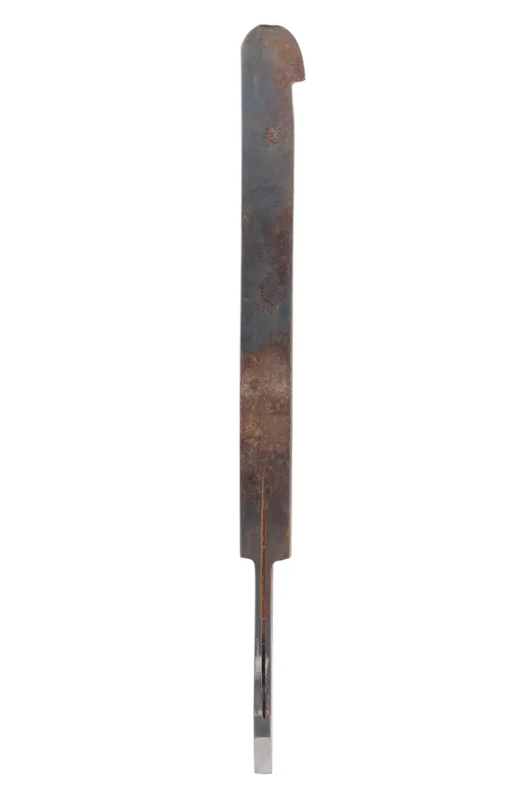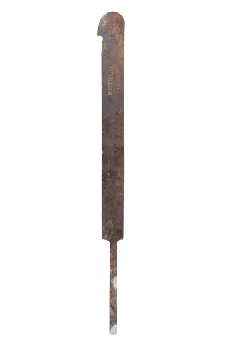 A nice original unmarked plow plane iron, stamped "2" and by a previous owner, "HILDICK." It cuts a 3/16" wide groove. It is nice and sharp but will need honed. 8-5/8" long