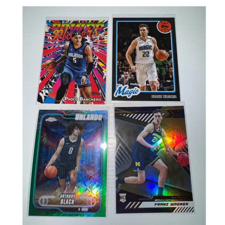 This 4 card lot includes: Poalo Banchero 2025 Topps Flagship Power Players Franz Wagner 2025 Tops Flagship Insert Franz Wagner 2021 Michigan Rc Anthony Black 2024 Topps Chrome Green Refractor
