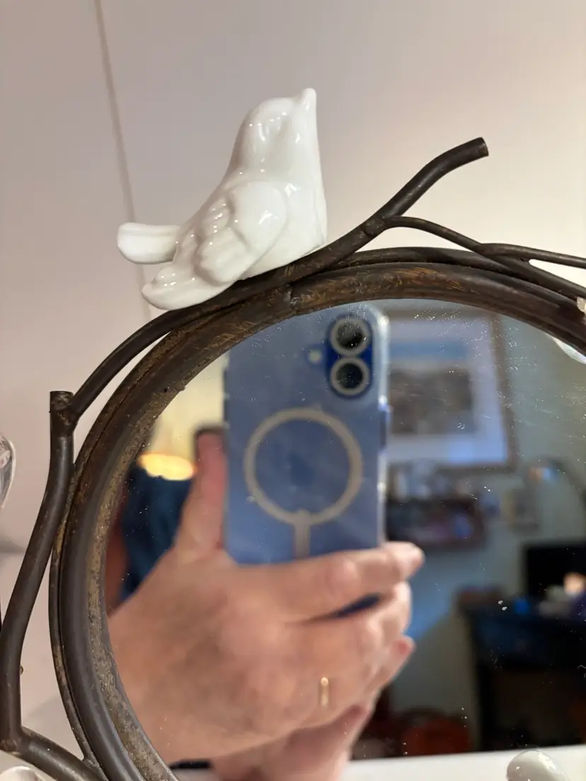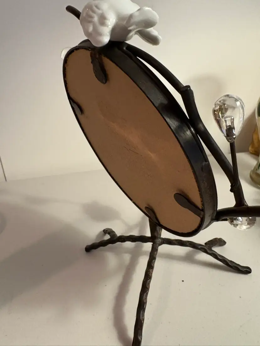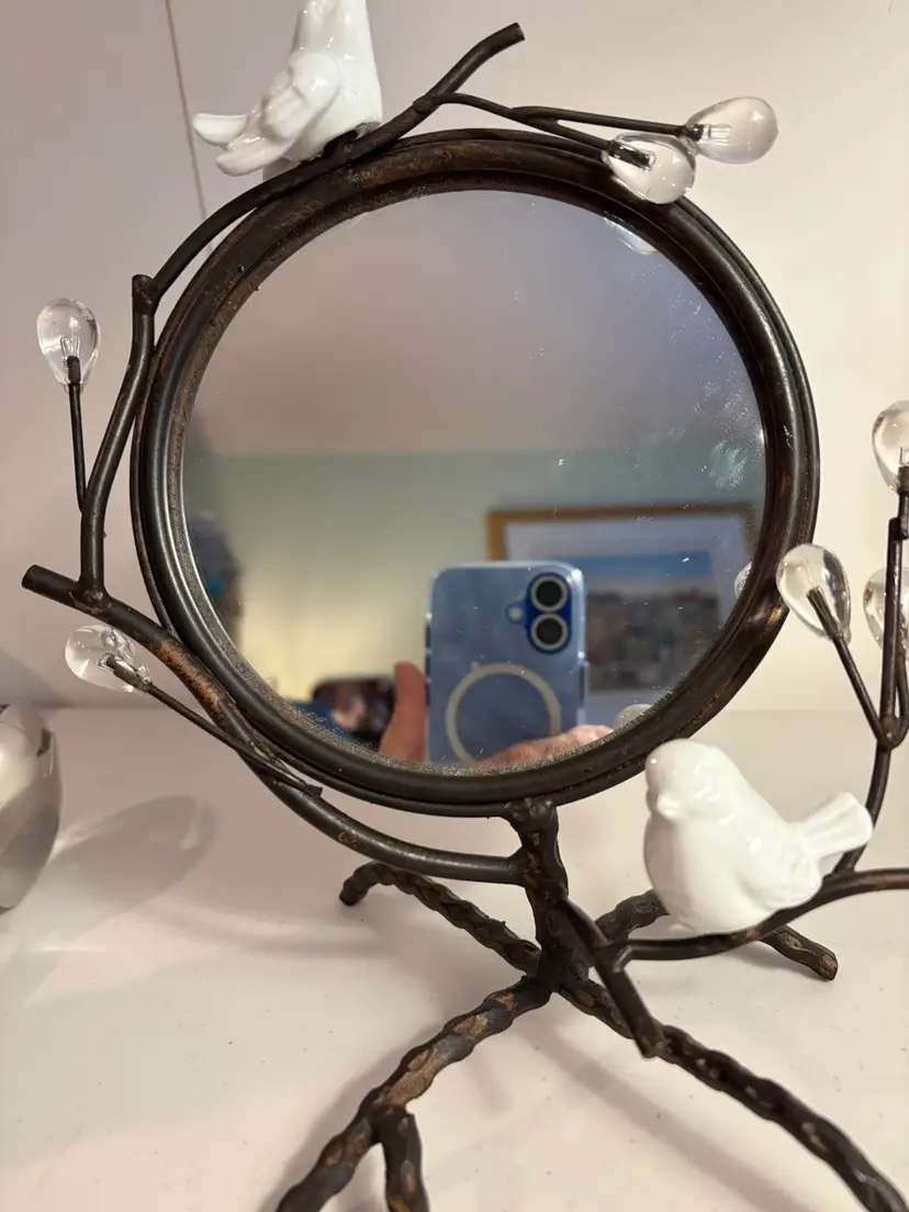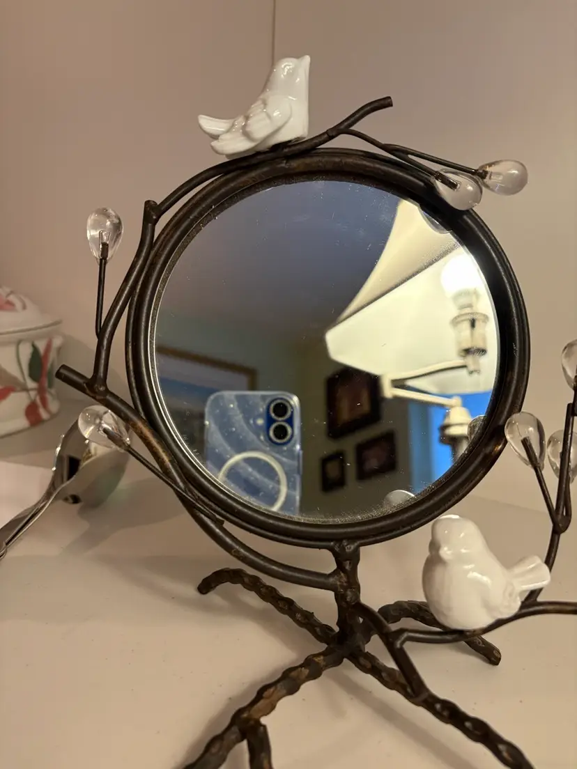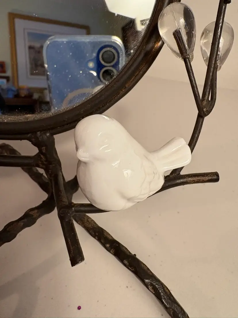 The ornate bird vanity mirror is a stunning piece with a metal and bronze design standing at 10 inches tall. This round mirror with a vertical orientation and freestanding mounting is perfect for adults looking to add a touch of elegance to their vanity or tabletop. The intricate ornamentation and bronze finish make this mirror a stylish and unique addition to any room, fitting in with the modern era of design.