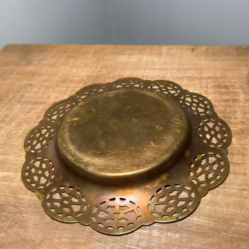 Vintage Ornate Brass Trinket Dish with a beautiful scalloped pierced lace rim. This elegant piece is perfect for holding jewelry, coins, or small keepsakes on a vanity or entryway table.
