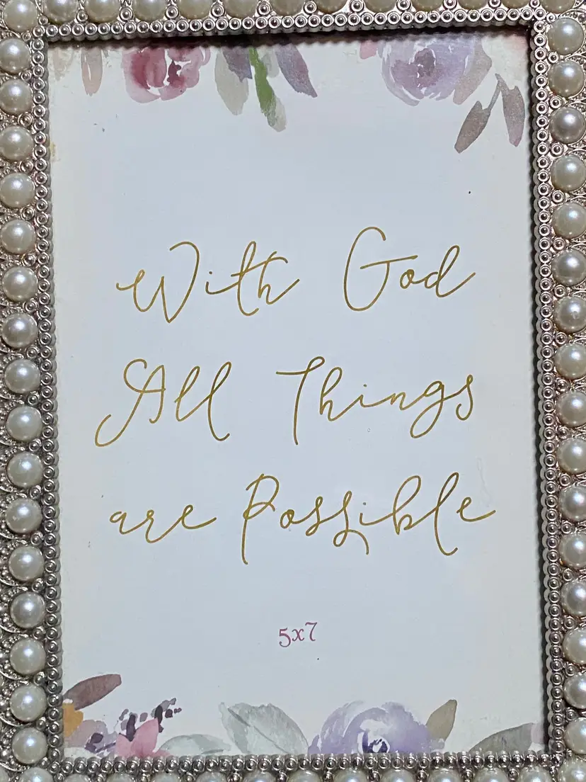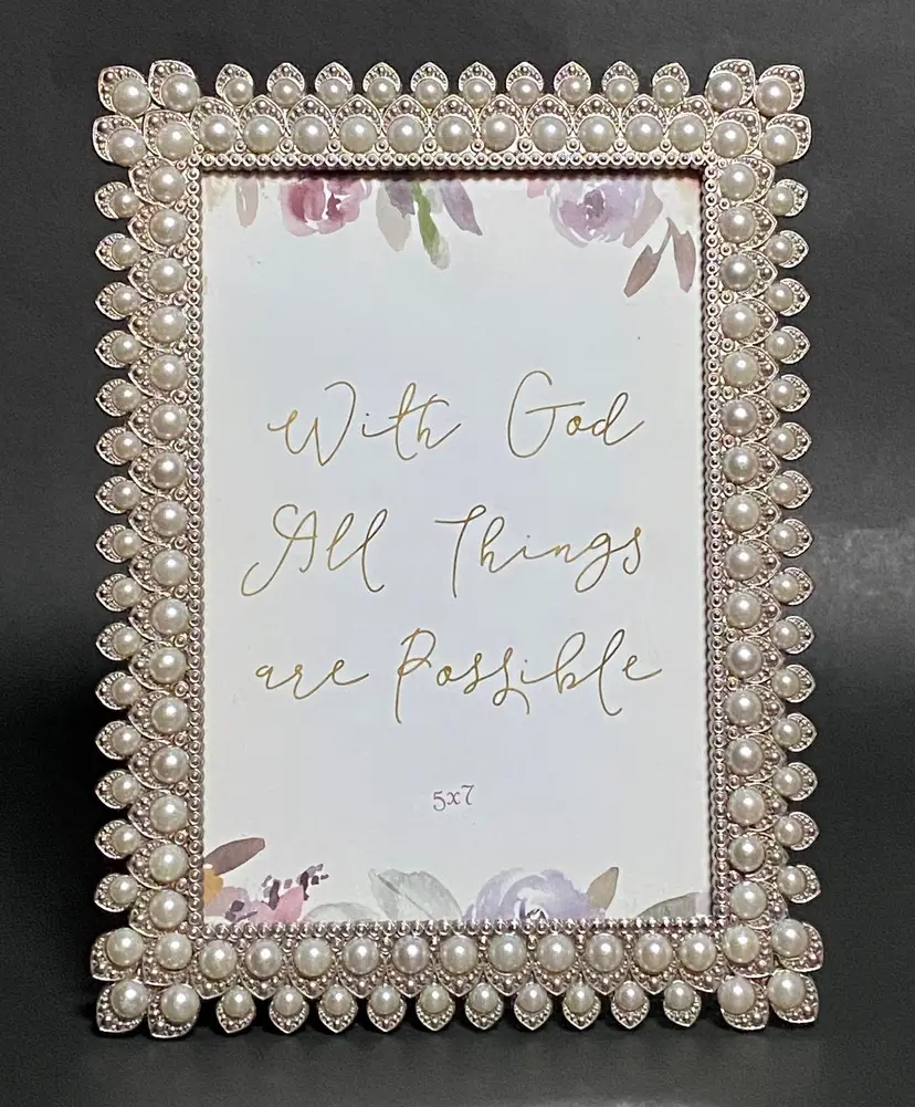 This is a silver-toned 5"x 7” photo size, glass front, metal picture frame with a decorative, ornate, double border featuring faux pearls and the inspirational quote, "With God All Things Are Possible". A reference to Matthew 19:26 from the Bible. It has a felt backing with an easel footing for tabletop display. Great for wedding and anniversary photos. This item is new & unused.