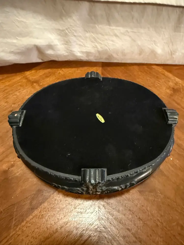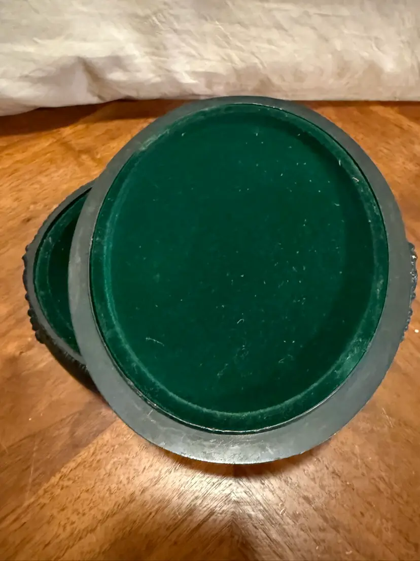 Vintage orante jewelry box featuring an oval shape with elegant footed base. The exterior is crafted from a deep green plastic with high-relief scroll patterns and gold-tone accents. The interior is lined with a lush green velvet to protect your valuables. Approximately 9 inches wide. Perfect for a vanity or as a gift for lovers of Hollywood Regency or Victorian styles. Shows some signs of age-appropriate wear as seen in photos.