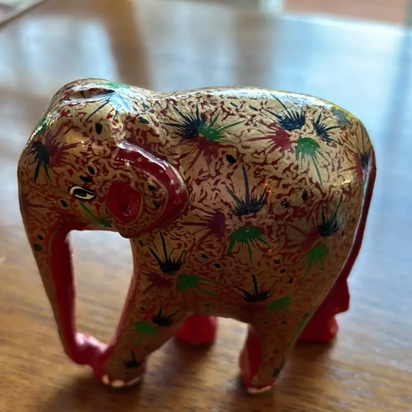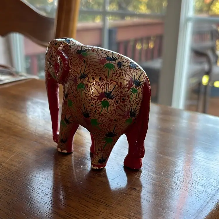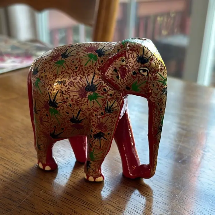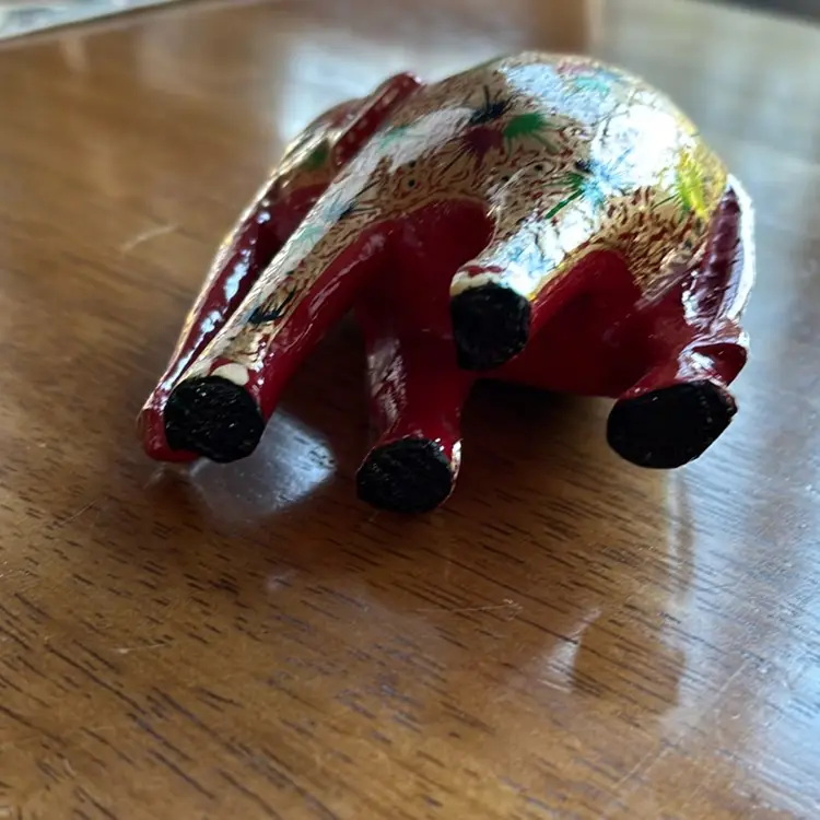Wooden sculpture ornately painted on red and gold made in India, not marked. No condition issues. Measures 3.5” tall by 3.5” wide.