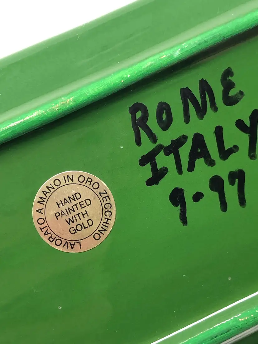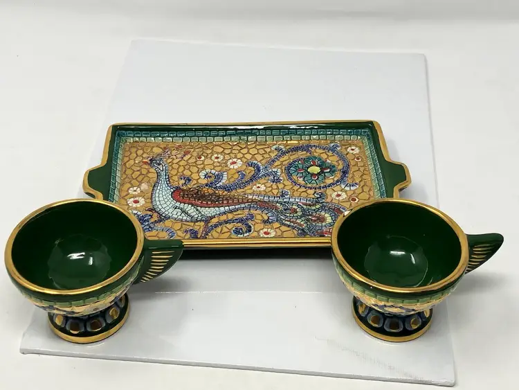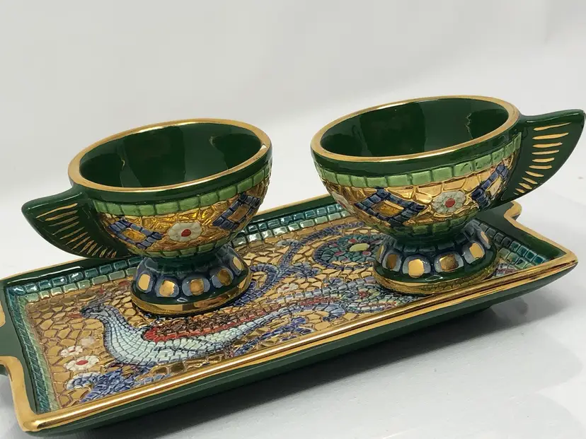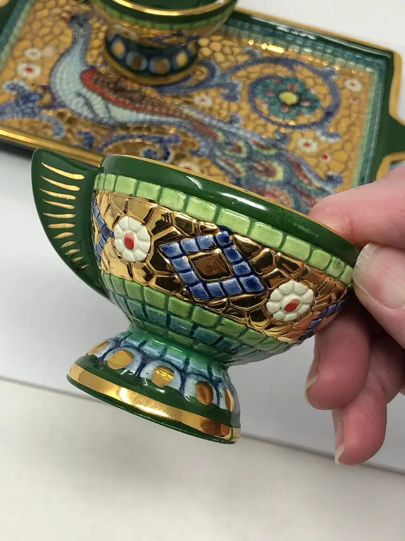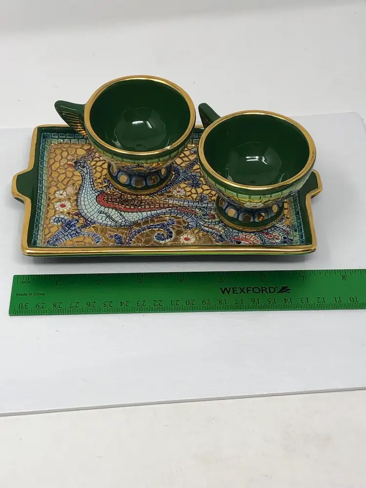 4 1/2" x 7" 'square' saucer with pair of tiny cups hand painted in the Oro Zecchino style with gold on etched ceramic. Design features an ornate peacock and florals. Original label and hand dated 9-97 Rome Italy. One small chip of paint on one cup otherwise fantastic condition.
