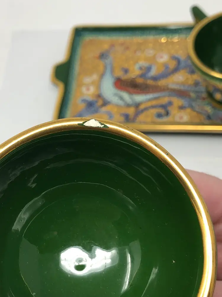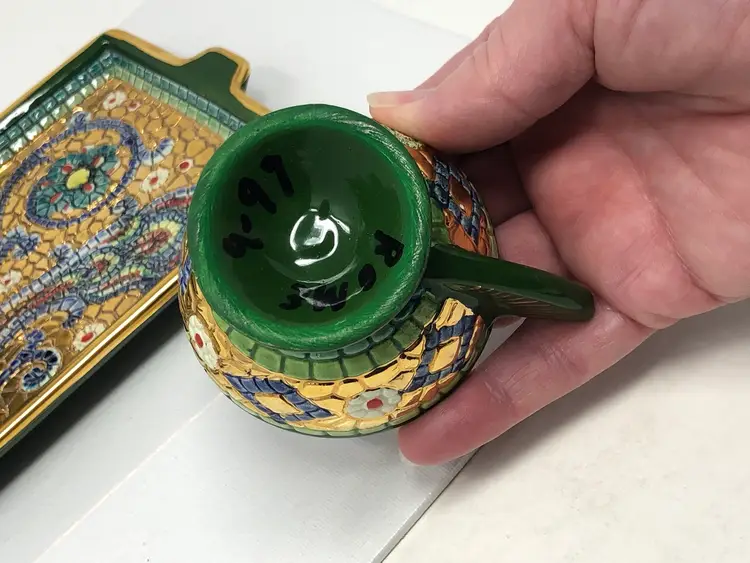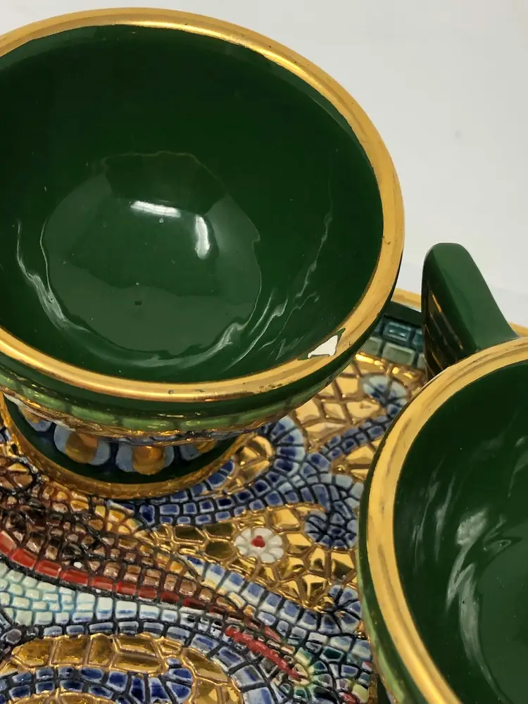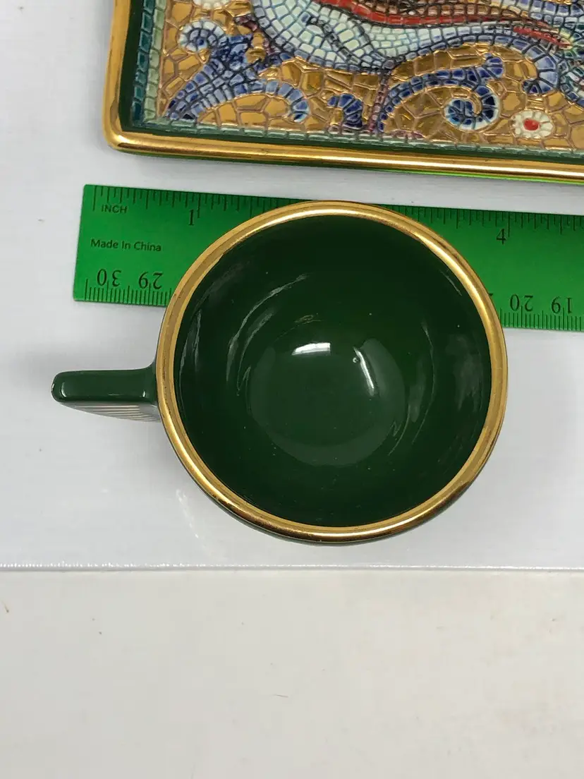 4 1/2" x 7" 'square' saucer with pair of tiny cups hand painted in the Oro Zecchino style with gold on etched ceramic. Design features an ornate peacock and florals. Original label and hand dated 9-97 Rome Italy. One small chip of paint on one cup otherwise fantastic condition.