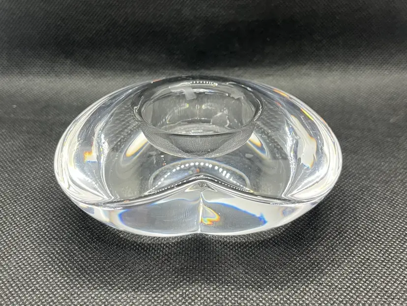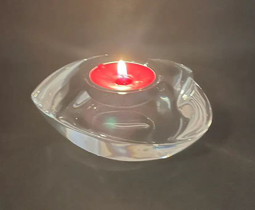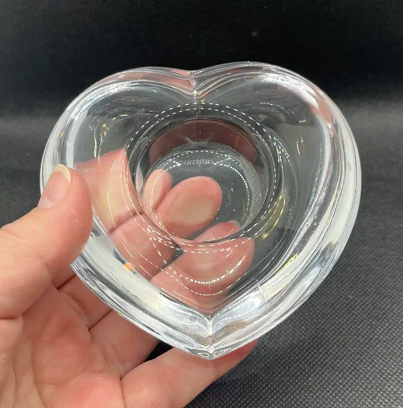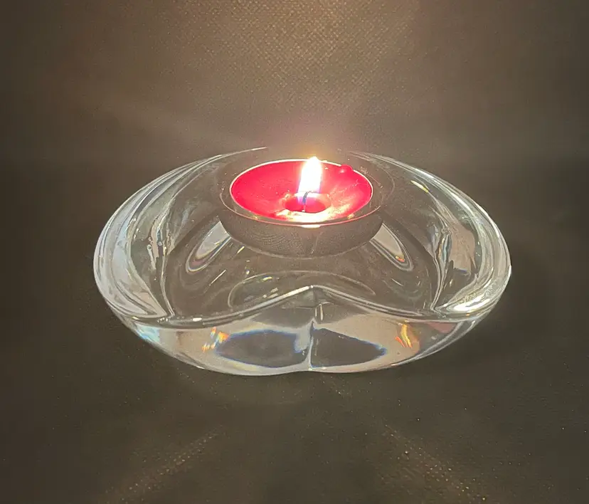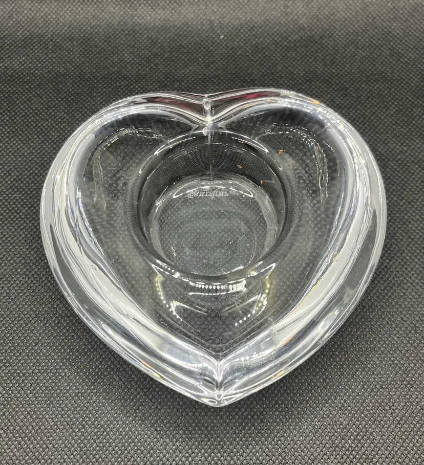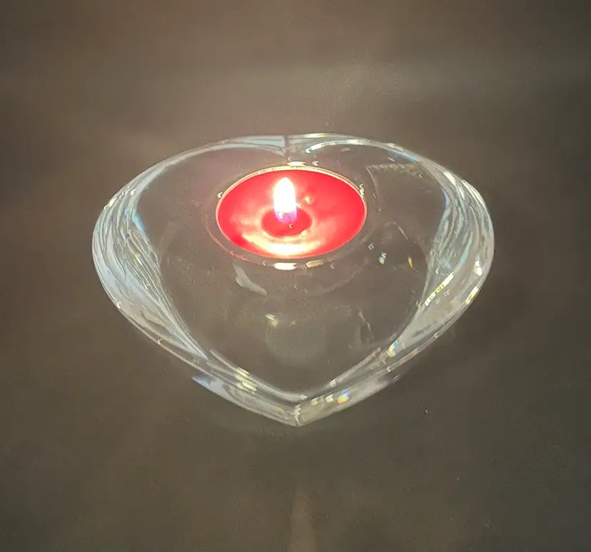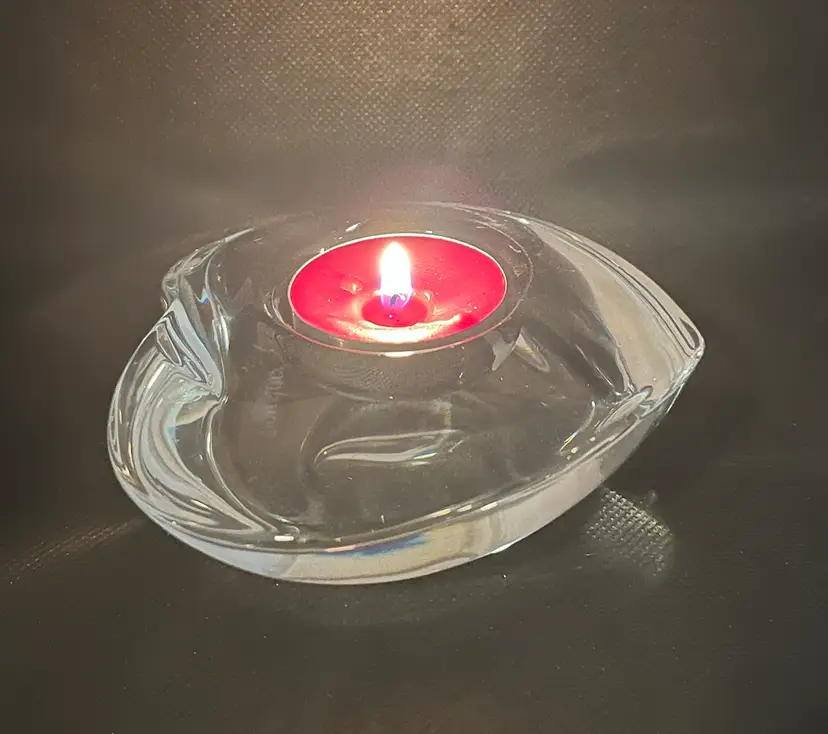 This item is an Orrefors crystal "Amour" heart-shaped votive candle holder, designed by Lars Hellsten in the 1980s.